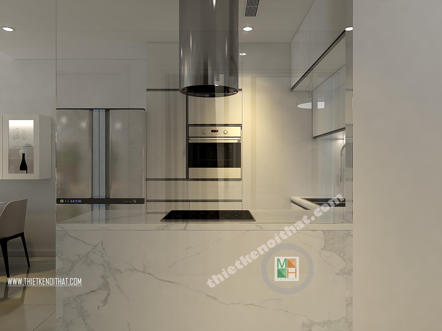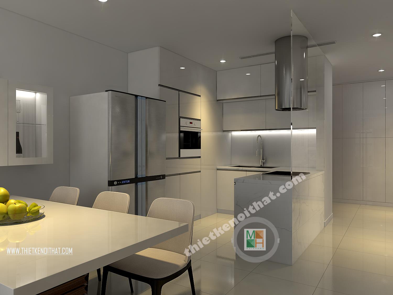 Thiết kế nội thất phòng ăn và bếp liền kề mang đến sự thuận tiện và thoải mái cho gia chủ. Không gian thiết kế bếp sử dụng tông màu bạc ánh kim làm chủ đạo mang đến sự phản chiếu nhẹ nhàng tạo cảm giác cơi nới và mở rộng không gian. Một điểm yếu có thể dễ dàng nhìn thấy ở thiết kế bếp chính là sự đơn điệu, tuy thiết kế này mang đến sự thuận tiện, vẻ hiện đại nhưng không gian lại khá nhàm chán, đơn sắc.