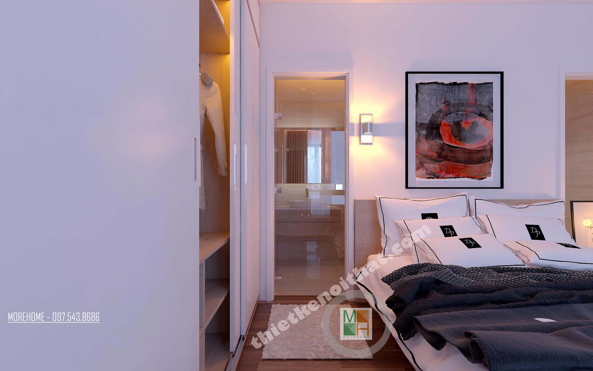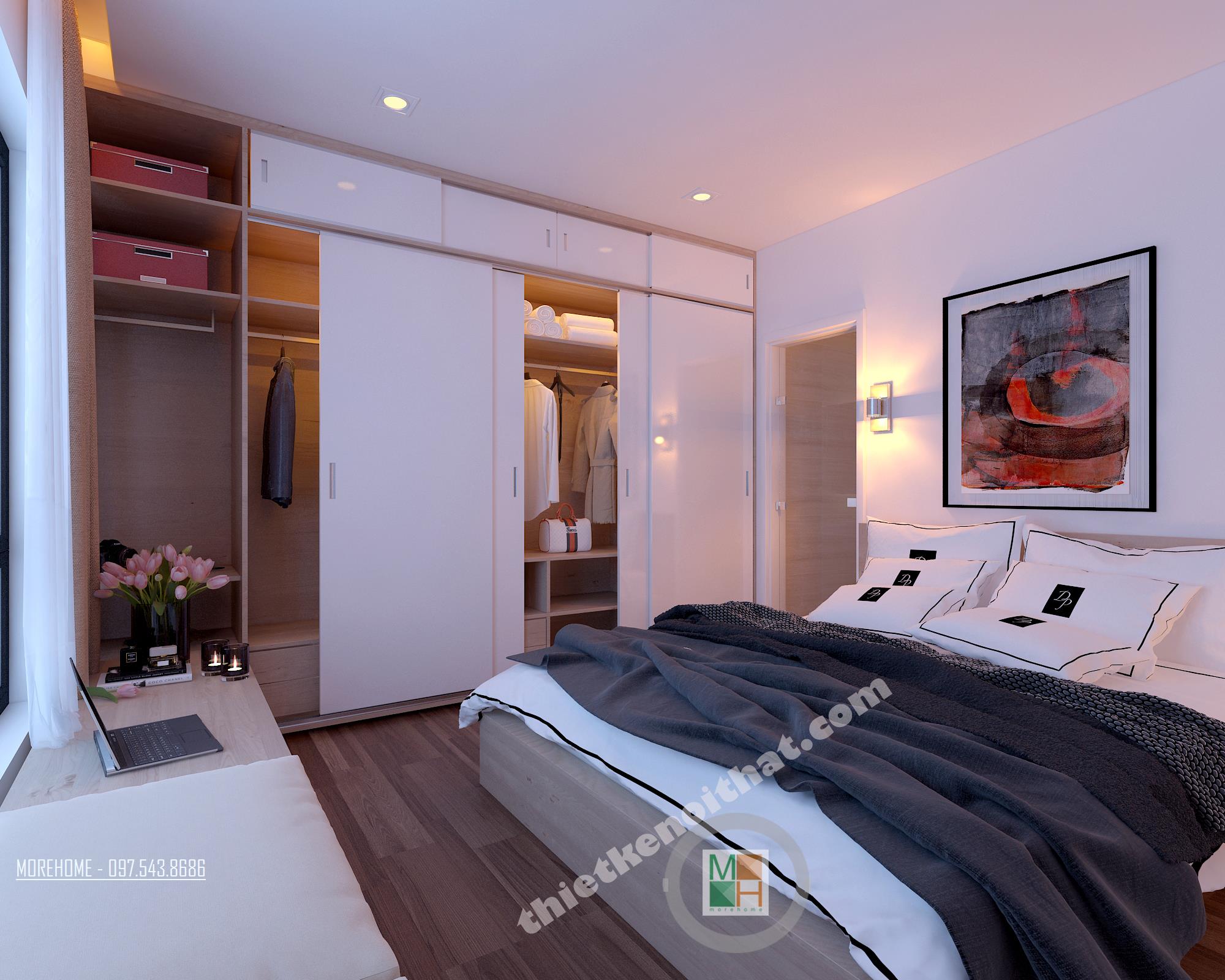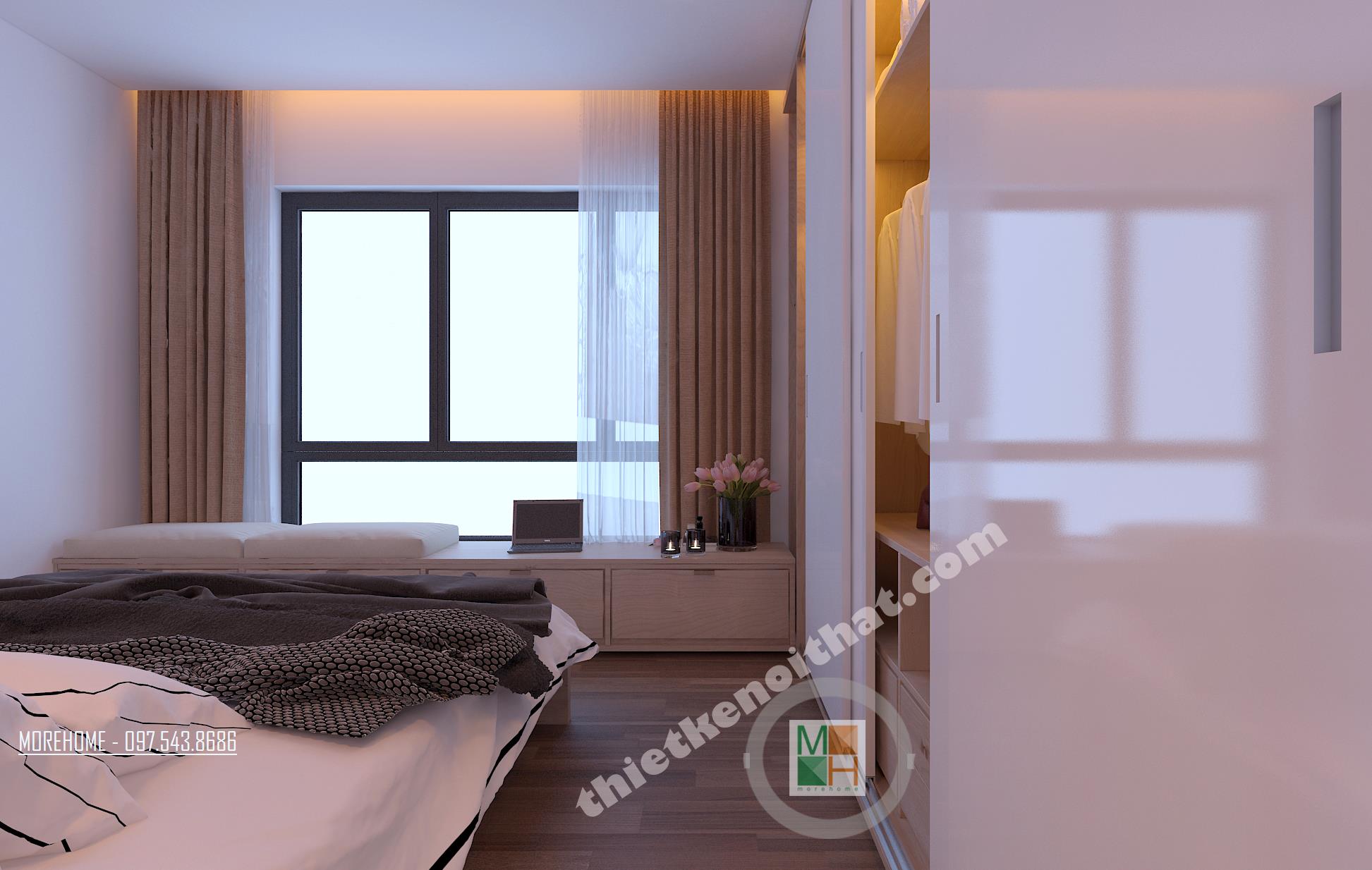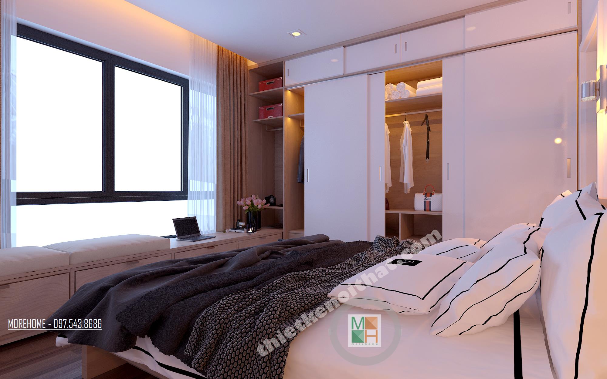 Cuối cùng là thiết kế nội thất phòng ngủ lớn hiện đại. Ánh sáng tự nhiên được tận dụng mang đến sức sống cho căn phòng. Thiết kế tủ đồng nhất gần như tạo thành tường mang lại cho gia chủ cảm giác gọn gàng mà vẫn không ảnh hưởng đến diện tích phòng. Thay vì đặt bàn ghế bên cửa số, kiến trúc sư đã sử dụng kệ ngồi kết hợp tủ đồ và bàn làm việc, thiết kế sáng tạo tận dụng ánh sáng tự nhiên, kết hợp nhiều vật dụng trong một giúp tăng tính công năng mà vẫn đảm bảo tiết kiệm không gian.