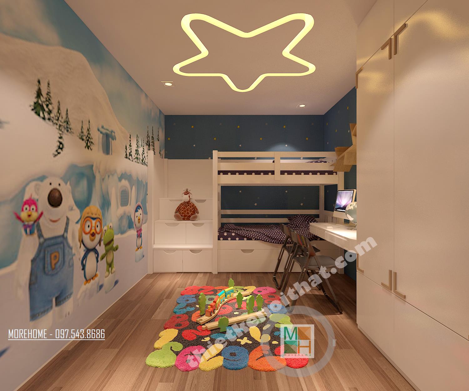 Thiết kế nội thất phòng ngủ cho trẻ sử dụng giấy dán tường với hình ảnh và màu sắc tinh nghịch giúp thúc đẩy sự sáng tạo và trí tò mò của trẻ. Tủ áo mang tông màu trắng tinh khôi với điểm xuyết trang trí nhẹ nhàng không quá cầu kỳ mà vẫn đảm bảo tính thẩm mỹ. Một trong những điểm thu hút của căn phòng chính là thiết kế giường tầng gọn gàng nằm sát tường, giúp tiết kiệm không gian, tạo nơi vui đùa cho trẻ. Kệ tủ kết hợp bậc thang lên giường tầng là sáng tạo hết sức thu hút sự tò mò của trẻ. Không chỉ vậy, thiết kế này còn góp phần rèn cho trẻ ý thức tự sắp xếp và cất giữ đồ đạc.