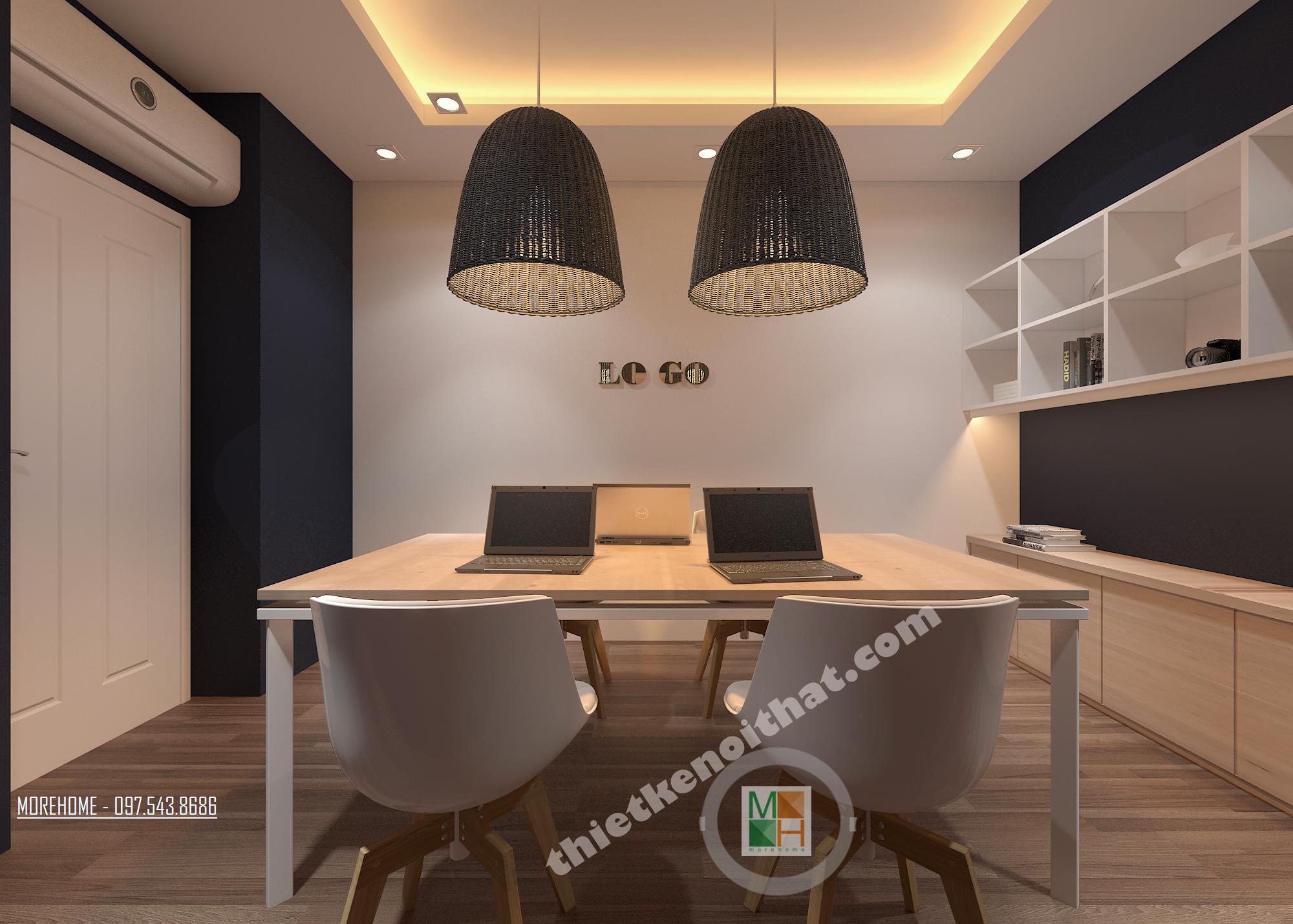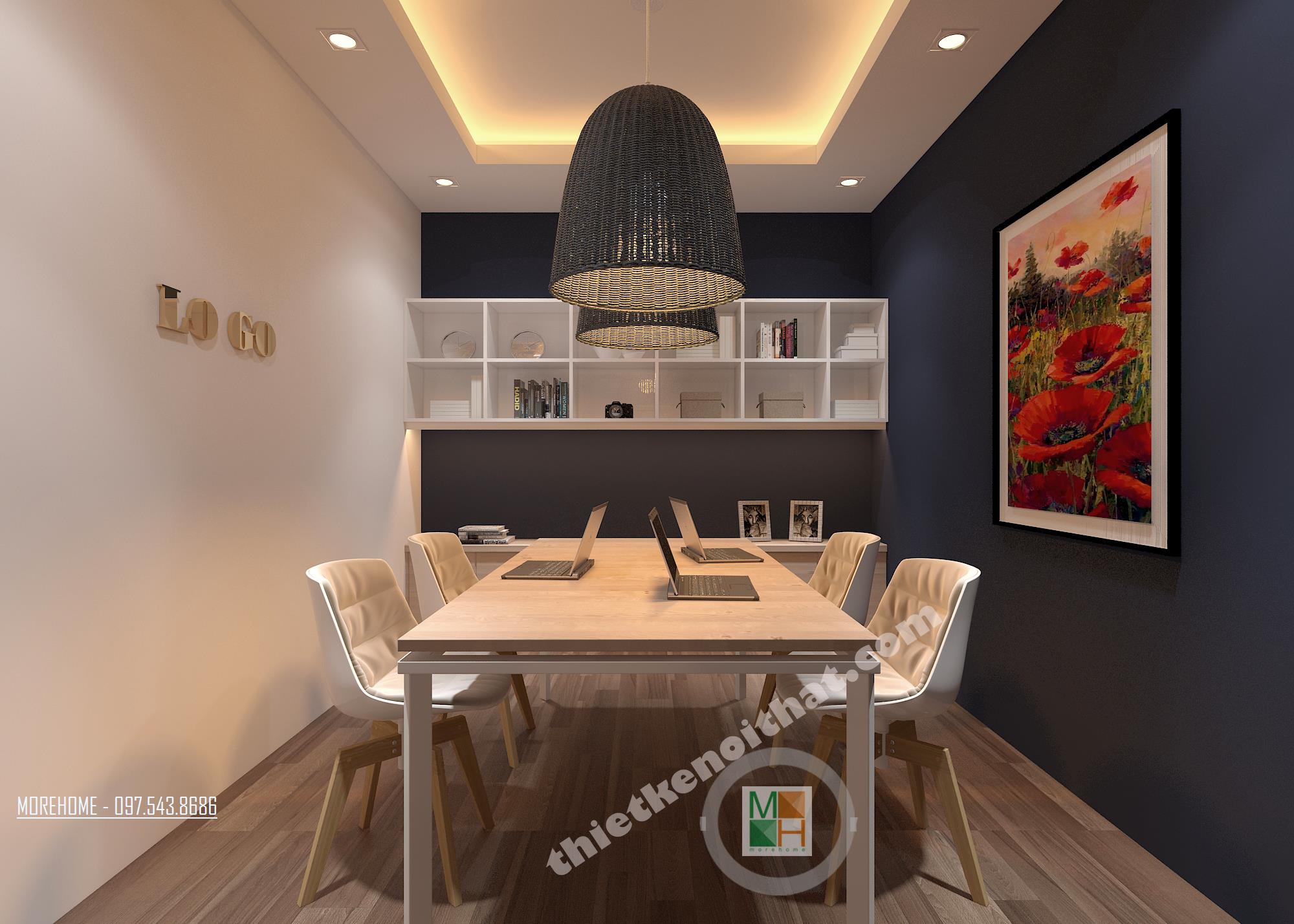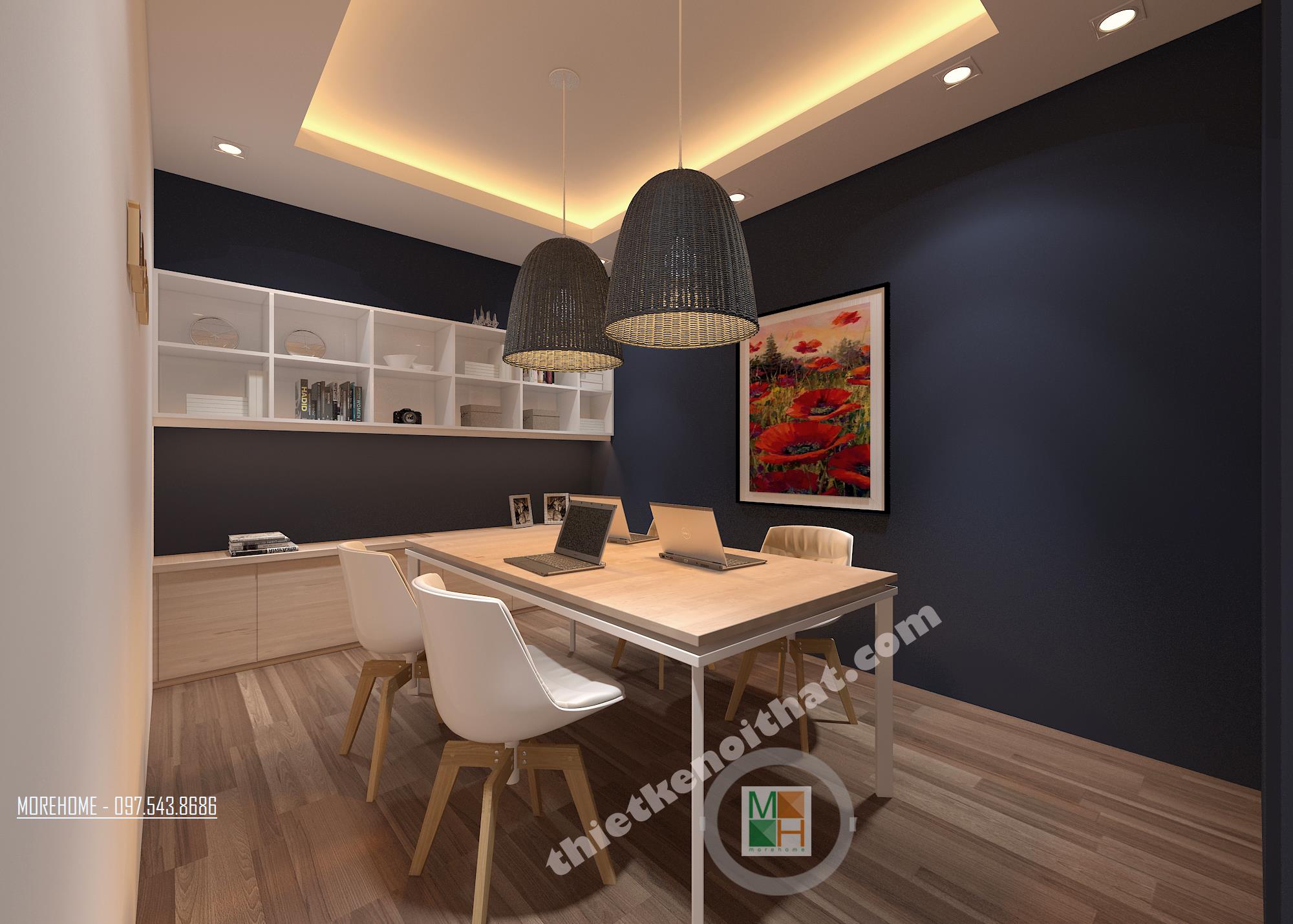 Một trong những không gian khá đặc biệt trong căn nhà chính là không gian làm việc của cả gia đình. Thiết kế đơn giản với một bộ bàn ghế tông màu sáng, đây thực sự là một không gian yên tĩnh cho các hoạt động giải trí và làm việc. Ánh sáng âm trần mang đến lượng ánh sáng vừa đủ tạo sự cân bằng và mang lại cảm giác ấm áp cho không gian. Bên cạnh đó, hệ thống tủ gỗ và ngăn kéo thiết kế hợp lý mang lại tiện ích cho gia chủ.