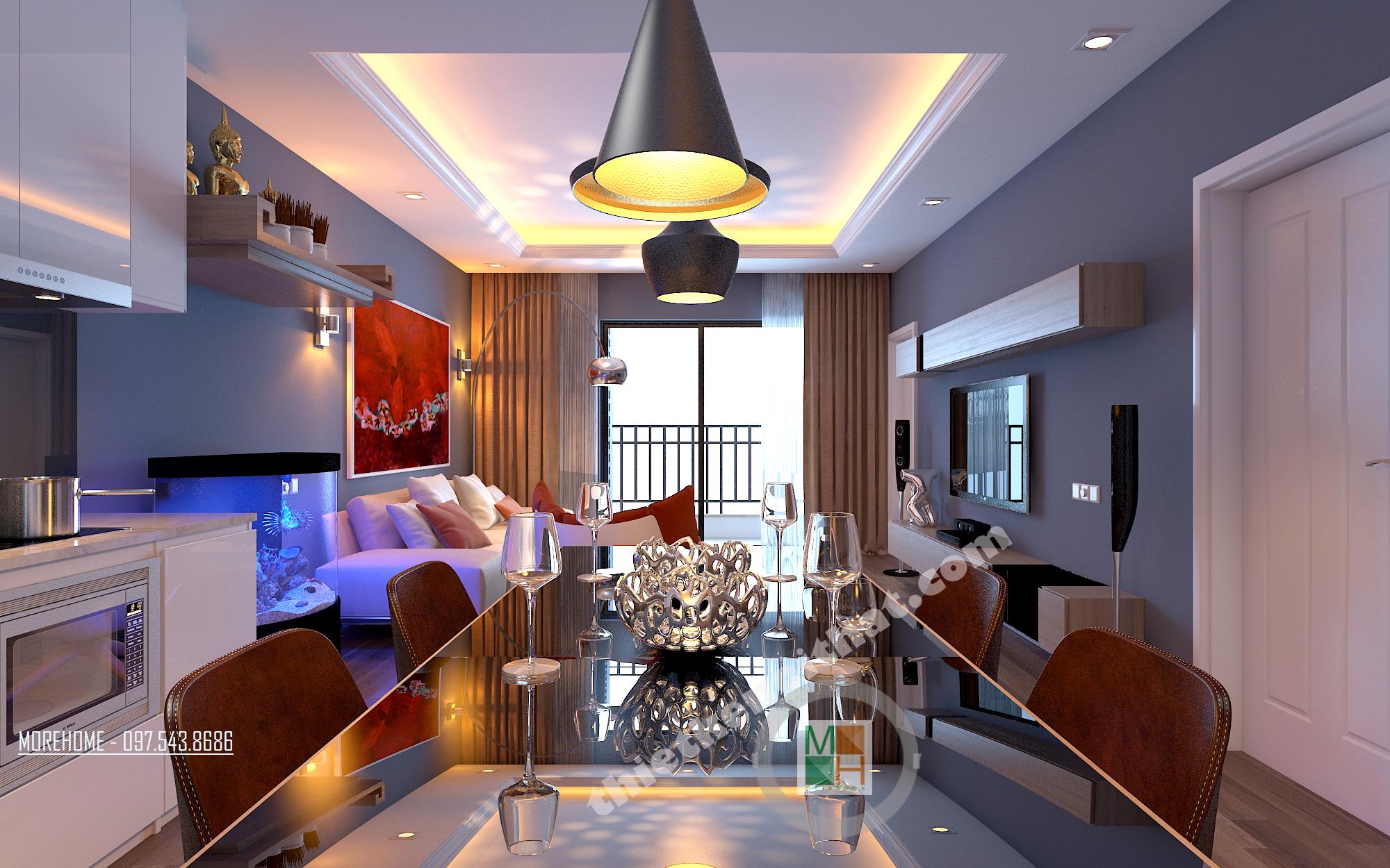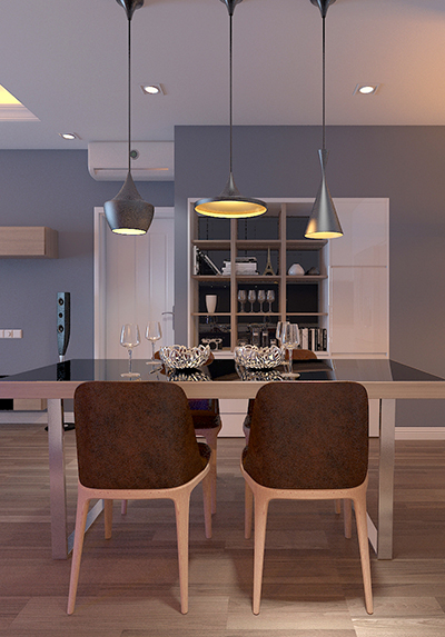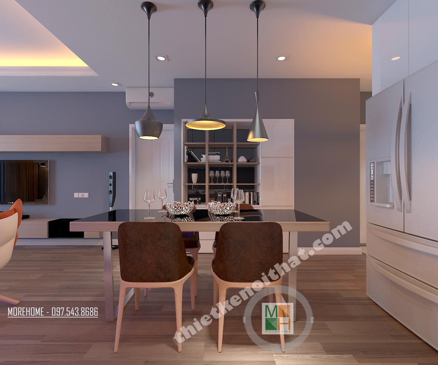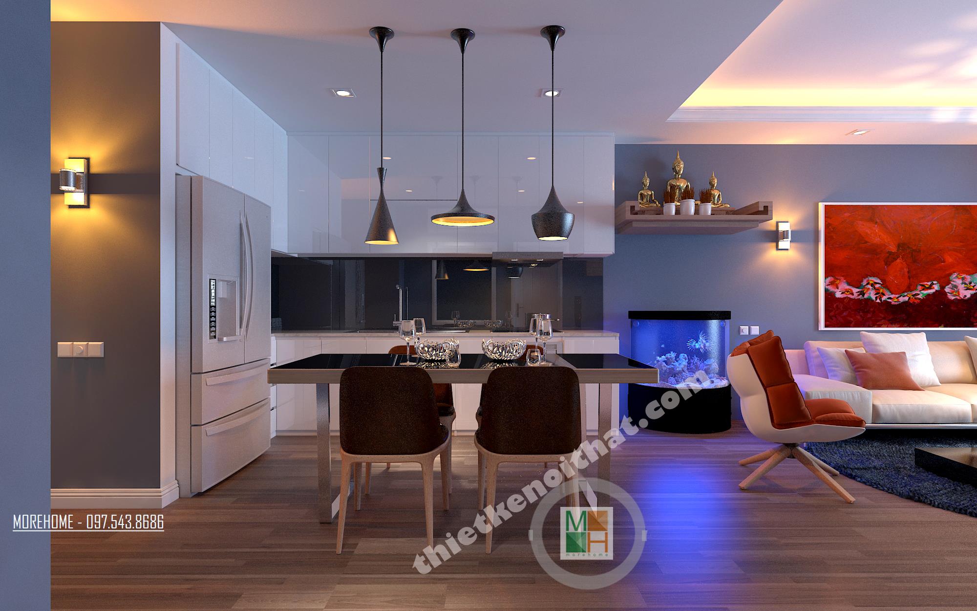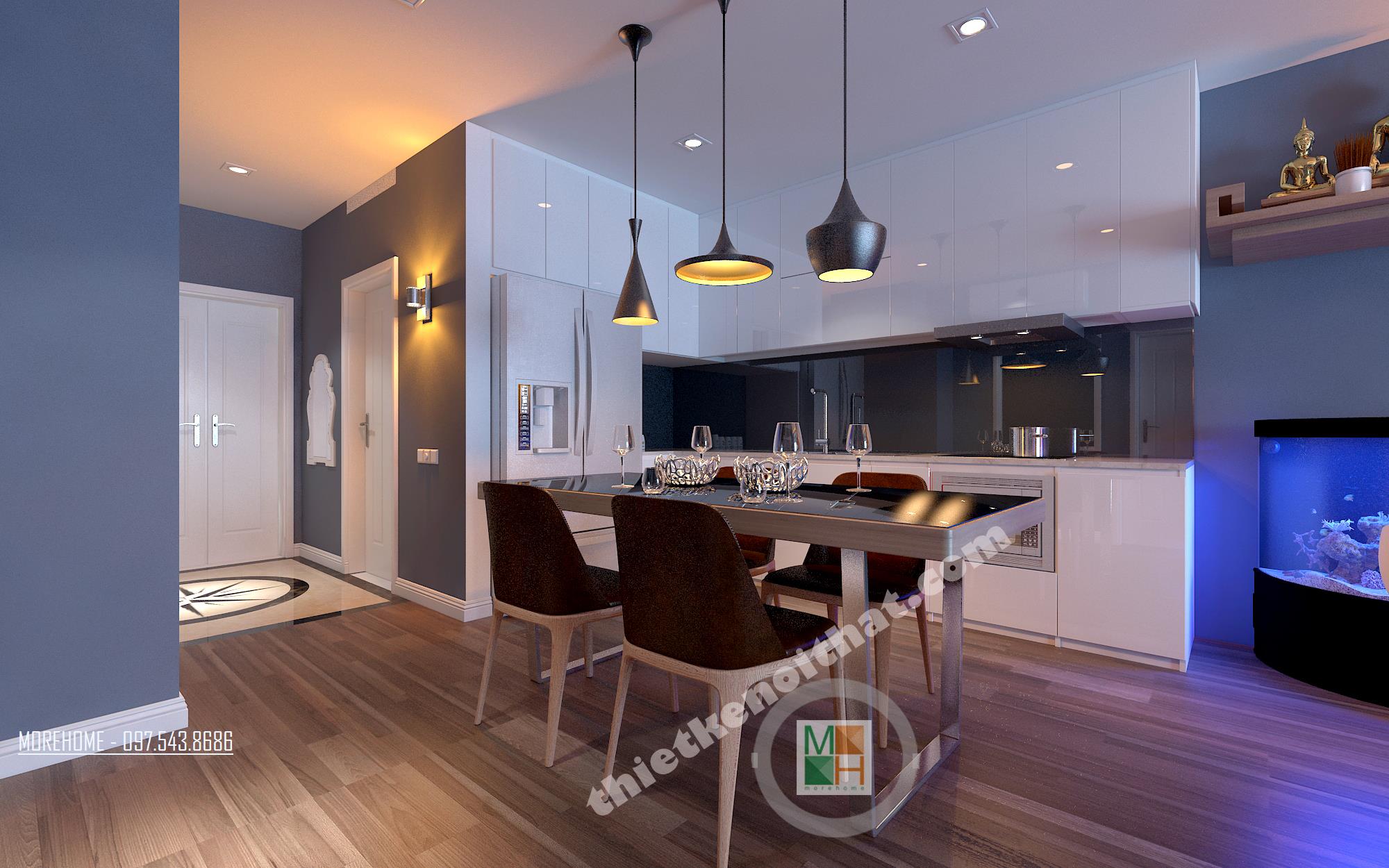 Điểm yếu về mặt hạn chế đã tác động đáng kể đến thiết kế của căn phòng. Tuy nhiên, những thay đổi phù hợp không những không làm ảnh hưởng đến tính thẩm mỹ của căn hộ mà còn tạo điểm nhấn về tính công năng, tạo độ thoáng cho căn phòng. Thiết kế nội thất bàn ăn và bếp liền kề, không hề có vách ngăn như các thiết kế nhà truyền thống, chính vì vậy mà không gian mở hơn, tạo khả năng bao quan toàn bộ không gian sinh hoạt chung. Thiết kế tủ bếp tông màu trắng sáng có độ bóng và tương phản nhất định mang đến cảm giác cơi nới, sạch sẽ cho căn phòng. Bàn ăn thiết kế đơn giản, tối giản hóa các họa tiết trang trí để tránh gây rườm rà và rối mắt. Ngoài ra, các thiết kế đèn tạo điểm nhấn sáng tạo cho căn phòng.