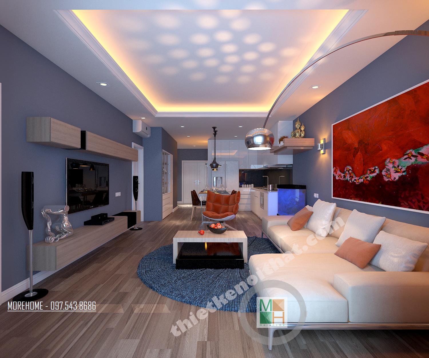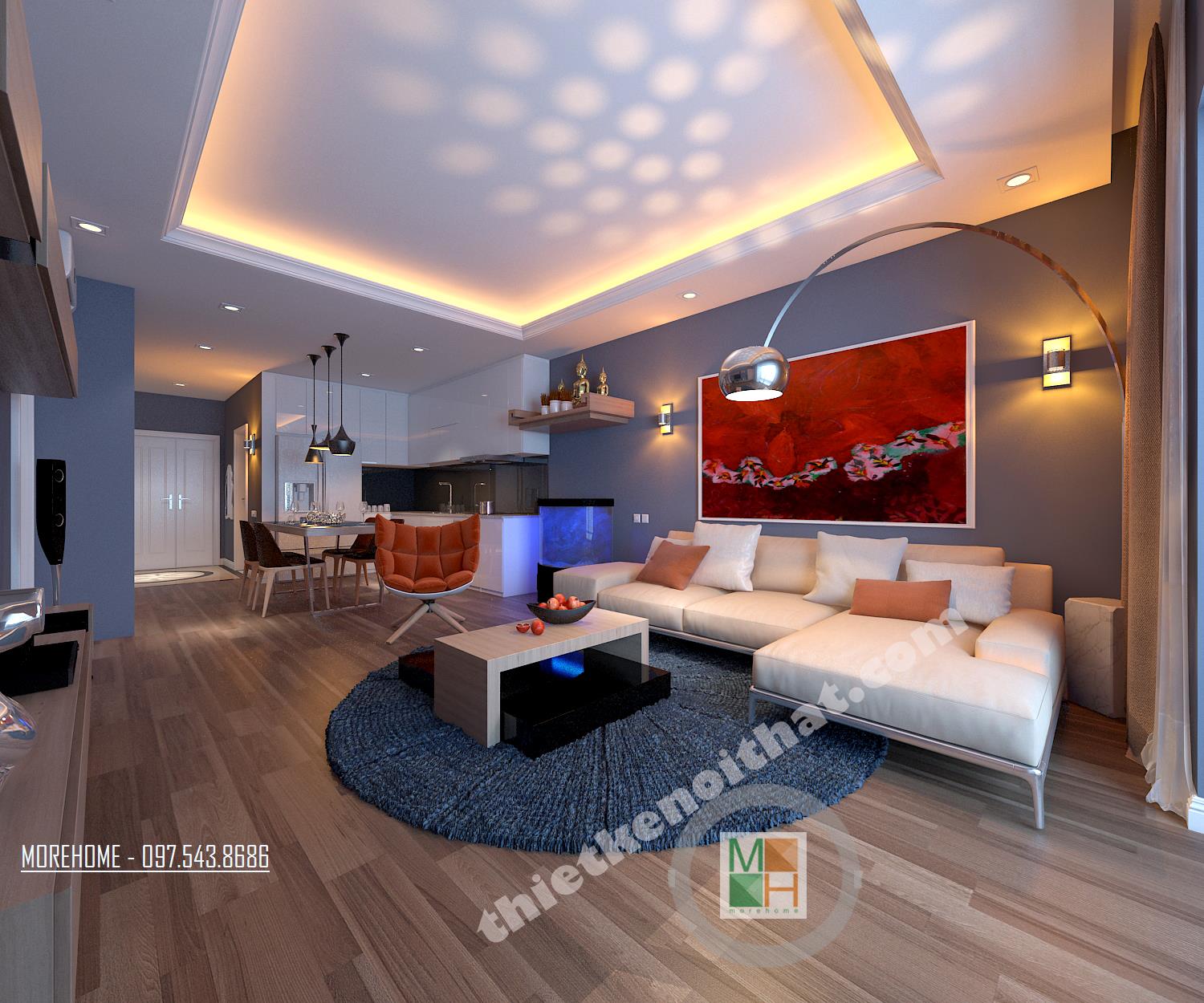 Thiết kế nội thất phòng khách lấy ánh sáng tự nhiên làm nổi bật không gian sinh hoạt chung và mang lại sức sống cho các thành viên trong gia đình. Thiết kế sofa đơn giản và có kích thước to bản gợi cảm giác vững chãi và an toàn. Thông thường, kệ ti vi sẽ chiếm một diện tích khá lớn làm ảnh hưởng đến sinh hoạt các các thành viên trong gia đình. Chính vì vậy, với một không gian hẹp như chung cư điều này lại càng bất tiện, kiến trúc sư đã khéo léo thiết kế tivi gọn gần như đồng nhất với tường, tủ kệ được tối giản hóa nhằm tạo độ thoáng cho không gian. Tuy nhiên vẫn giữ được sự tiện nghi trong căn nhà. Không gian sẽ khá đơn điệu nếu không có sự xuất hiện của bế cá cảnh hay bức tranh treo tường. Với thiết kế này, tính thẩm mỹ và hài hòa về màu sắc được tăng lên đáng kể thu hút sự chú ý của mọi người.