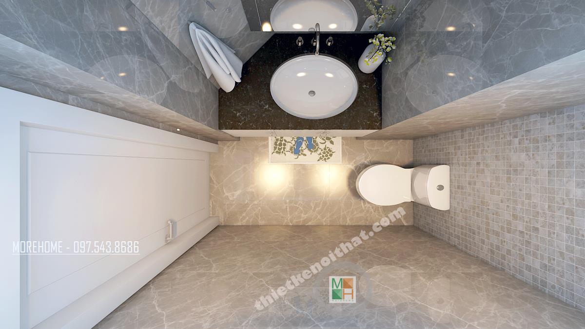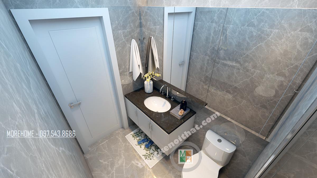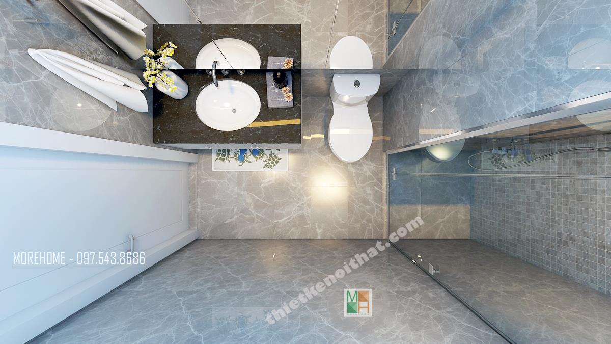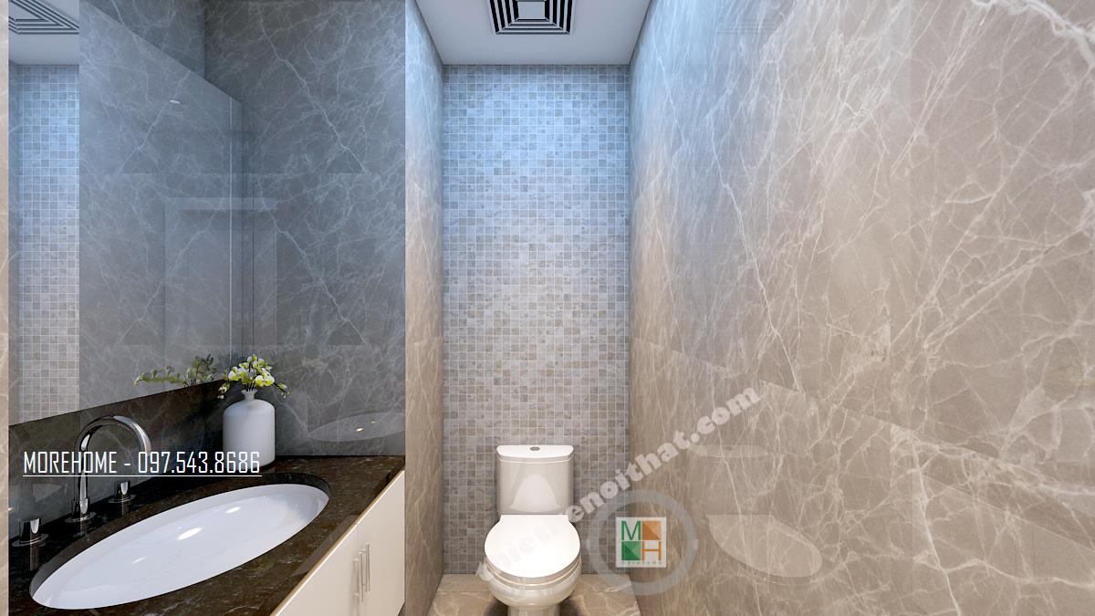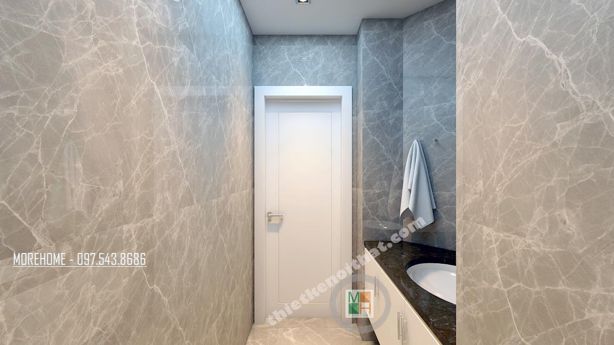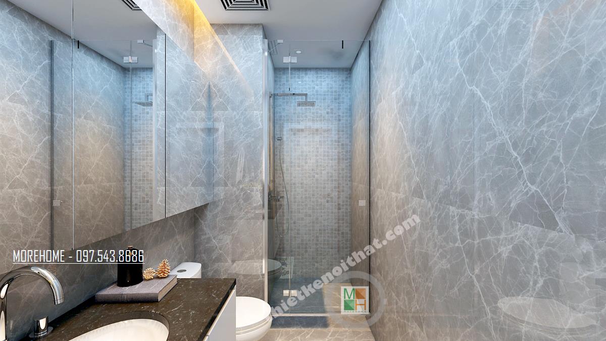 Buồng tắm lát đá cẩm thạch tạo cảm giác mát mẻ và thư thái cũng như mở rộng không gian cho căn phòng.