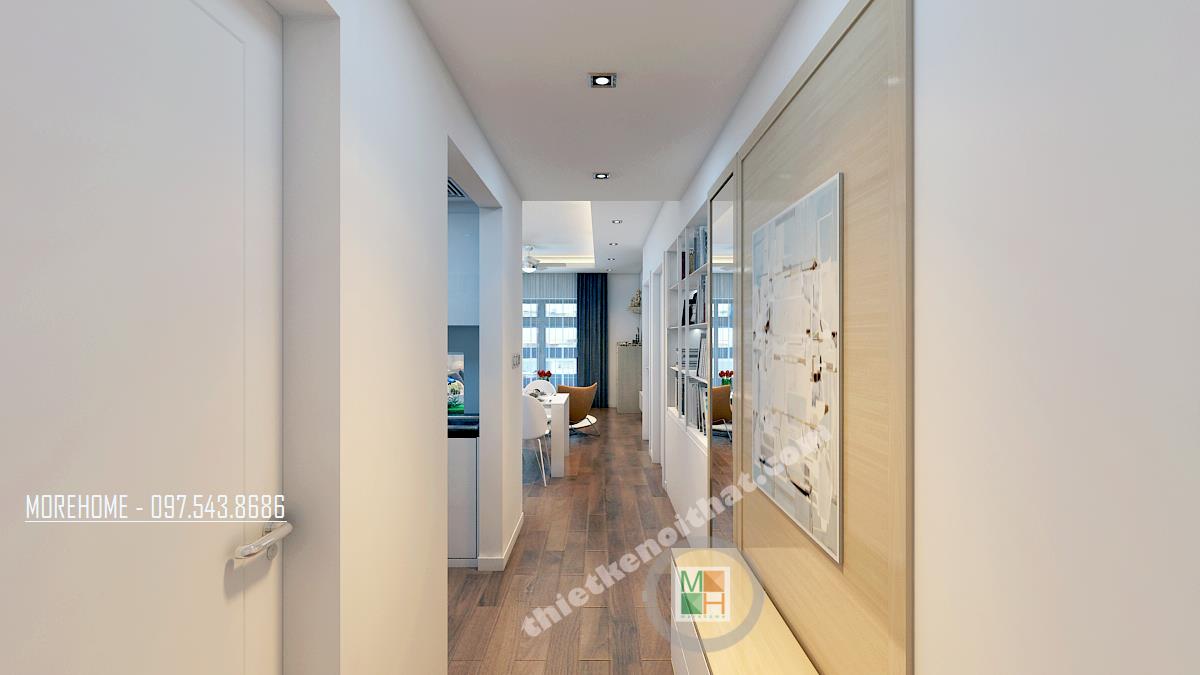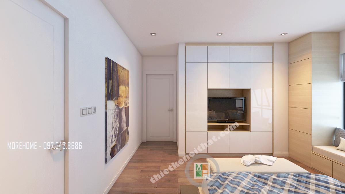 Cửa bước vào gian phòng ngủ được sơn đồng bộ với màu tường là màu trắng giúp hòa lẫn vào không gian tạo cảm giác rộng rãi và thoáng đáng cho cả căn nhà.