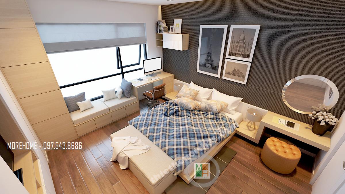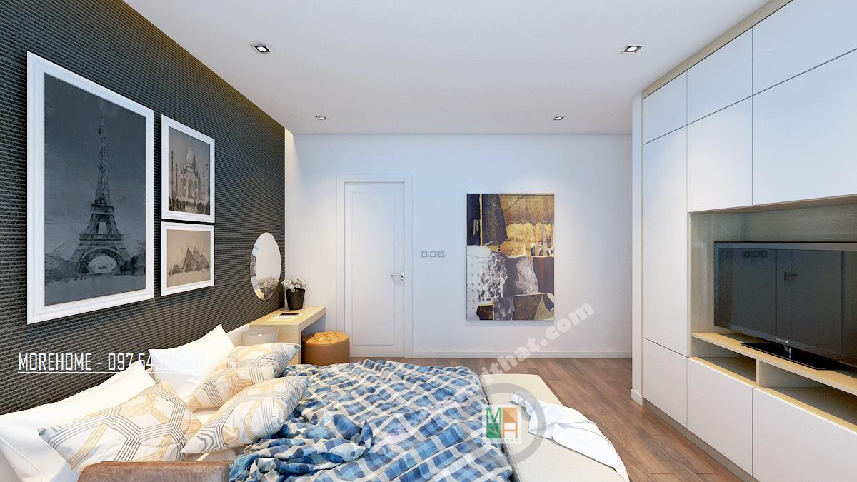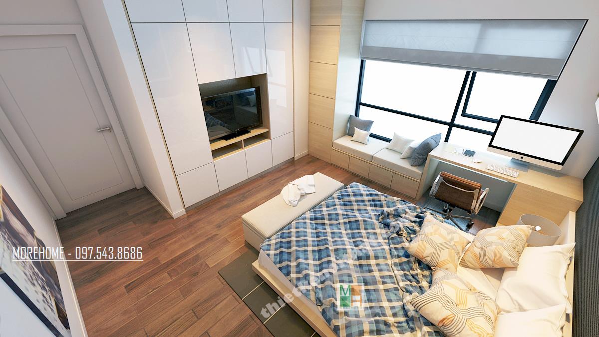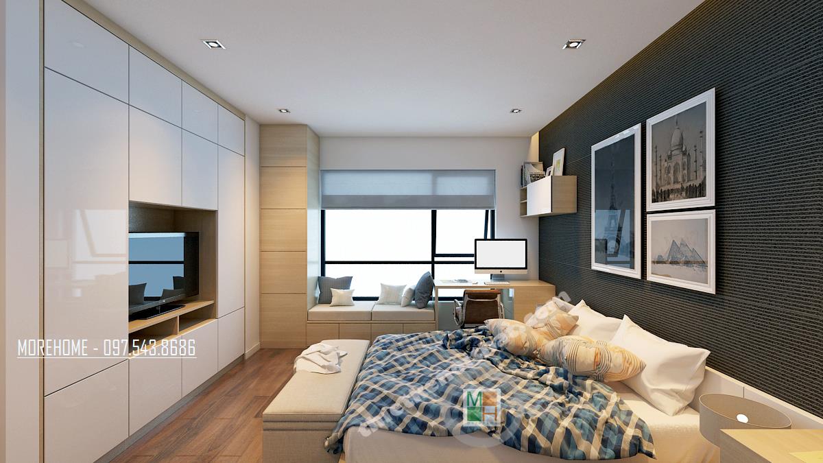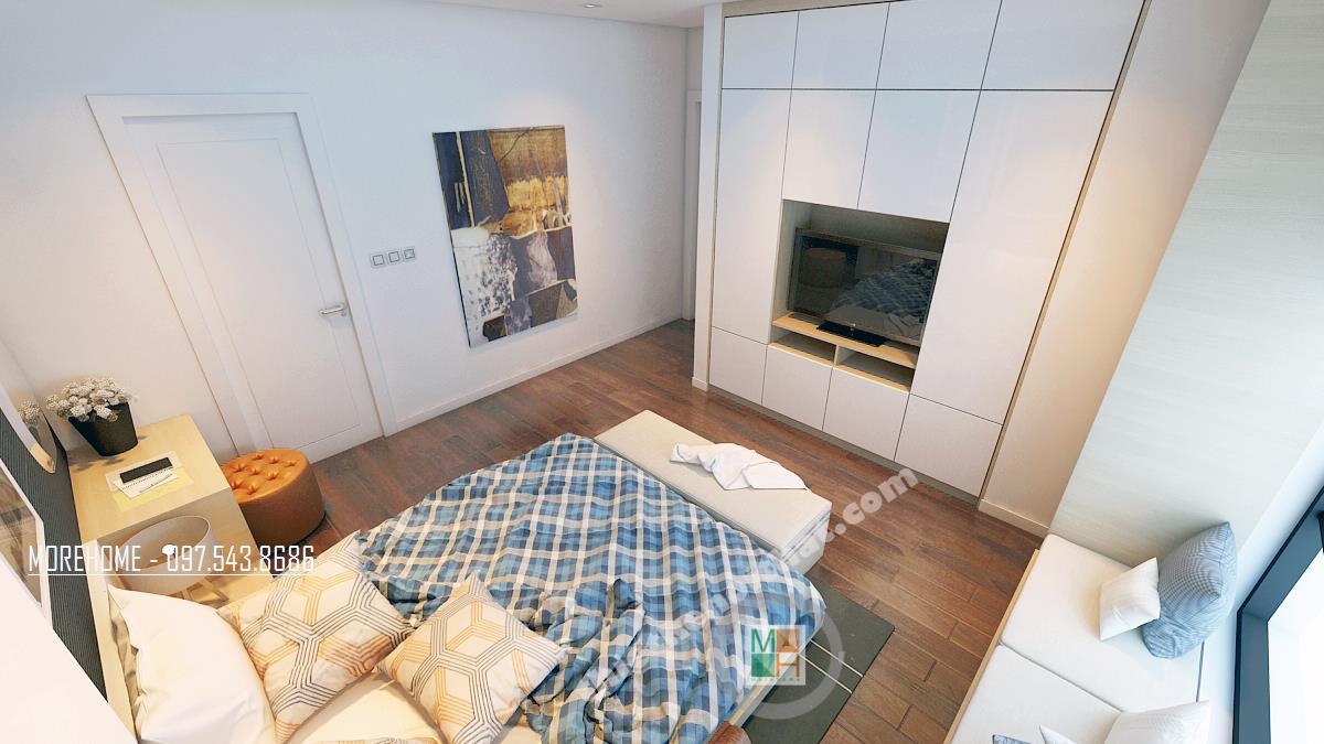 Bước vào phòng ngủ chính với tông màu đen ở mảng tường lớn đằng sau và nhẹ dần về phía trước giúp căn phòng mang màu sắc hiện đại và trang trọng. Cửa sổ lớn giúp gia chủ đón ánh sáng tự nhiên hòa vào căn phòng. Các chi tiết kệ để TV và tủ cũng như ghế sofa cũng được lồng ghép khéo léo vào bức tường giúp tiết kiệm không gian và hiện đại hơn.