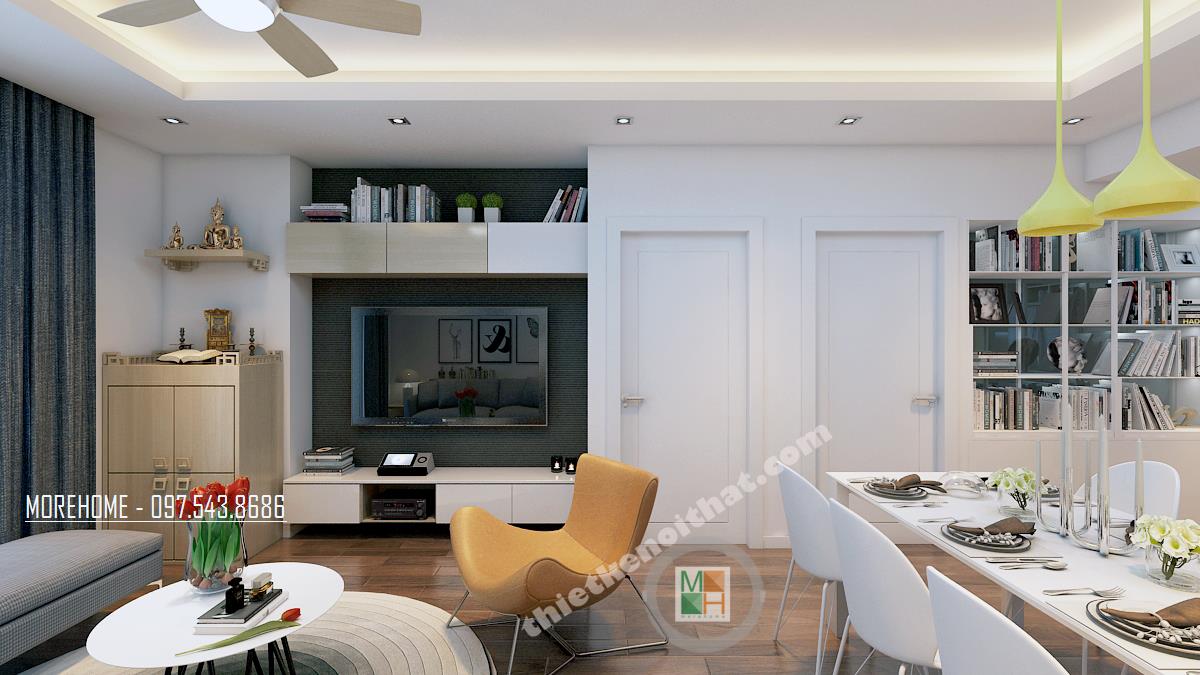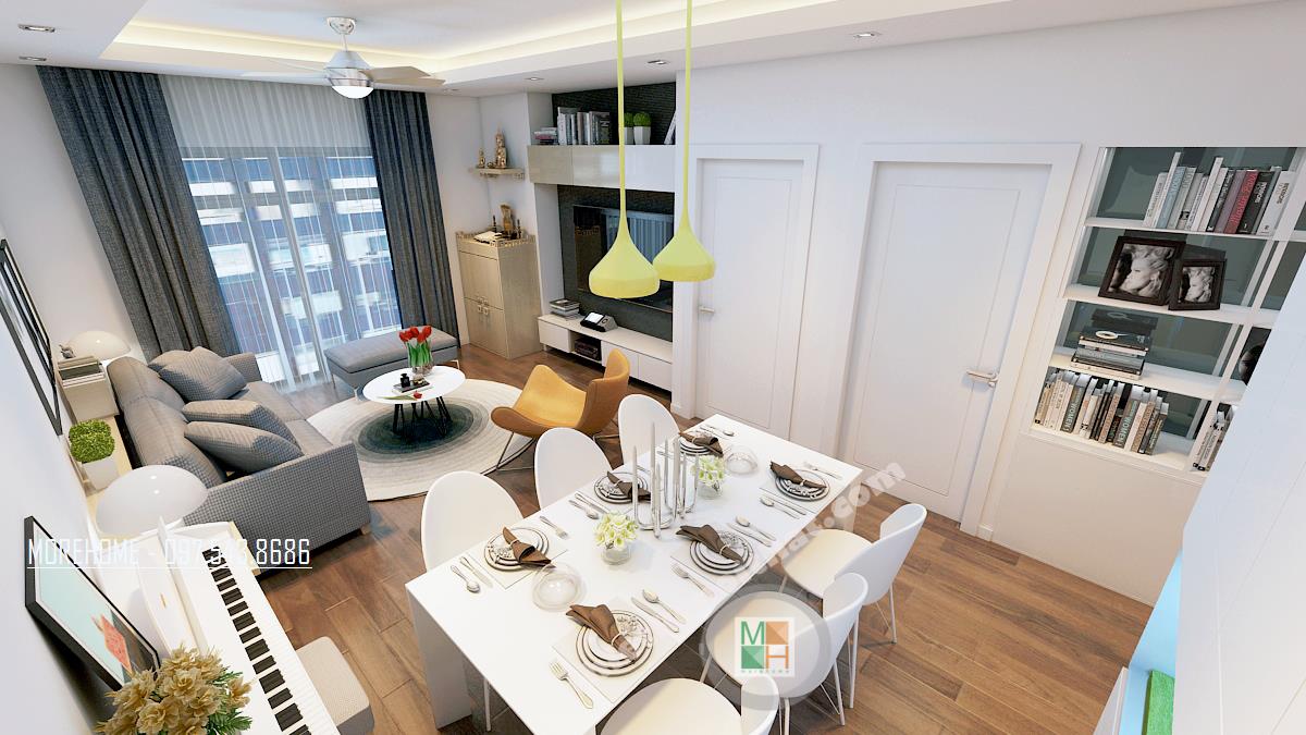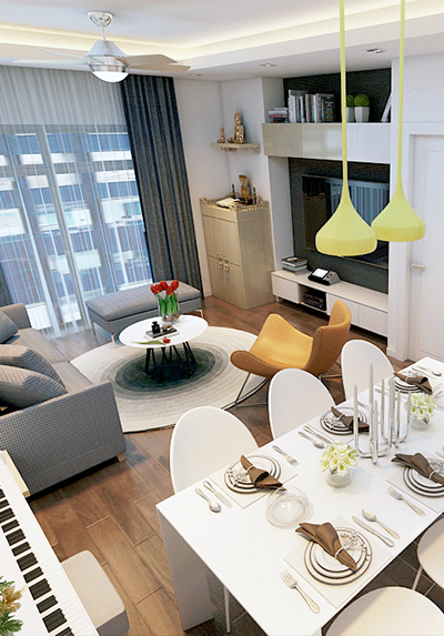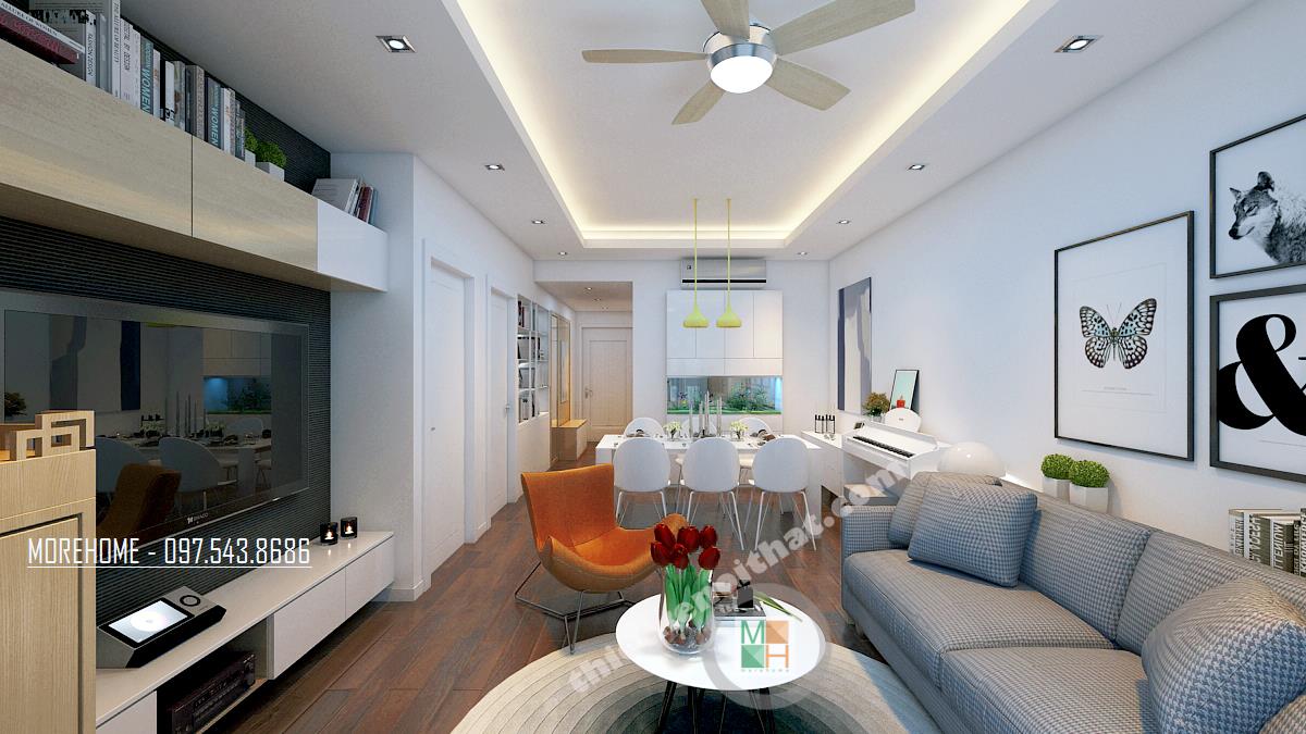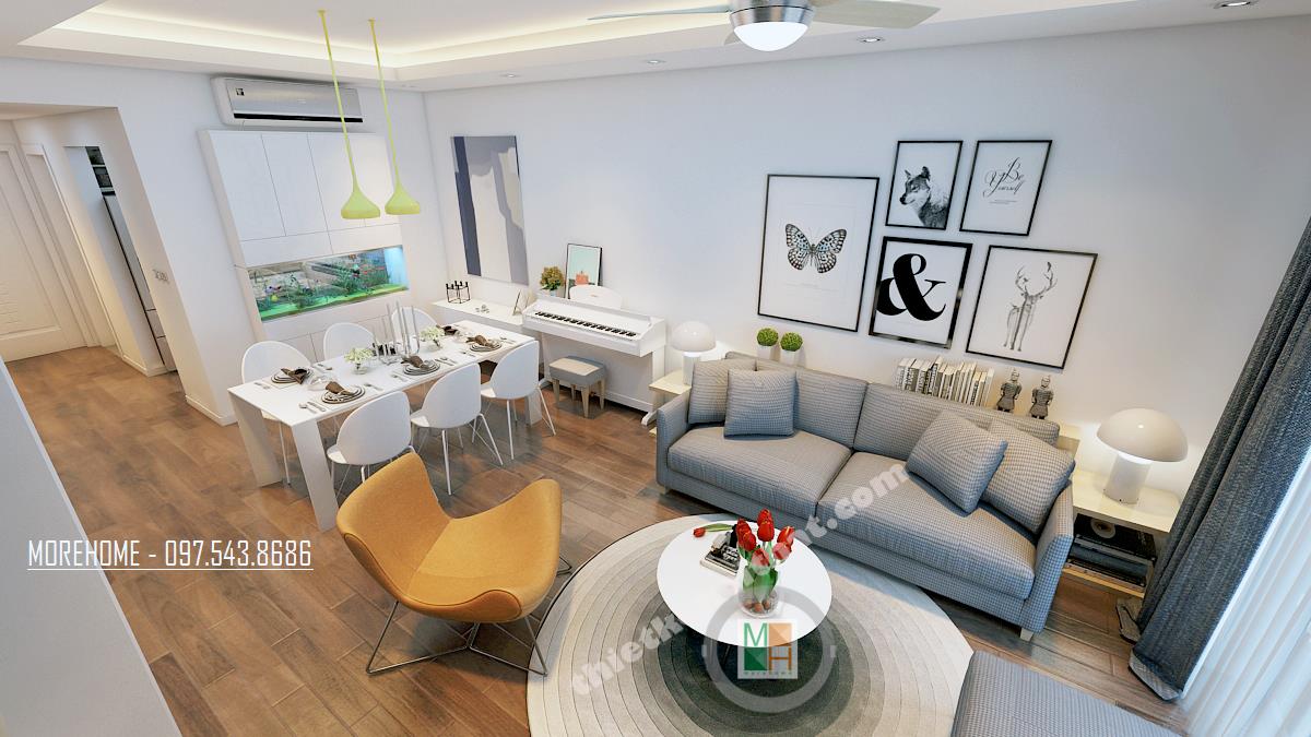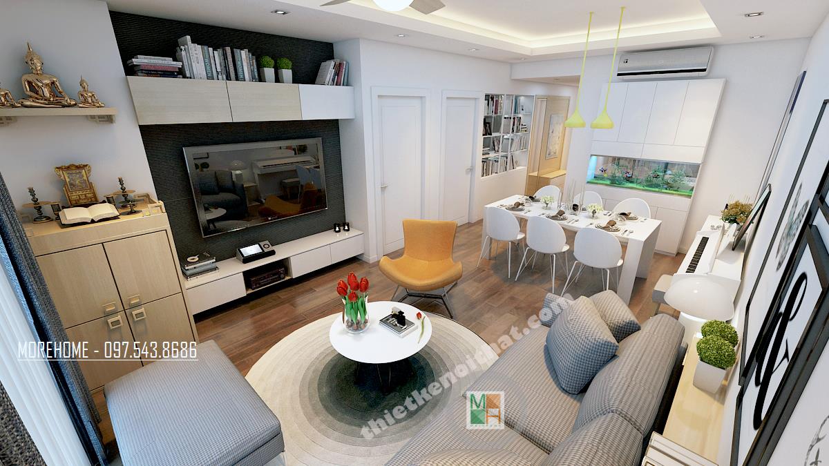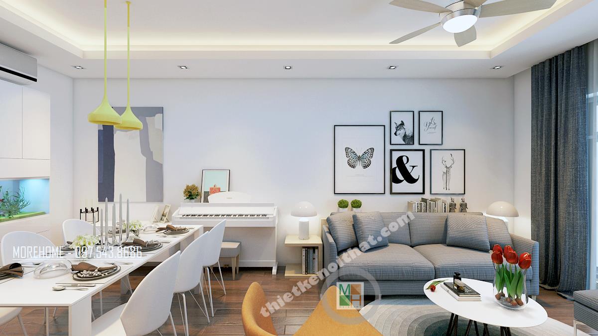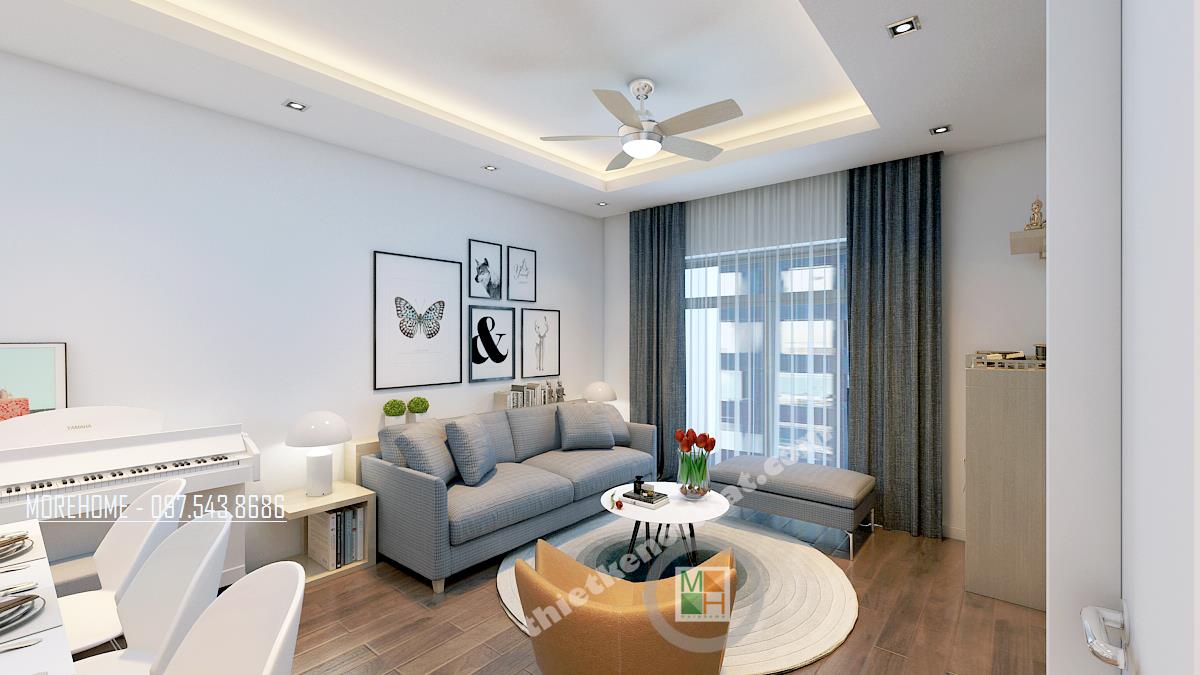 Thiết kế nội thất phòng khách hiện đại sử dụng tông màu ghi xám kết hợp hài hòa với tông màu nền trắng giúp khắc phục hạn chế về mặt diên tích cho căn nhà. Với các căn nhà chung cư nhỏ, hẹp việc cơi nới không gian hay cải tạo khá khó khăn thì việc sử dụng các vật liệu nhẹ, màu sắc sáng hay nhấn mạnh vào ánh sáng trong thiết ké lại là những biện pháp tối ưu giúp tạo độ mở và độ thoáng cho căn nhà. Thiết kế phòng khách đặt với khung cửa rộng hướng sáng mang ánh sáng tự nhiên vào căn phòng tạo độ gần gũi và thoải mái cho không gian. Để tăng màu sắc và tránh nhàm chán cho căn phòng, kiến trúc sư đã khéo léo sử dụng những vật trang trí nhỏ như chậu cây, tranh ảnh hay kệ đồ với thiết kế cách tân sáng tạo vừa đảm bảo tính thẩm mỹ mà lại tăng tính công năng cho căn phòng.