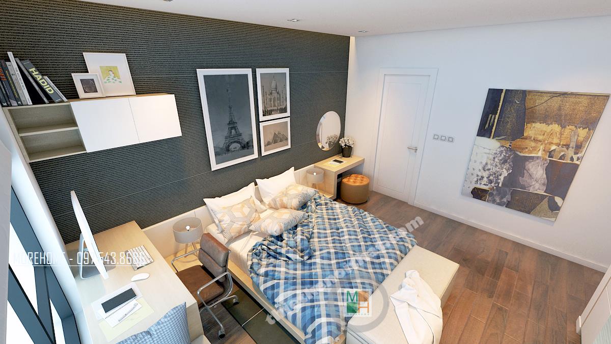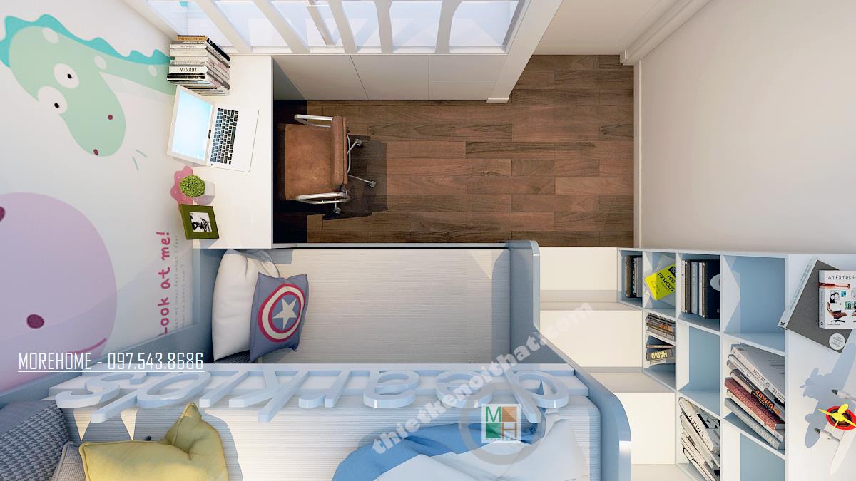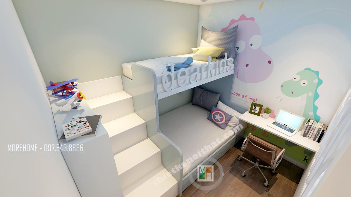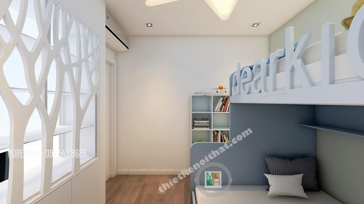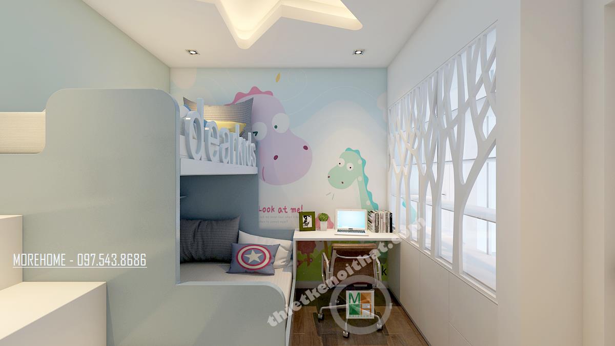 Gian phòng ngủ của con được thiết kế rất sáng tạo với những hình vẽ ấn tượng trên tường hòa cũng gam màu trắng và màu xám xanh nhạt tạo sự lạ lẫm và độc đáo, các chữ cũng là một sáng tạo ấn tượng của căn phòng. Khung cửa sổ hình cây tạo sự thư thái hòa với thiên nhiên và mở rộng không gian của căn phòng.