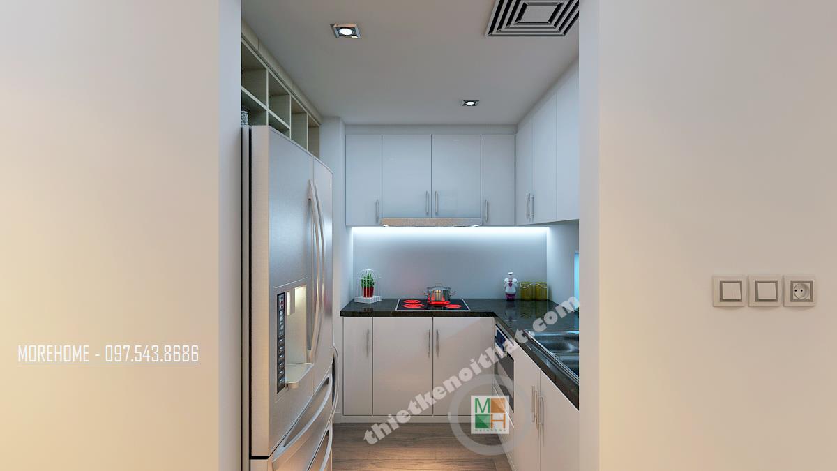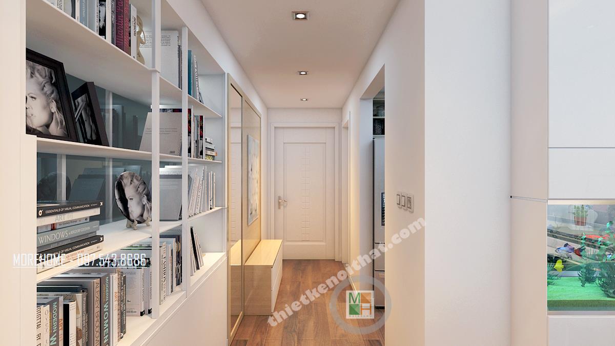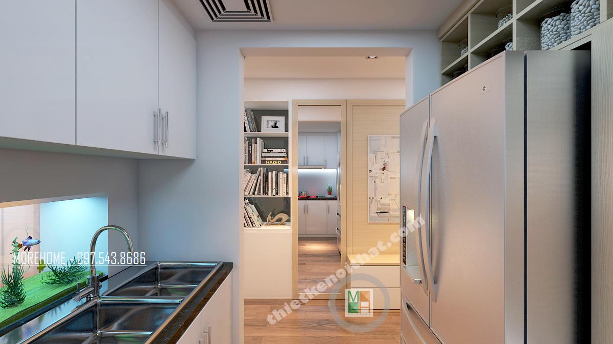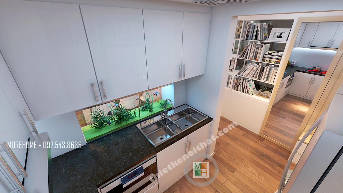 Thiết kế nội thất phòng bếp cũng là một điểm sáng của căn hộ khi tận dụng khoảng không gian nhỏ giữa cửa ra vào và khu phòng khách để quy hoạch thành một gian bếp nhỏ xinh mà đầy đủ tiện nghi cũng rất hiện đại. Một chi tiết cũng rất đáng lưu ý của căn bếp là bể cá cảnh ngay dưới ngăn tủ để đồ giúp gia chủ thoải mái thư thái hơn trong lúc nấu ăn cho gia đình thân yêu. Với điểm yếu về mặt diện tích, bạn nên tránh sử dụng các vật liệu thiết kế thô và nặng như tường gạch dày, cứng mà nên thay thế bằng các vật liệu nhẹ có cùng chức năng. Ở đây, tác giả đã sử dụng kệ tủ đứng nhiều ngăn để ngăn cách không gian, bên cạnh đó, thiết kế này còn khéo léo mở thêm không gian ở các kệ đồ làm tăng tính tiện ích cho căn nhà.