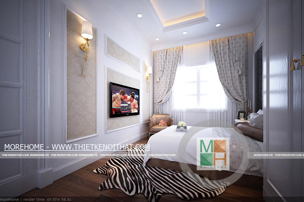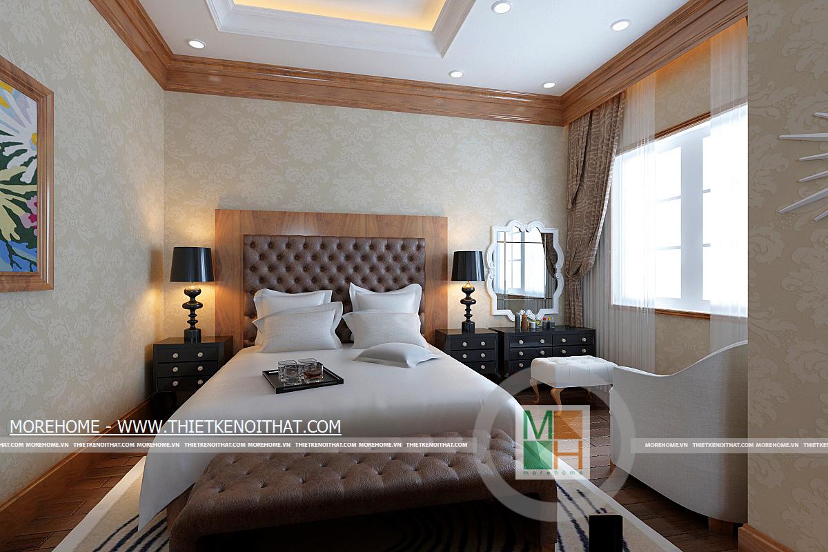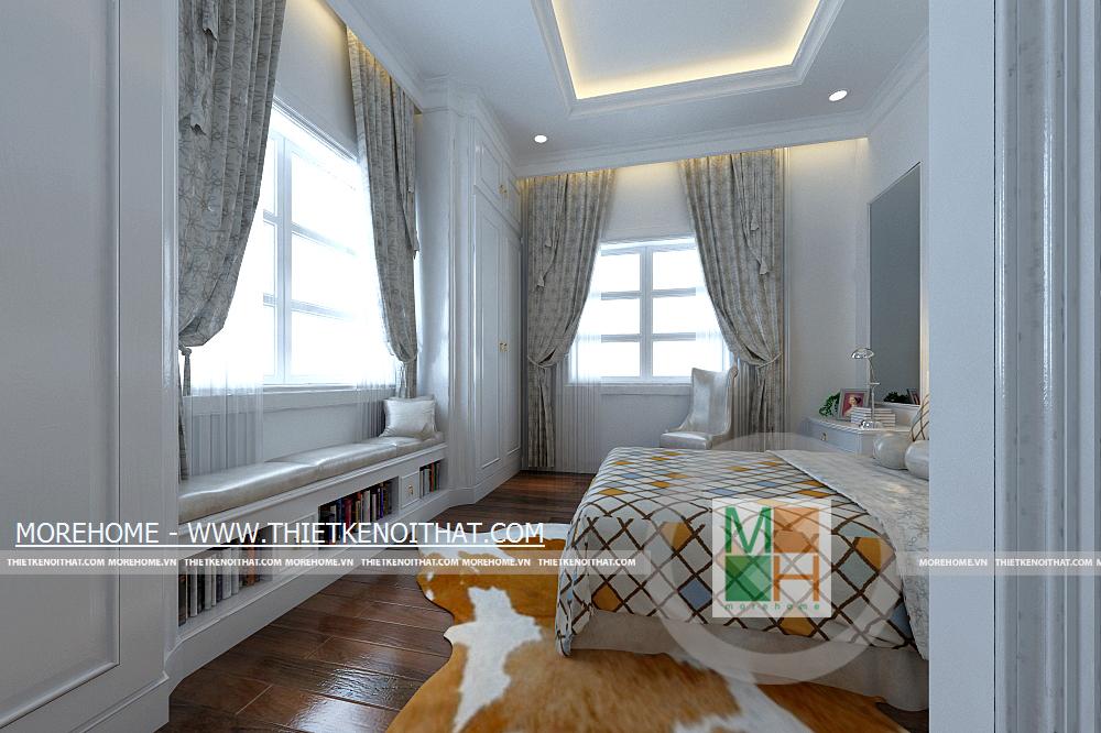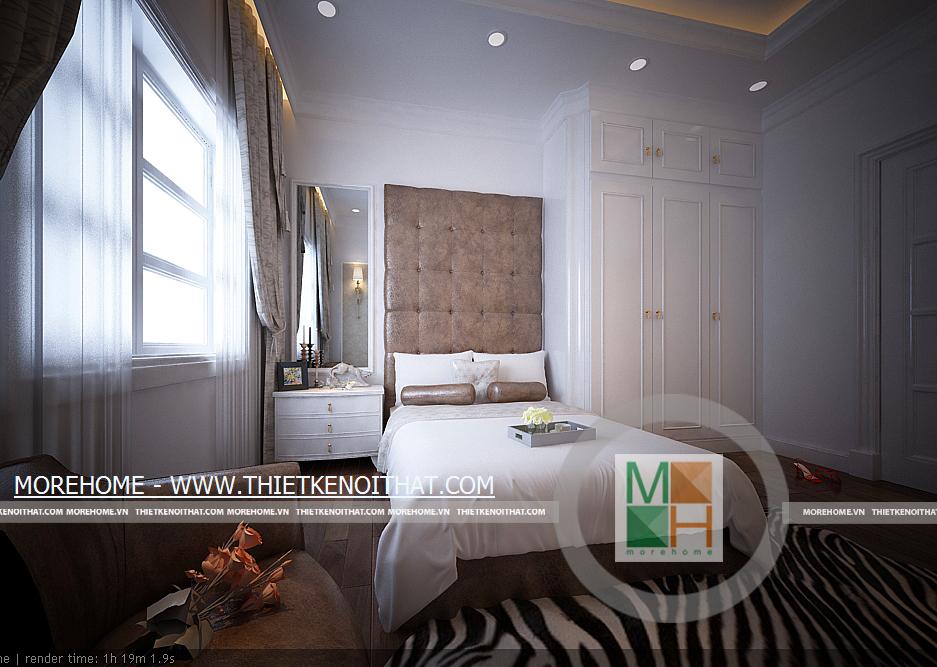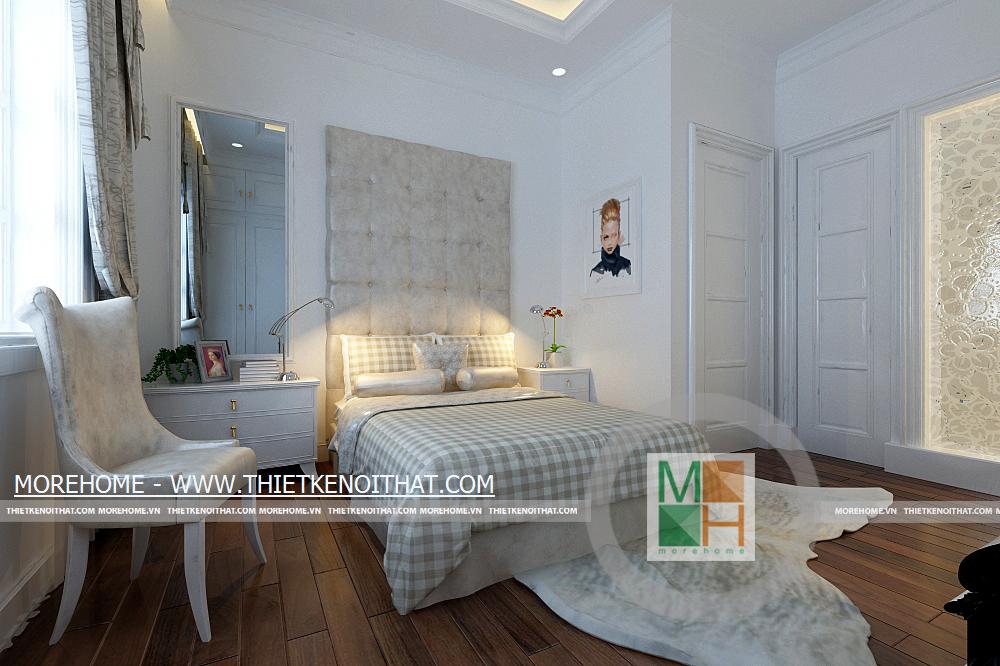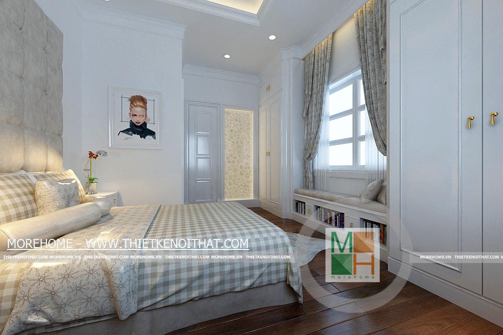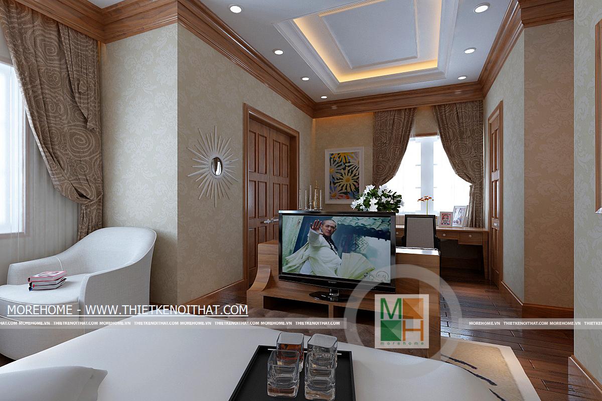 Phòng ngủ lớn của bố mẹ có diện tích khá lớn, kiến trúc sư đã rất thông minh trong xử lý không gian khi để một kệ tivi phù hợp với tầm nhìn , ngăn cách không gian từ cửa vào phòng ngủ. Chính tủ ngăn cách đó lại được kiến trúc sư sử dụng làm một bộ ghế sofa. Bàn làm việc được đặt cạnh cửa sổ, vừa tiết kiện diện tích, vừa tận dụng ánh sáng tự nhiên.