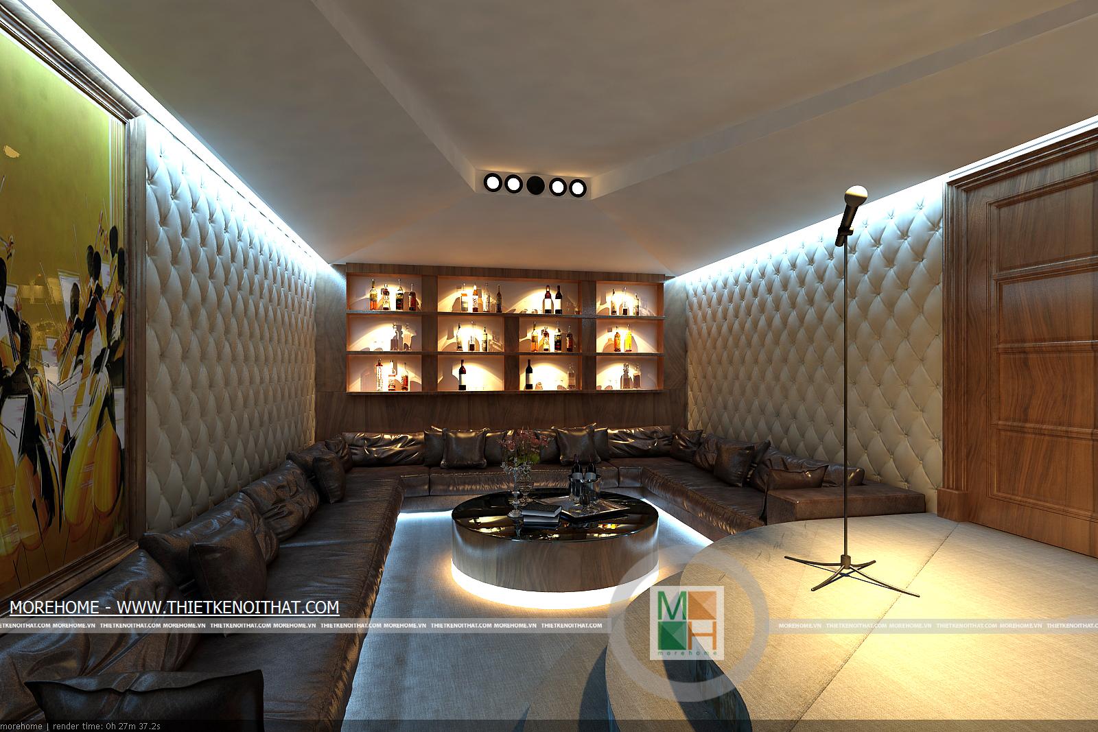 Phòng Karaoke đẳng cấp có thể được coi như niềm tự hào của chủ nhà. Căn phòng rộng rãi với màn hình tivi rộng, dàn âm than đầy đủ và một sân khấu biểu diễn nhỏ phía trên. Căn phòng được cách âm bởi những búi da hình quả trám màu trắng. Màu đen từ bộ sofa, từ bàn nước và màu gỗ tường trên sân khấu tạo tăng sự tập trung. Cùng với đó, một bức tranh kính đối diện với cửa ra vào, tạo sự chú ý ngay từ khi bước chân vào căn phòng. Ngoài ra, bức tranh cũng làm cho bức tường da đỡ trống. Căn phòng cũng có một tủ rượu lớn theo yêu cầu của chủ nhà, phục vụ cho những buổi tụ tập bạn bè, người thân. Tất cả những điều đó làm lên sự hiện đại, sang trọng, đẳng cấp cho căn phòng