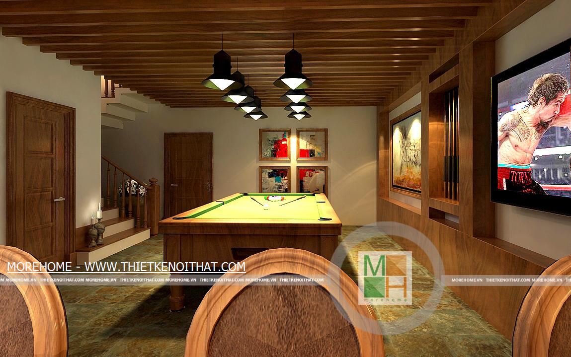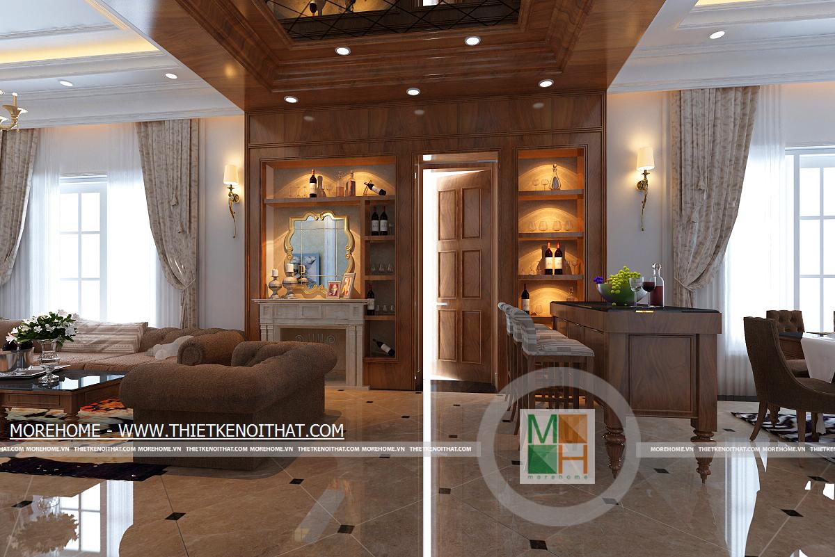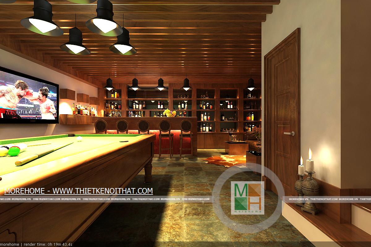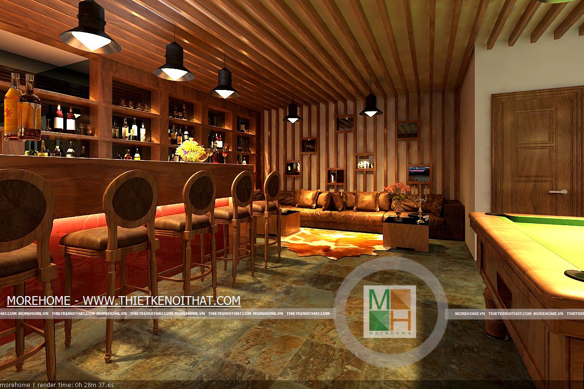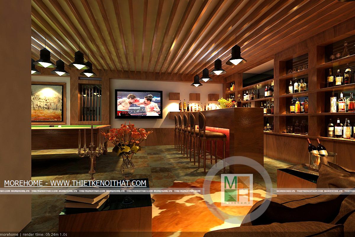 Với niềm yêu thích về rượu chủ nhà đã cùng kiến trúc sư nội thất tạo dựng một phòng rượu hoành tráng, cảm giác như đem một hầm rượu Tây Âu vào căn biệt thự. Nhưng không đơn thuần chỉ là một hầm rượu. Căn phòng được thiết kế như một quán bar sang trọng đẳng cấp, với gam nâu trầm từ sofa đến tủ rượu,những thanh gỗ ngang trên trần nhà. Sử dụng nhiều chất liệu gỗ trong thiết kế quán Bar này, kiến trúc sư một phần muốn đem lại sự thống nhất trong không gian, đồng thời những thanh ngang gỗ trên trần nhà tạo ra một nét độc đáo phá cách- nét Việt đơn giản mộc mạc trong không gian hiện đại.