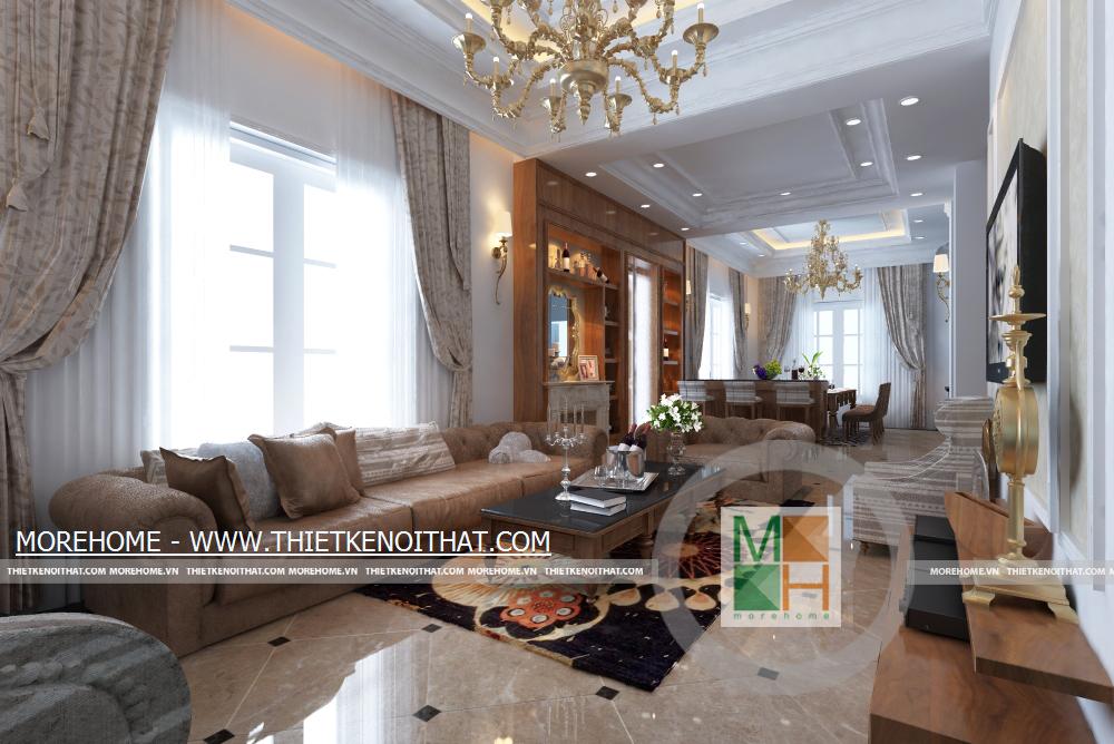 Tại phòng khách, nét đặc trưng của phong cách nội thất tân cổ điển thể hiện trước hết trong việc kết hợp giữa màu sáng trắng với gam màu nâu trầm hạt dẻ. Trong khi màu trắng đem lại nét tươi mới cho không gian, thì màu nâu hạt dẻ lại là yếu tố trung hòa độ sáng, thể hiện vẻ cổ điển. Cách sắp đặt màu sắc cũng rất phù hợp với không gian, màu trắng được dùng trên tường, trên trần nhà như một cách nới rộng tầm nhìn, trong khi đó, màu nâu trầm hạt dẻ sử dụng nhiều ở sàn, và đồ nội thất, đem lại nét tĩnh, trầm. Bởi vậy mà màu sắc thực sự hài hòa, cân đối, không gây sự phản cảm trong thị giác.