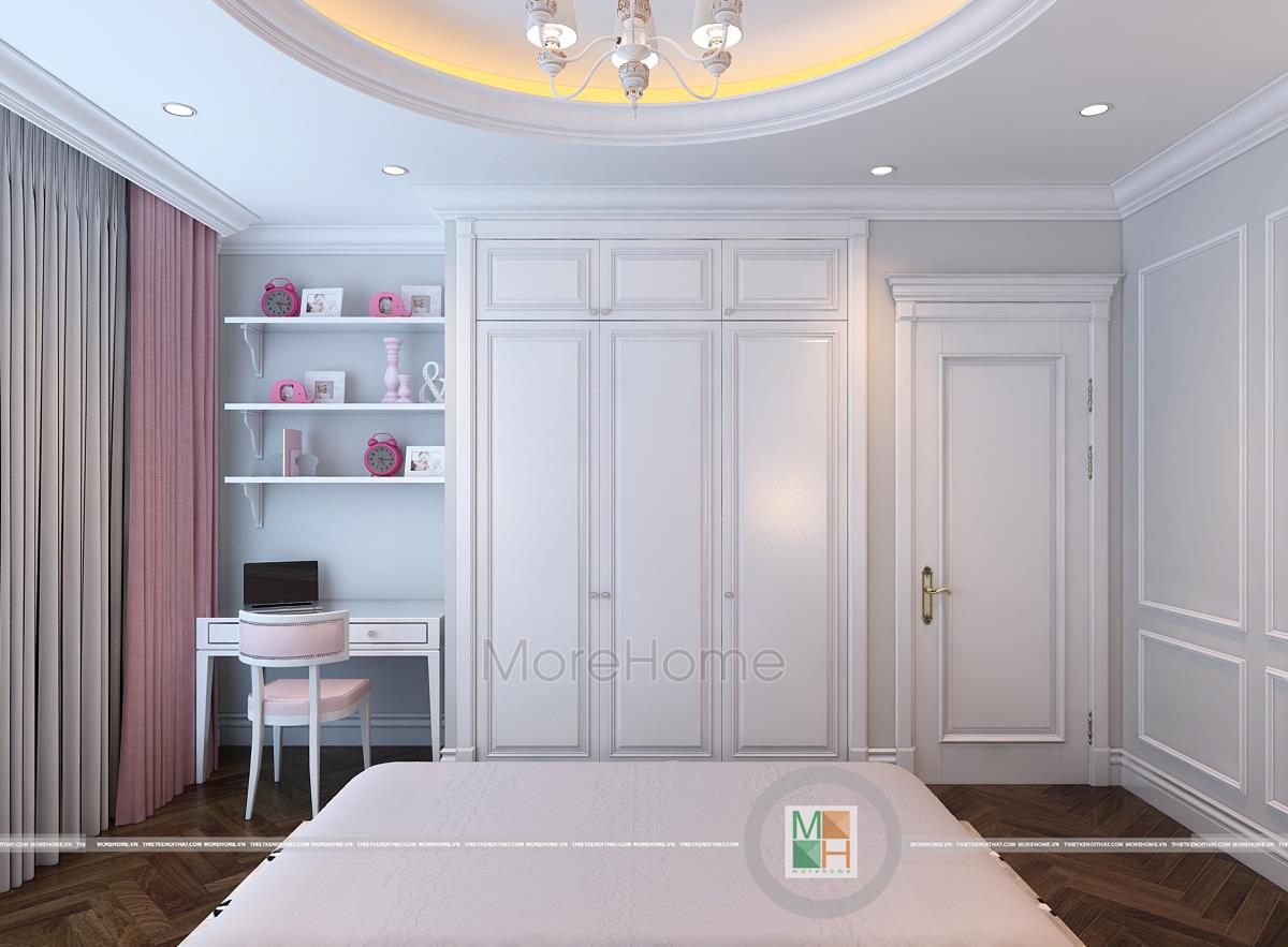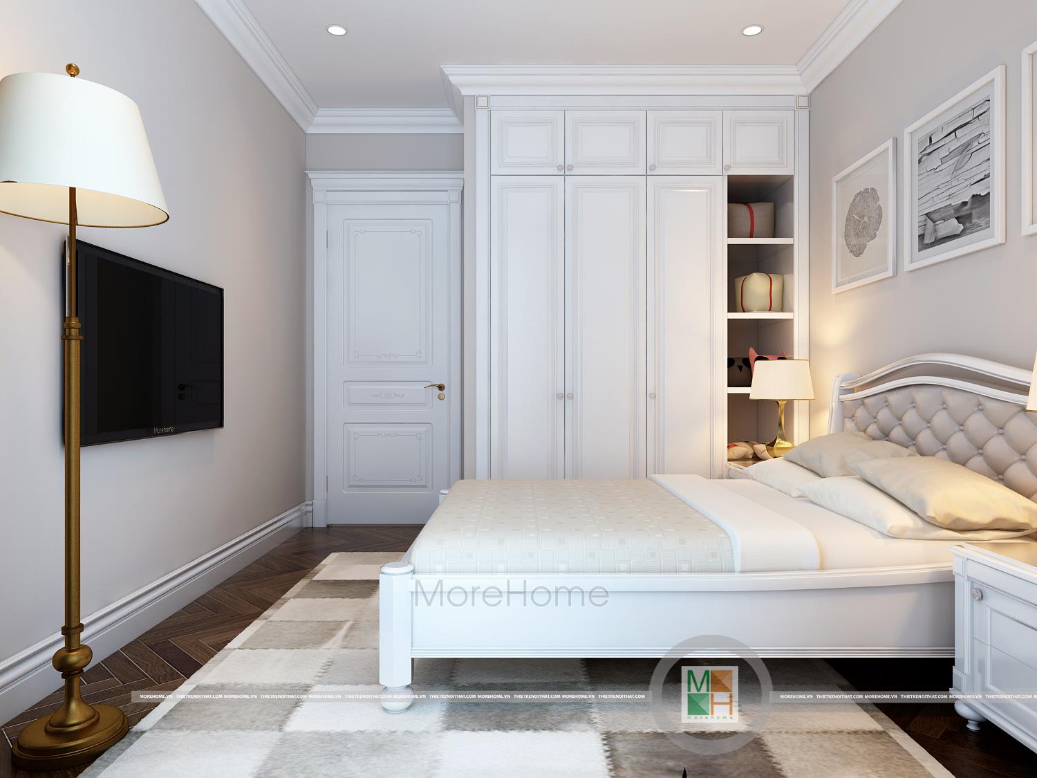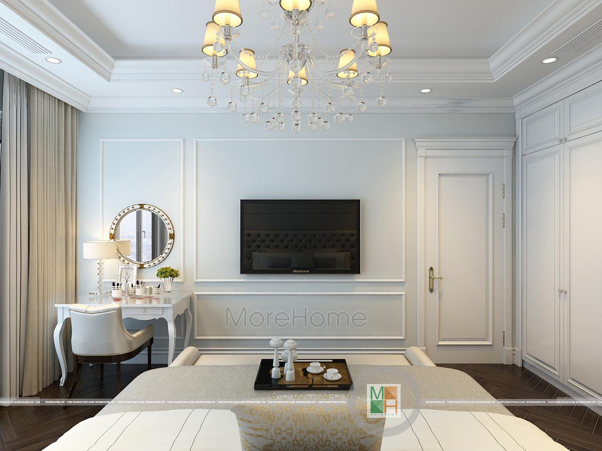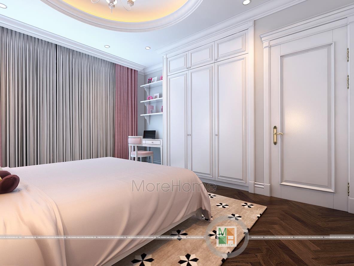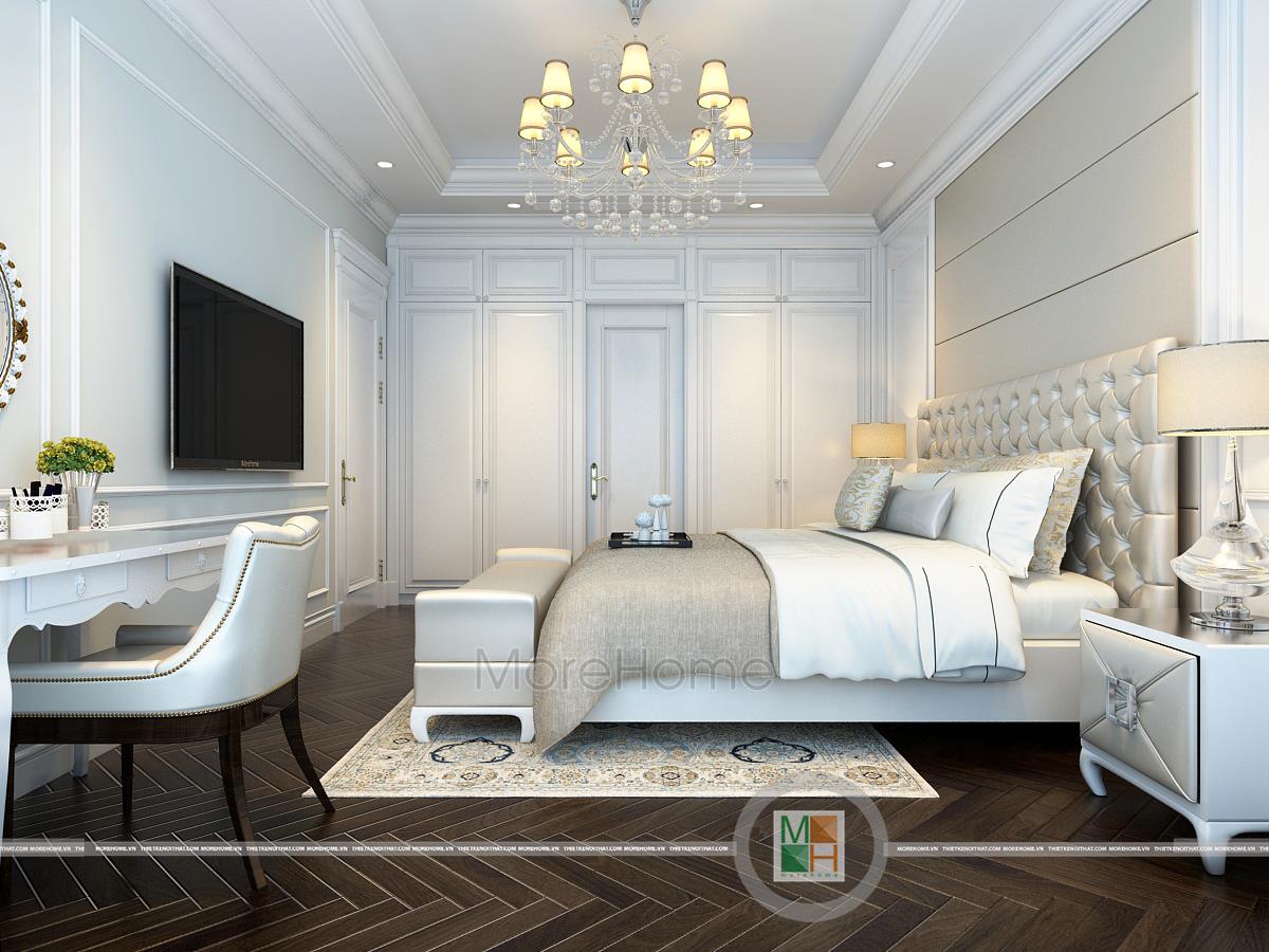 Thiết kế nội thất phòng ngủ tân cổ điển vẫn thiên về sử dụng các tone màu nhẹ nhàng, nâu sữa, ghi sáng, trắng vừa tạo cảm giác đồng nhất trong không gian lại góp phần lớn tạo cảm giác cơi nới cho căn phòng. Kính cường lực trong suốt được sử dụng để tạo không gian mở, mang ánh sáng tự nhiên vào phòng giúp mang lại hứng khởi cho gia chủ. Thiết kế kệ tủ đơn giản, gần như tạo mặt phẳng tường vừa đảm bảo tính tiện nghi lại không tốn quá nhiều diện tích.