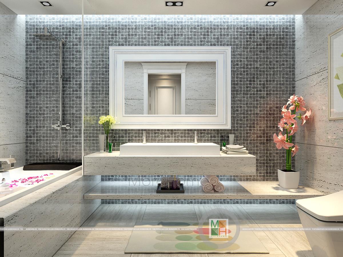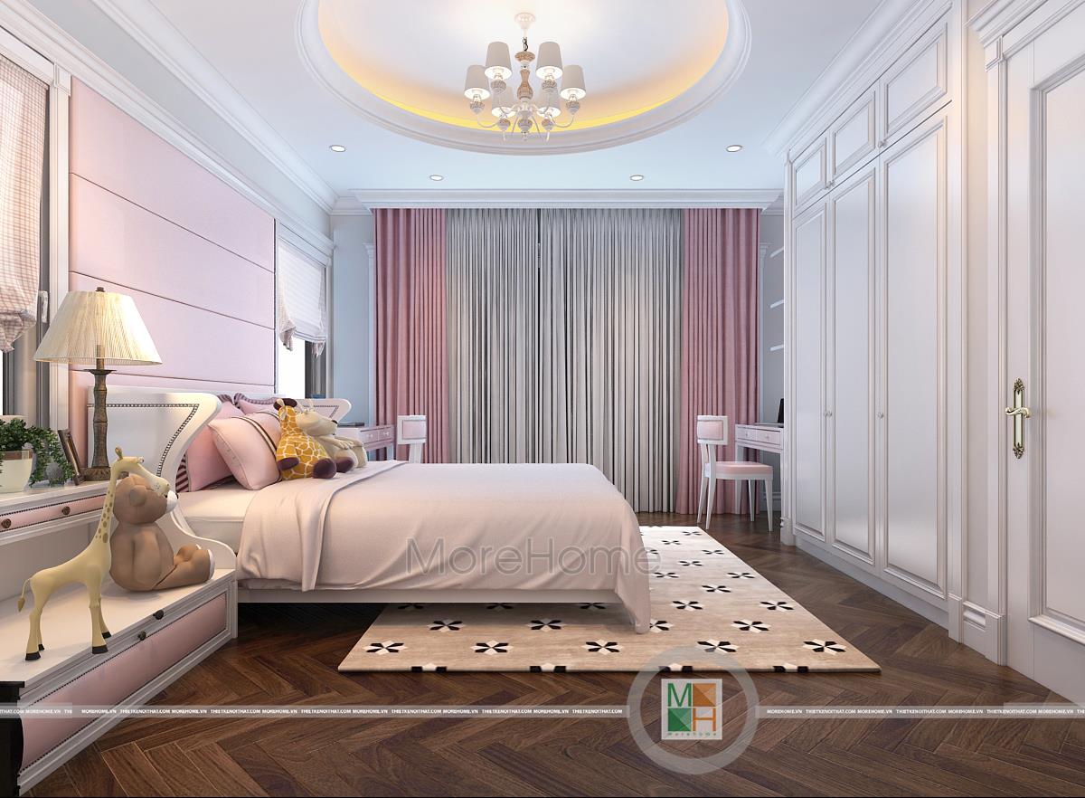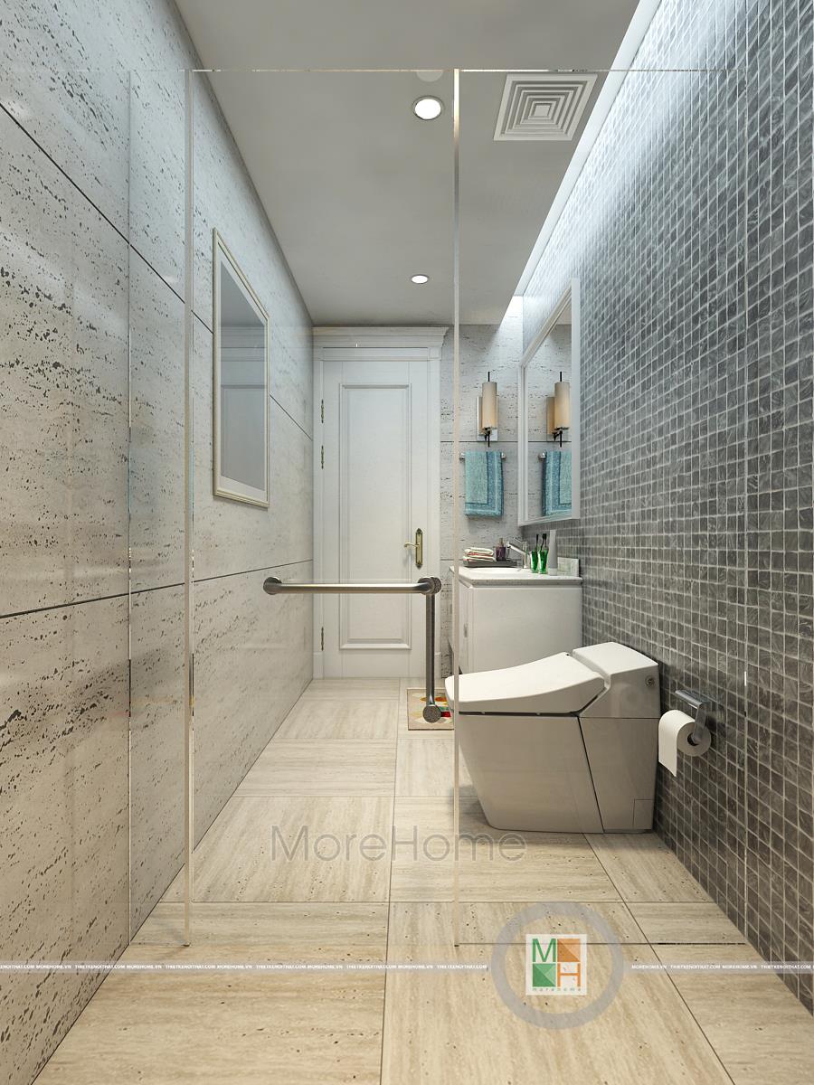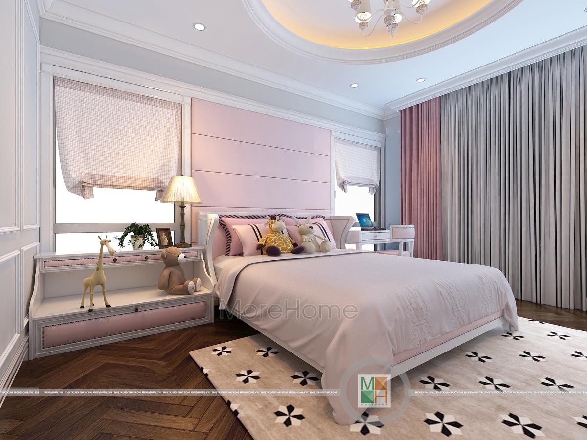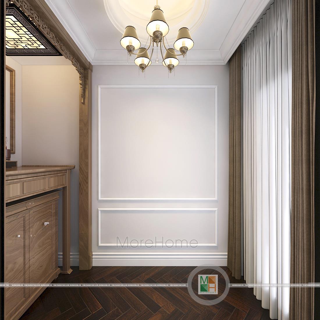 Thiết kế nội thất phòng ngủ tân cổ điển vẫn thiên về sử dụng các tone màu nhẹ nhàng, nâu sữa, ghi sáng, trắng vừa tạo cảm giác đồng nhất trong không gian lại góp phần lớn tạo cảm giác cơi nới cho căn phòng. Kính cường lực trong suốt được sử dụng để tạo không gian mở, mang ánh sáng tự nhiên vào phòng giúp mang lại hứng khởi cho gia chủ. Thiết kế kệ tủ đơn giản, gần như tạo mặt phẳng tường vừa đảm bảo tính tiện nghi lại không tốn quá nhiều diện tích.