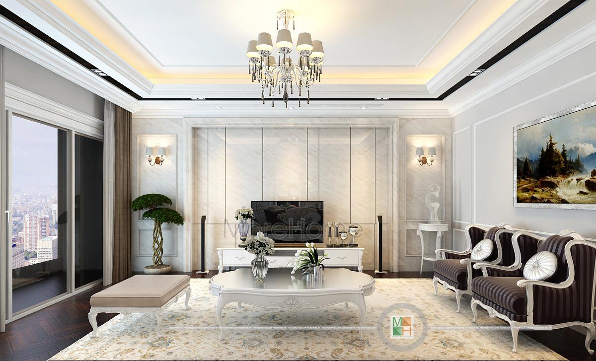 Thiết kế nội thất phòng khách tân cổ điển sử dụng tone màu chủ đạo là đen và trắng mang lại cảm giác hiện đại và sang trọng. Không gian nền trắng cũng góp phần lớn tạo cảm giác cơi nới cho không gian và tăng độ sáng cho căn phòng. Ngoài ra, thiết kế ánh sáng âm trần mang đến sự cân bằng giữa ánh sáng tự nhiên và ánh sáng hiện đại giúp không gian sống trở nên hài hòa, gợi cảm giác yên bình, dễ chịu.