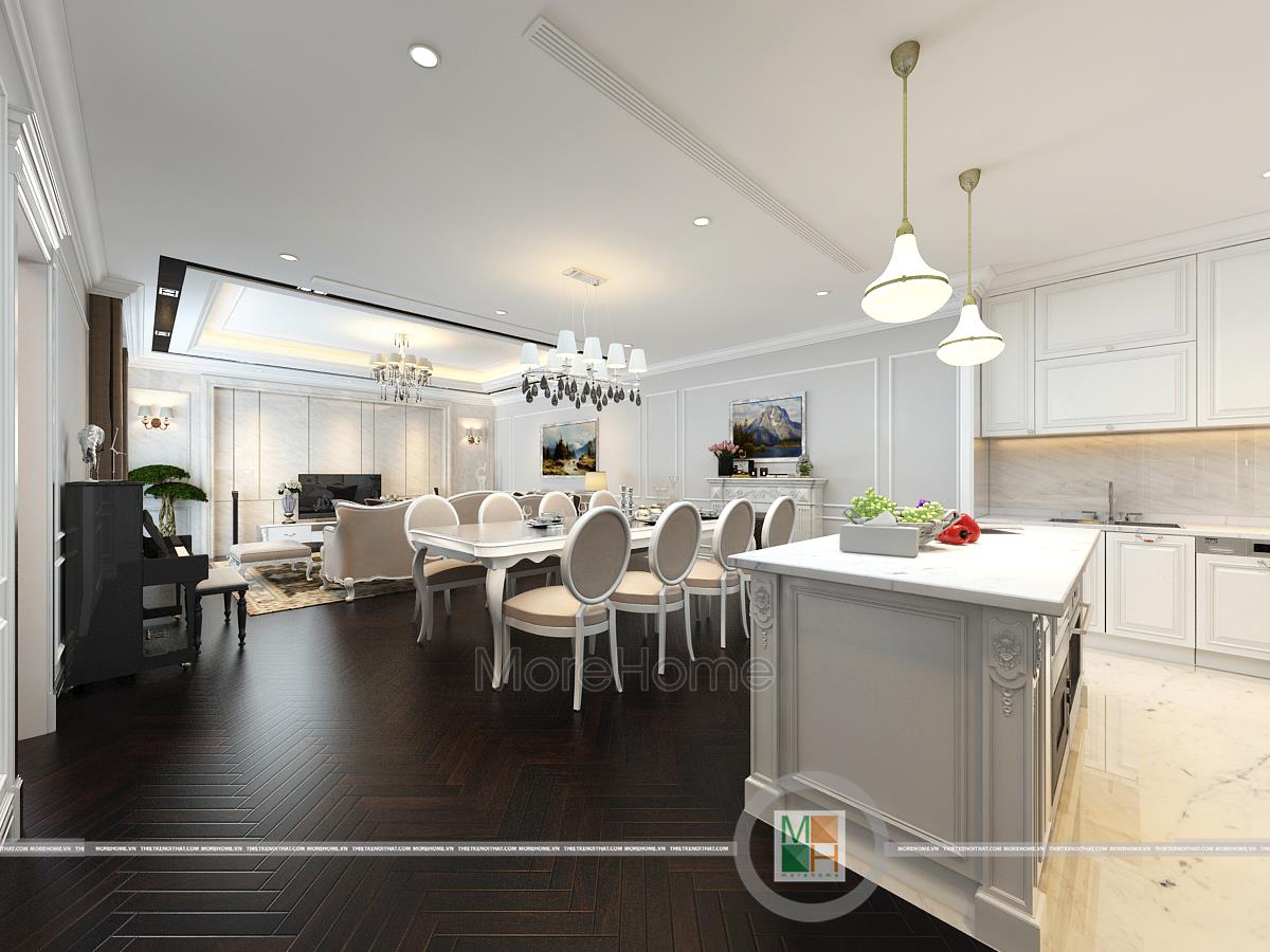 Tiếp theo là thiết kế nội thất bếp tân cổ điển. Tone màu mà kiến trúc sư ưu ái lựa chọn là màu trắng tinh khôi. Thiết kế quây gọn gàng thành một không gian riêng biệt đảm bảo tính rõ ràng trong thiết kế. Tủ bếp không quá cầu kỳ, được thiết kế đơn sắc với các nét trạm khắc tinh tế vừa đảm bảo không gian mở công năng lại vừa tạo sự nhất quán trong thiết kế tân cổ điển. Thay vì bức tường thô cứng chặn đứng không gian, kiến trúc sư đã khéo léo thay thế bằng thiết kế bệ bếp gọn gàng, chiều cao vừa phải giúp không gian mở, tăng khả năng quan sát cho gia chủ, tăng tính tiện nghi cho căn bếp.
