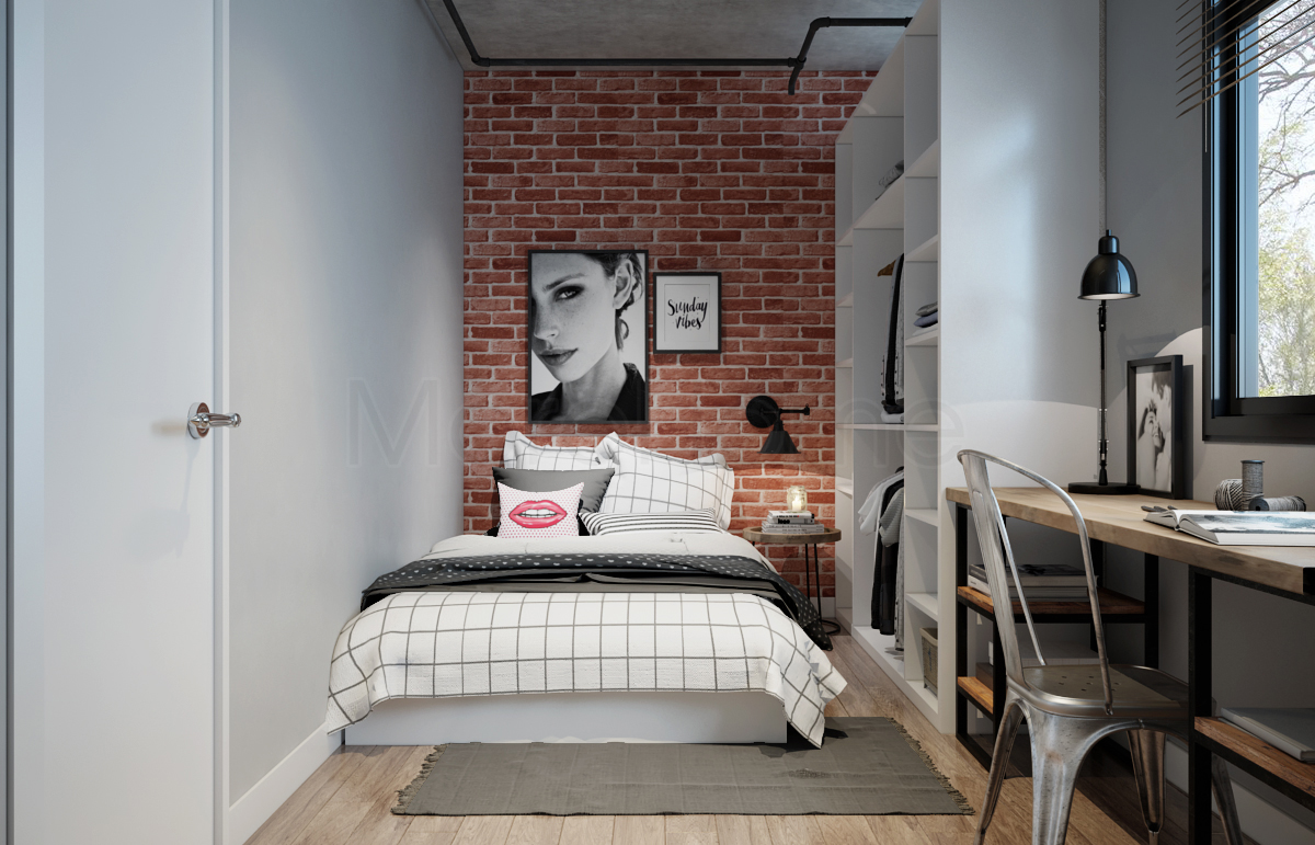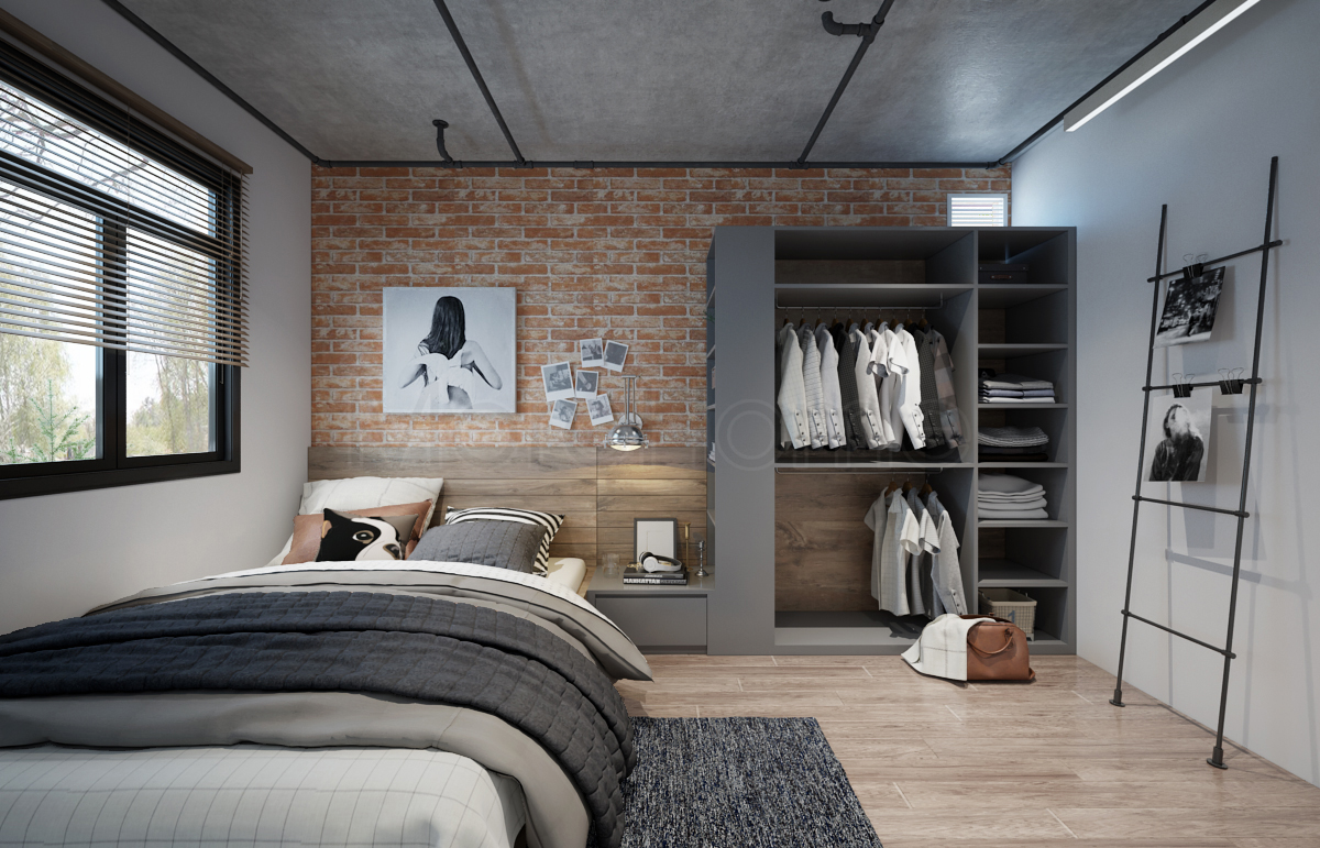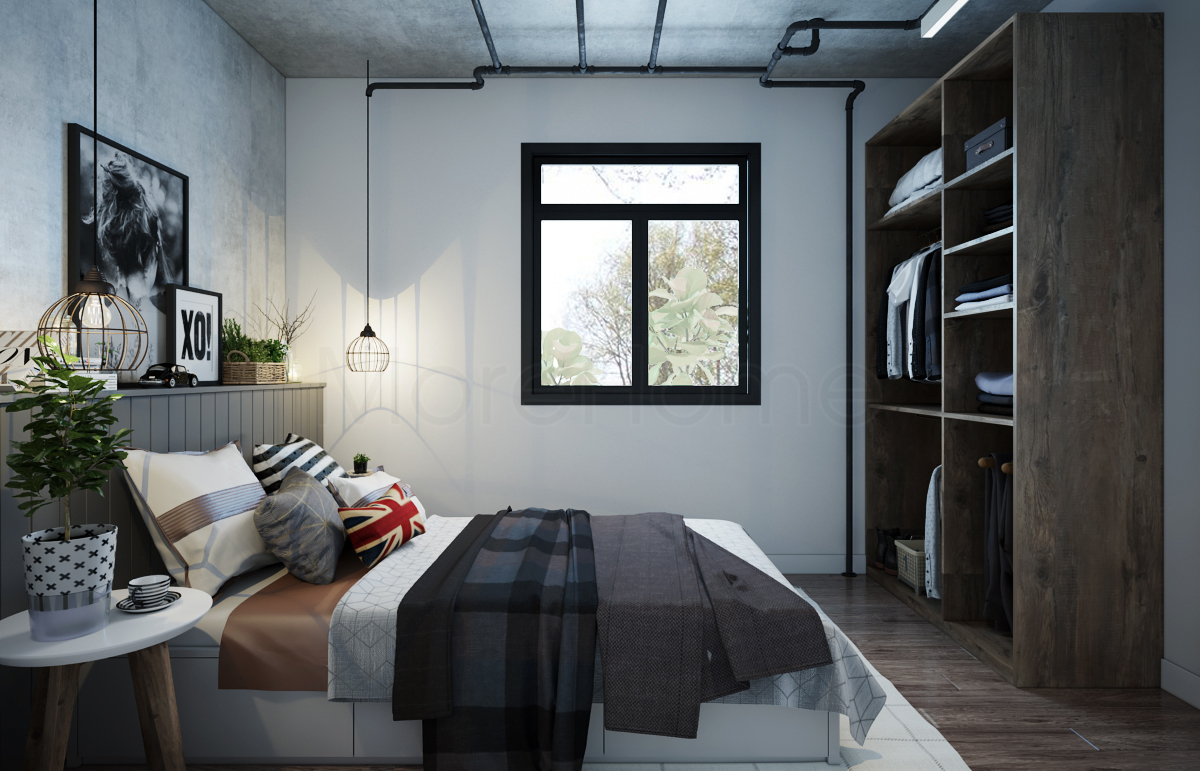 Tiếp theo là thiết kế nội thất phòng ngủ hiện đại đơn giản với thiết kế giường ngủ đơn gọn gàng, không gian phòng ngủ nhỏ tuy nhiên không ảnh hưởng nhiều đến tính công năng và sự tiện dụng của căn hộ. Thiết kể cửa sổ rộng đem ánh sáng tự nhiên vào căn phòng, đem ánh sáng tự nhiên và hứng khởi cho gia chủ và các thành viên trong gia đình. Nội thất thiết kế tủ gỗ được co gọn gàng thành các thiết kế đứng đơn giản đa ngăn vừa đảm bảo mang đến sự tiện lợi cho gia chủ lại không làm ảnh hưởng đến tính thẩm mỹ của không gian sống.