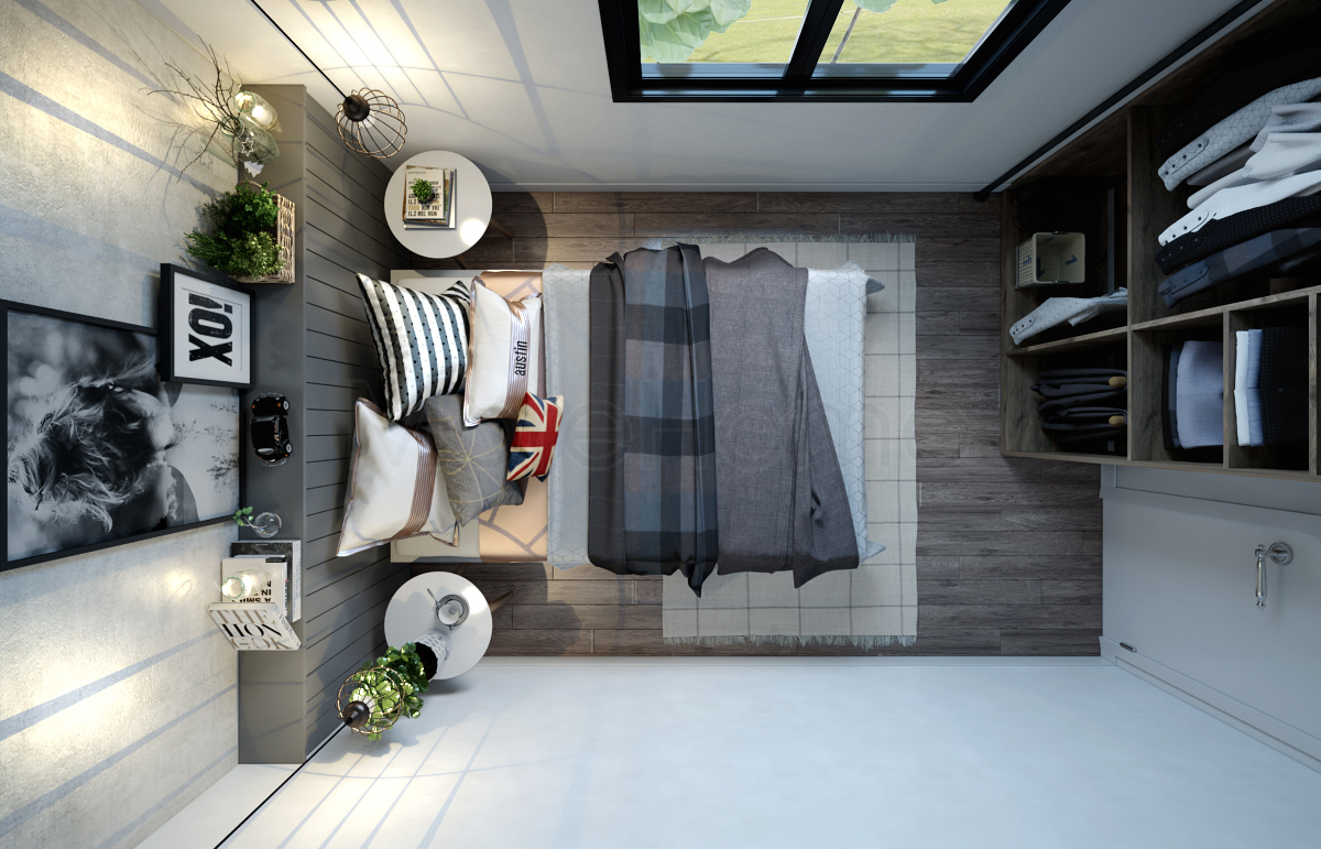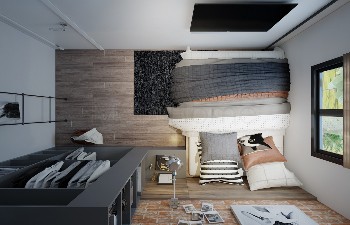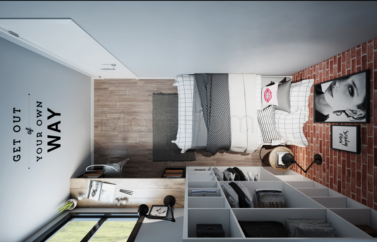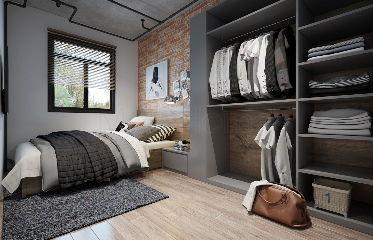 Tiếp theo là thiết kế nội thất phòng ngủ hiện đại đơn giản với thiết kế giường ngủ đơn gọn gàng, không gian phòng ngủ nhỏ tuy nhiên không ảnh hưởng nhiều đến tính công năng và sự tiện dụng của căn hộ. Thiết kể cửa sổ rộng đem ánh sáng tự nhiên vào căn phòng, đem ánh sáng tự nhiên và hứng khởi cho gia chủ và các thành viên trong gia đình. Nội thất thiết kế tủ gỗ được co gọn gàng thành các thiết kế đứng đơn giản đa ngăn vừa đảm bảo mang đến sự tiện lợi cho gia chủ lại không làm ảnh hưởng đến tính thẩm mỹ của không gian sống.