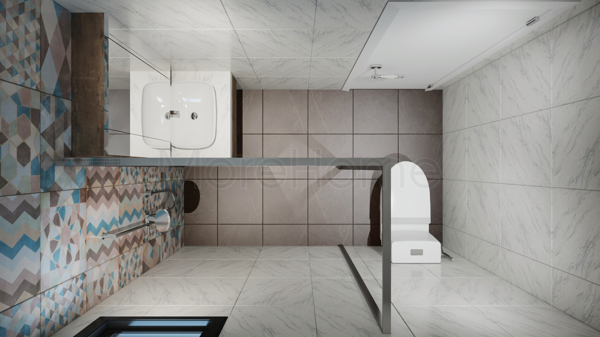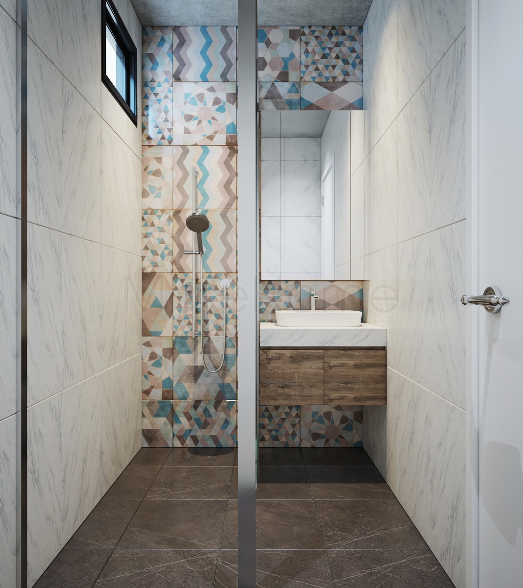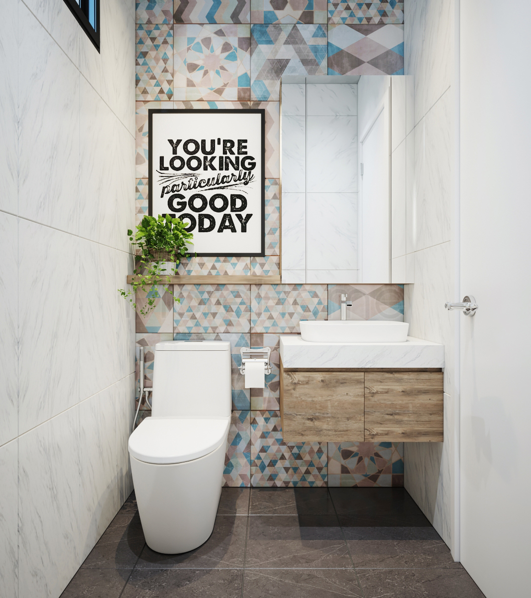 Thiết kế nội thất nhà vệ sinh sử dụng khá nhiều các khối gạch men đa sắc giúp không gian trở nên thật sáng tạo với vẻ đẹp cách tân thu hút.