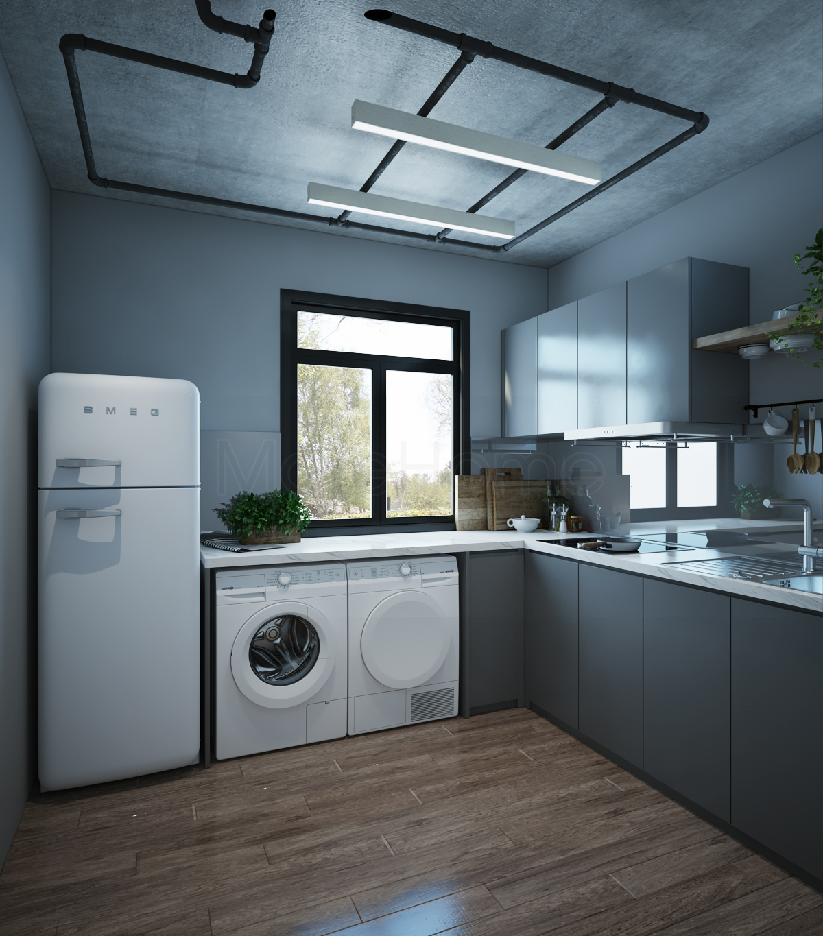 Thiết kế nội thất bếp nhỏ gọn, đơn giản được sắp đặt gọn gàng, không quá trọng các thiết kế phức tạp hay vượt quá nhu cầu, các thiết kế này đều là các thiết kế gọn gàng, kích cỡ vừa phải, không tập trung vào làm nổi bật vẻ đẹp mà thay vào đó là tính trẻ trung, hiện đại, sạch sẽ và sự tiện nghi. Sự kết hợp khéo léo của không gian bếp, máy giặt và tủ lạnh, đặt liền kề mà không tạo cảm giác vướng víu, khó chịu, không gian tủ bếp là các hình khối đơn giản, tone màu ghi tro hiện đại, thân thiện.