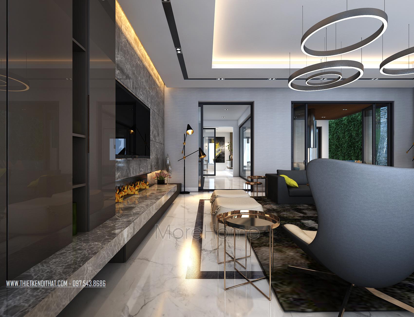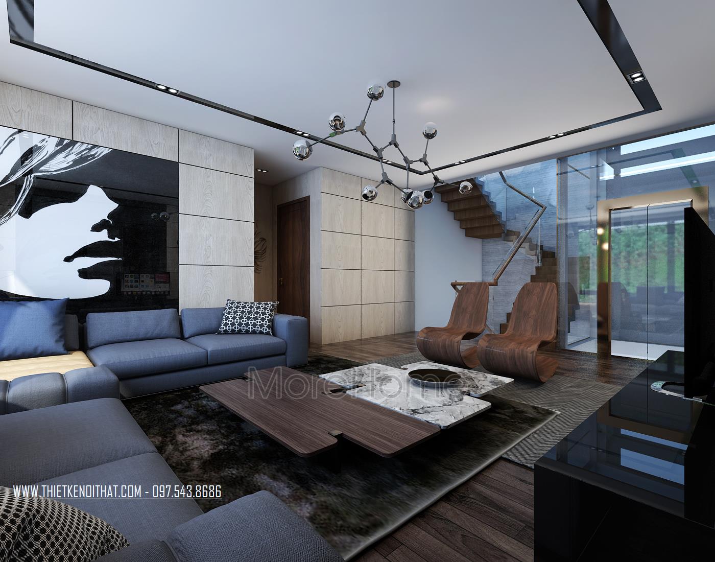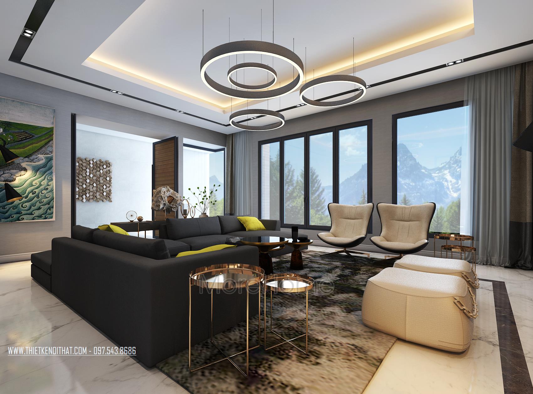 Thiết kế nội thất phòng khách biệt thự hiện đại sử dụng tone màu tối làm chủ đạo. Thiết kế ghế sofa đơn giản, không cầu kỳ về chi tiết, mang đến sự cân bằng và thoải mái về đường nét cho thiết kế. Ghế sofa được lựa chọn khá linh hoạt, có độ mở lớn, dạng to bành vững chãi gợi cảm giác an toàn và vững chãi. Không gian phòng khách bị bao bọc bởi bốn bức tường thô cứng đã được thay đổi hoàn toàn, thay vào đó là thiết kế mở với kính cường lực trong suốt và thiết kế mảng tường vân đá tự nhiên.