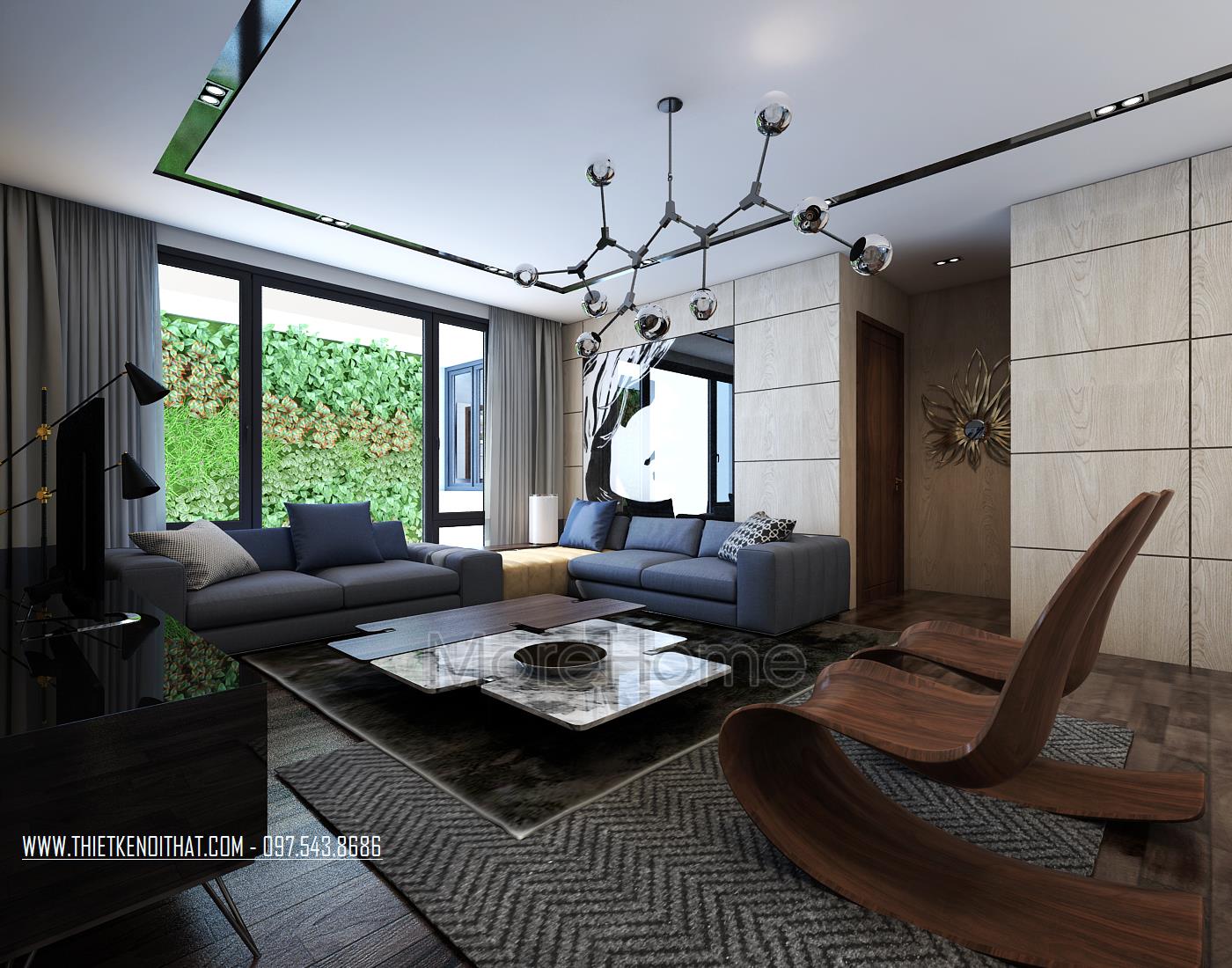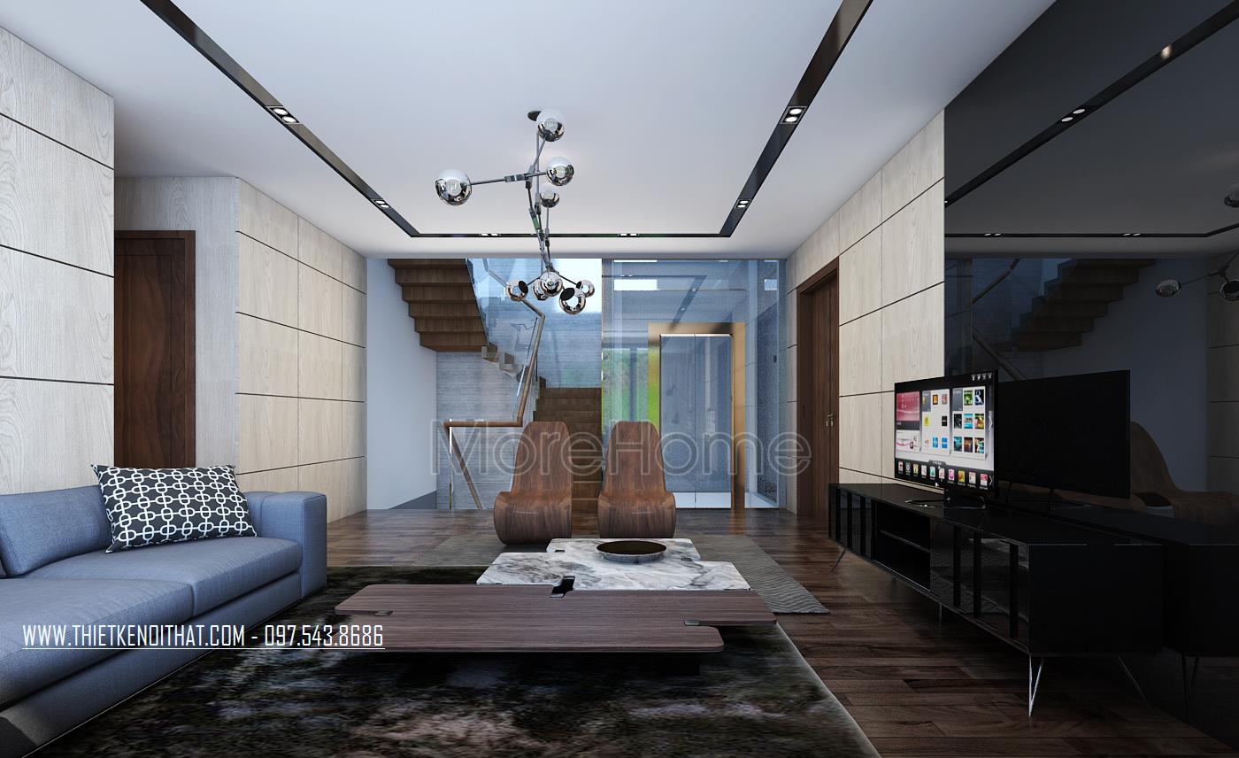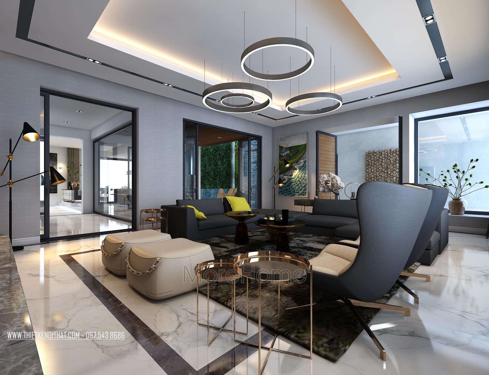 Thiết kế nội thất phòng khách biệt thự hiện đại sử dụng tone màu tối làm chủ đạo. Thiết kế ghế sofa đơn giản, không cầu kỳ về chi tiết, mang đến sự cân bằng và thoải mái về đường nét cho thiết kế. Ghế sofa được lựa chọn khá linh hoạt, có độ mở lớn, dạng to bành vững chãi gợi cảm giác an toàn và vững chãi. Không gian phòng khách bị bao bọc bởi bốn bức tường thô cứng đã được thay đổi hoàn toàn, thay vào đó là thiết kế mở với kính cường lực trong suốt và thiết kế mảng tường vân đá tự nhiên.