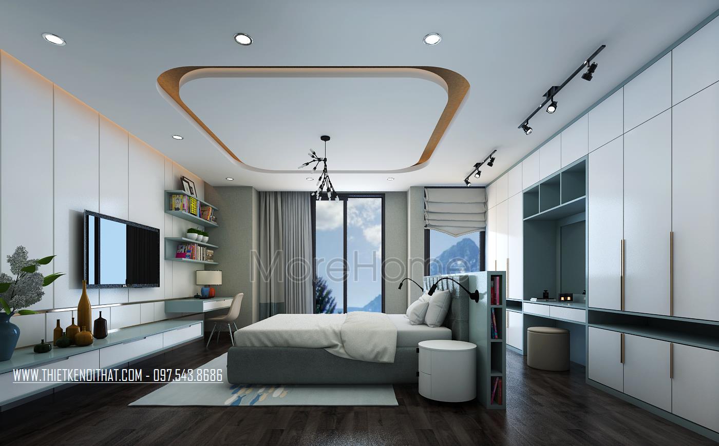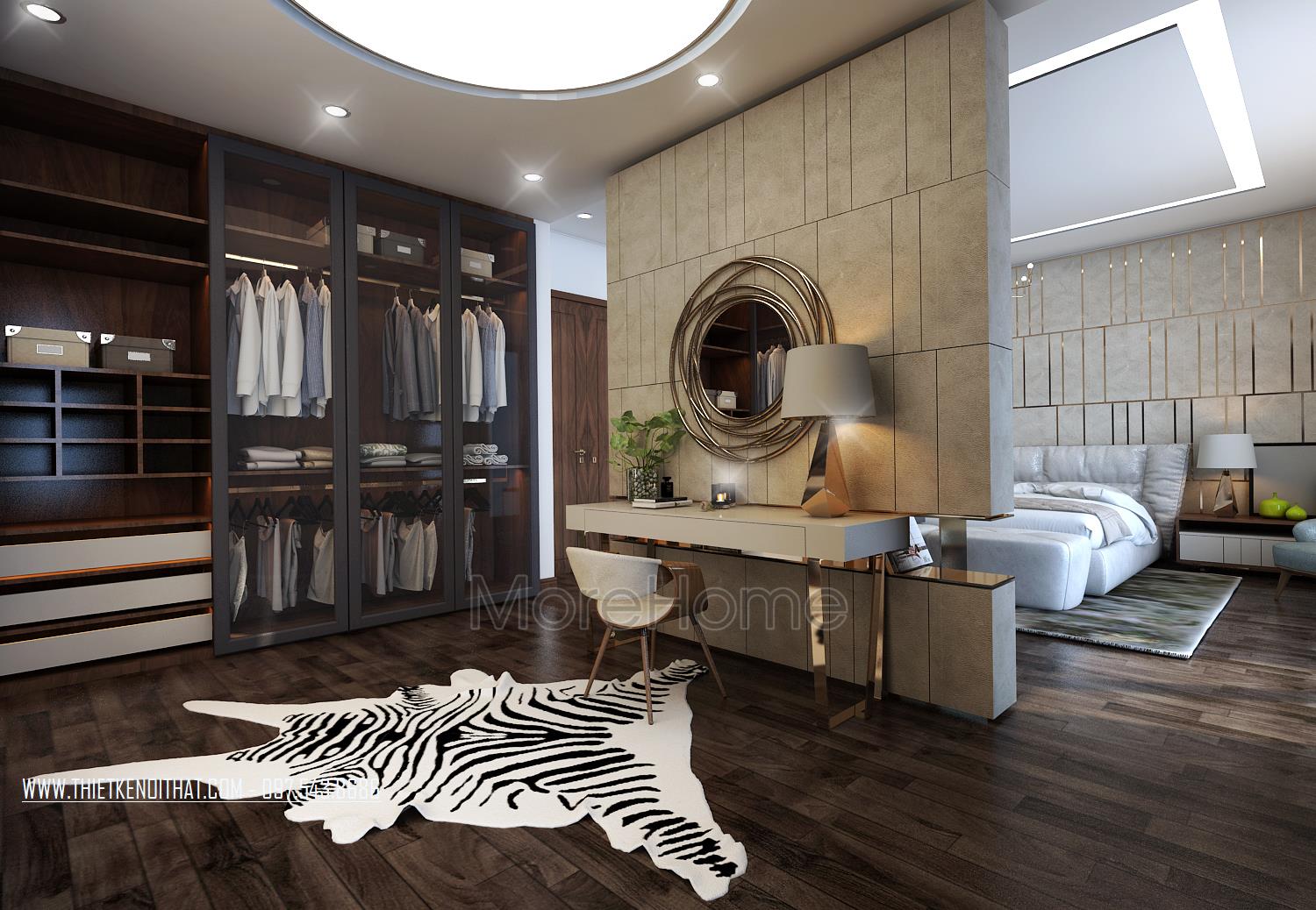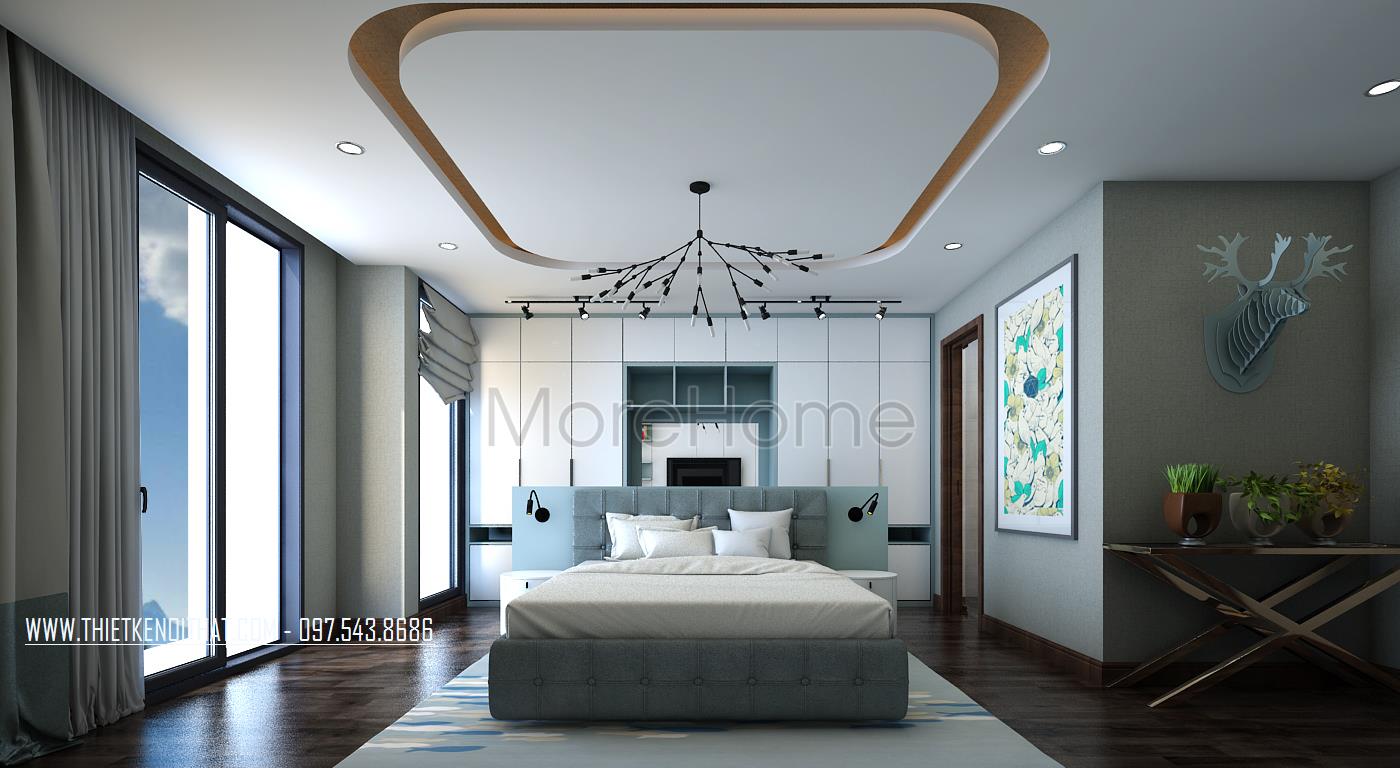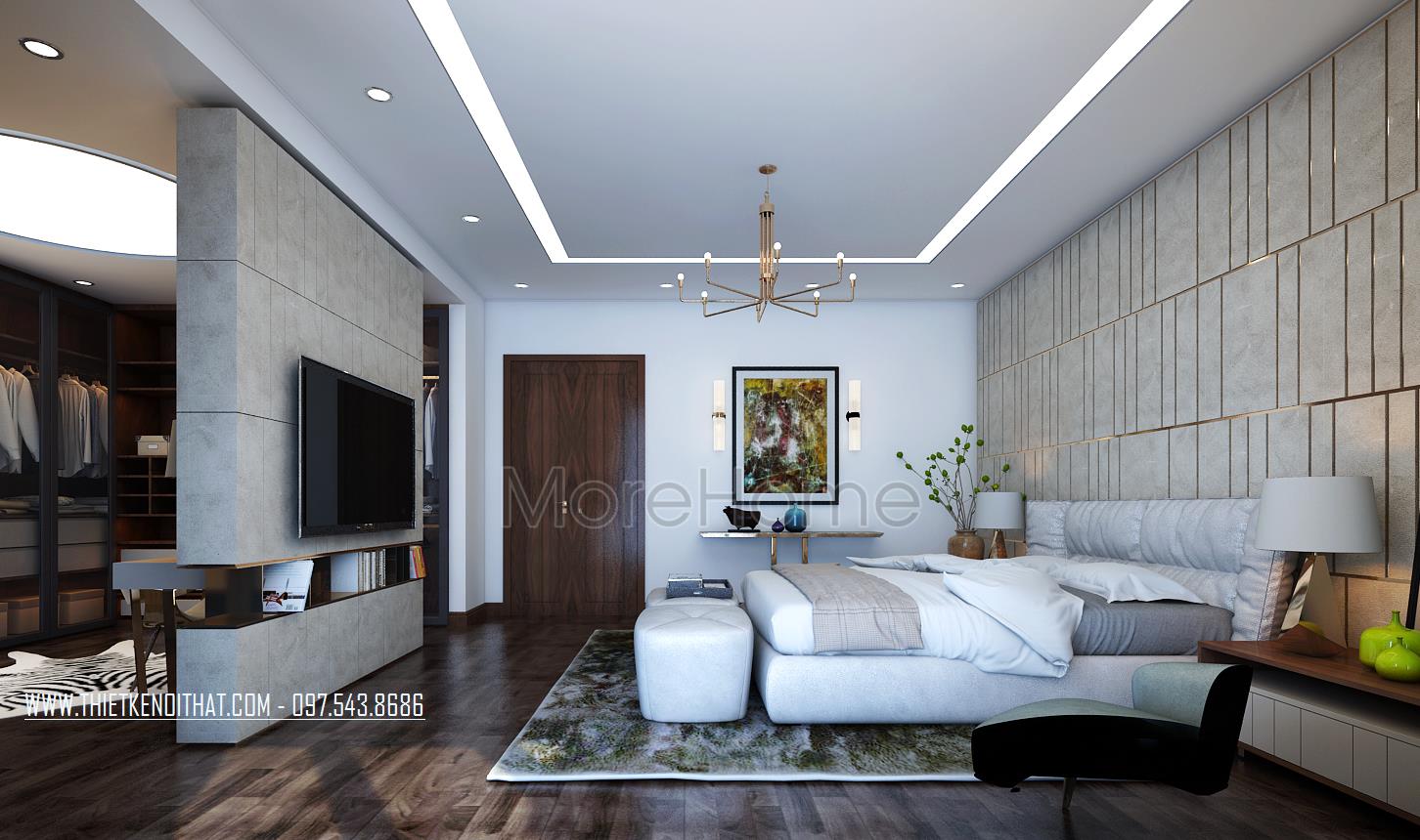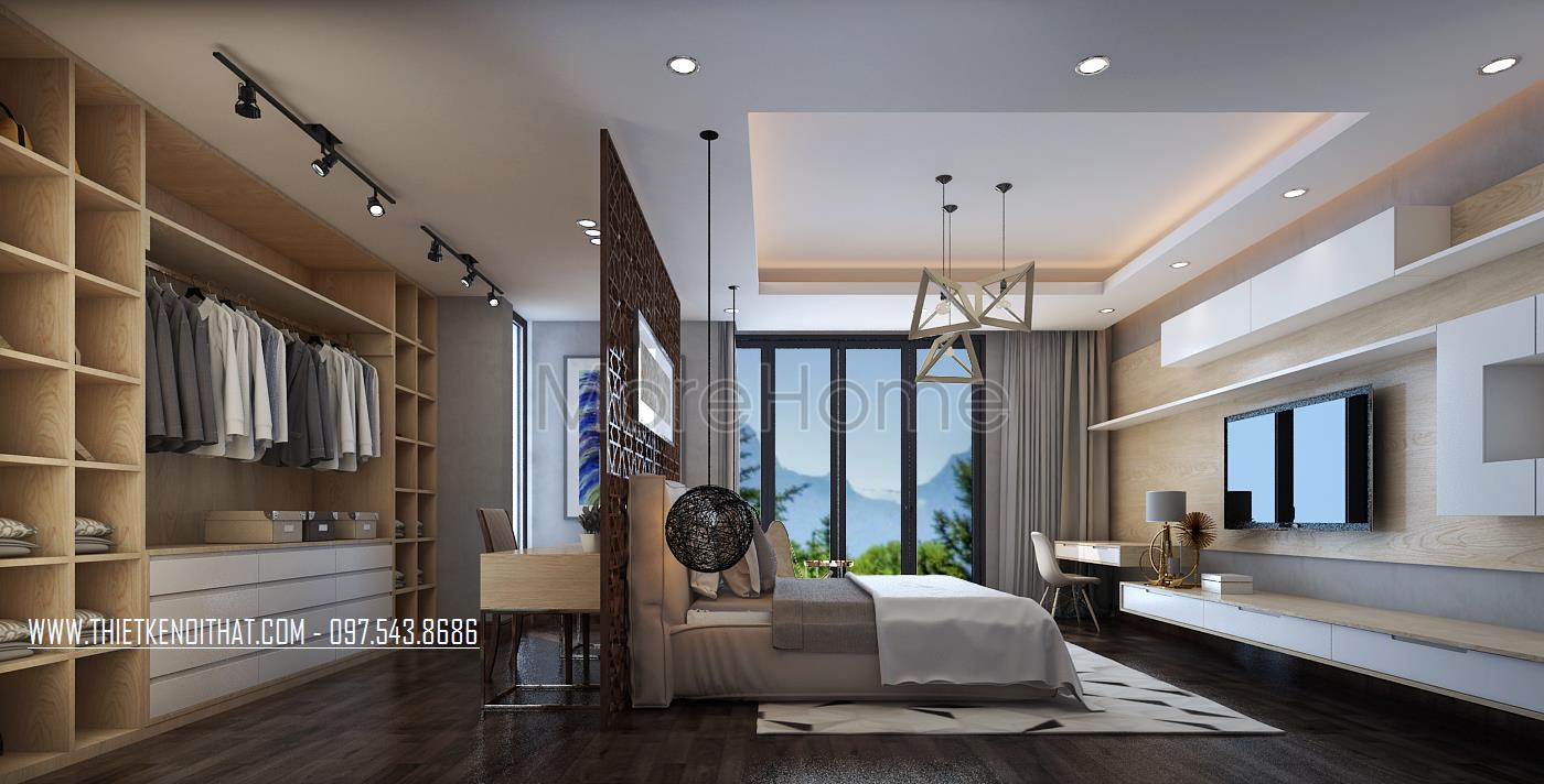 Thiết kế nội thất phòng ngủ Master thực sự là một không gian đáng mơ ước của nhiều người. Khu giường ngủ và tủ quần áo được chia cắt nhẹ nhàng bởi bức chắn linh hoạt. Không phải là tường thô cứng hay các chi tiết thô mà thay vào đó là các thiết kế phân chia rõ ràng, tăng tính tiện nghi cho không gian. Tường thô đơn sắc được thay thế hoàn toàn bằng các thiết kế sử dụng giấy dán tường hoa văn đơn giản và mới lạ. Ánh sáng tự nhiên vẫn là điểm nhấn đặc biệt giúp mang lại sự hứng khởi cho không gian này.