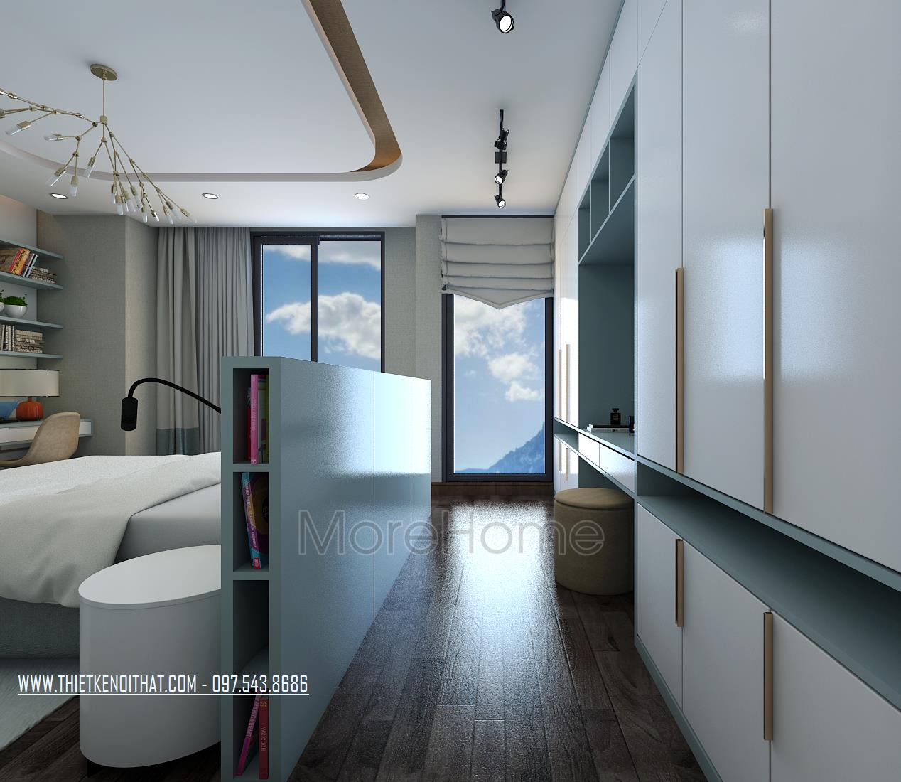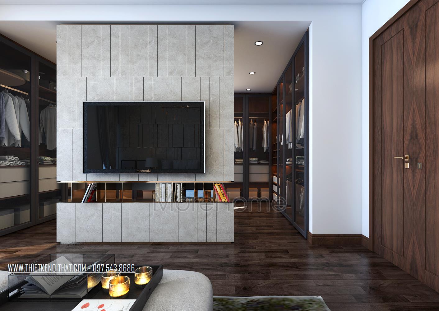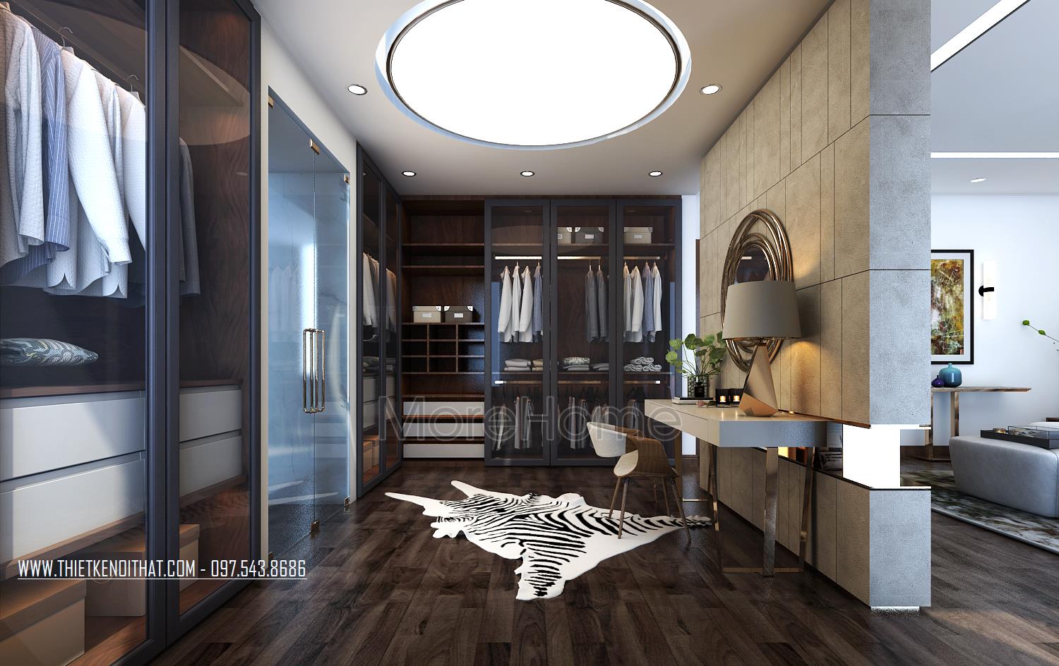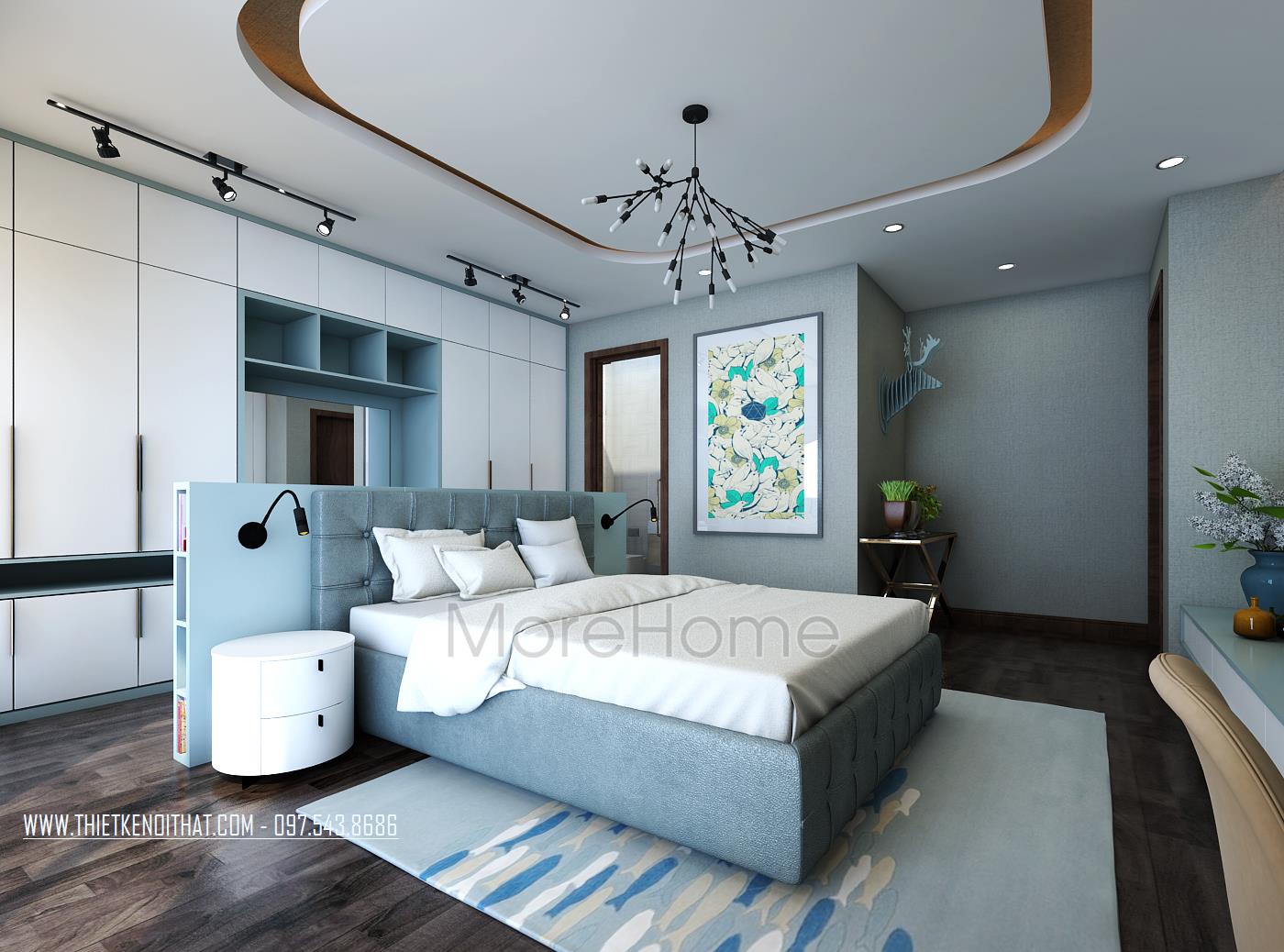 Thiết kế nội thất phòng ngủ Master thực sự là một không gian đáng mơ ước của nhiều người. Khu giường ngủ và tủ quần áo được chia cắt nhẹ nhàng bởi bức chắn linh hoạt. Không phải là tường thô cứng hay các chi tiết thô mà thay vào đó là các thiết kế phân chia rõ ràng, tăng tính tiện nghi cho không gian. Tường thô đơn sắc được thay thế hoàn toàn bằng các thiết kế sử dụng giấy dán tường hoa văn đơn giản và mới lạ. Ánh sáng tự nhiên vẫn là điểm nhấn đặc biệt giúp mang lại sự hứng khởi cho không gian này.