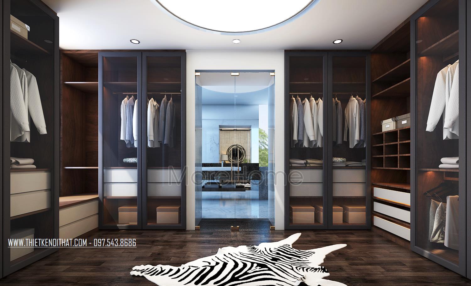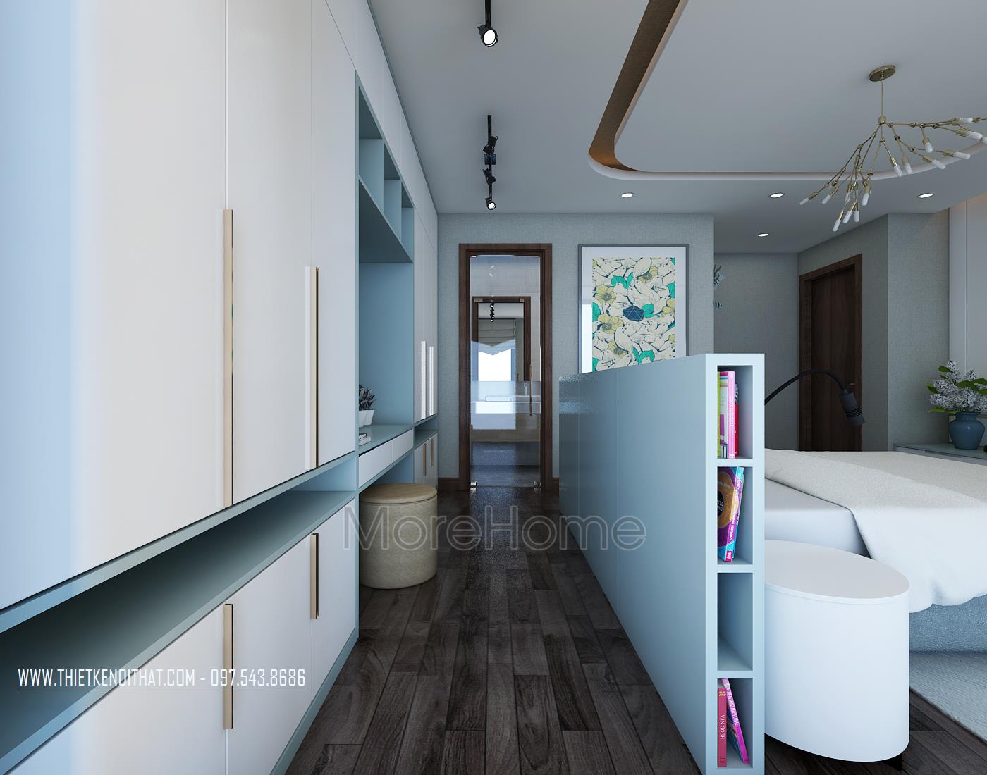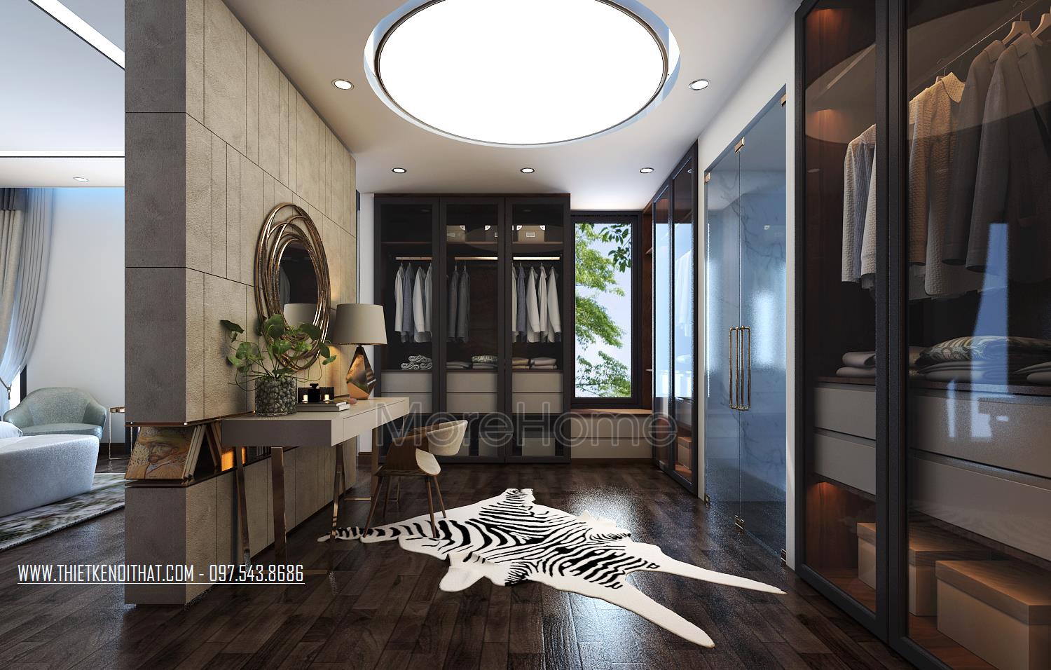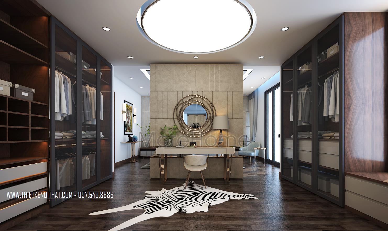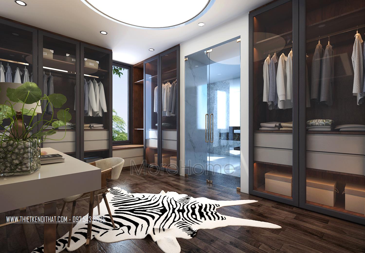 Thiết kế nội thất phòng ngủ Master thực sự là một không gian đáng mơ ước của nhiều người. Khu giường ngủ và tủ quần áo được chia cắt nhẹ nhàng bởi bức chắn linh hoạt. Không phải là tường thô cứng hay các chi tiết thô mà thay vào đó là các thiết kế phân chia rõ ràng, tăng tính tiện nghi cho không gian. Tường thô đơn sắc được thay thế hoàn toàn bằng các thiết kế sử dụng giấy dán tường hoa văn đơn giản và mới lạ. Ánh sáng tự nhiên vẫn là điểm nhấn đặc biệt giúp mang lại sự hứng khởi cho không gian này.