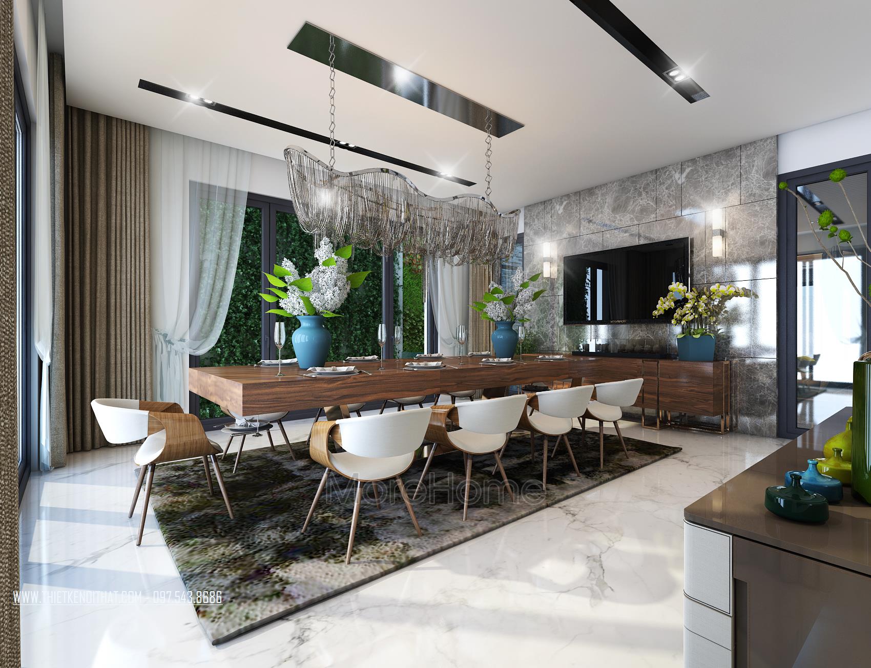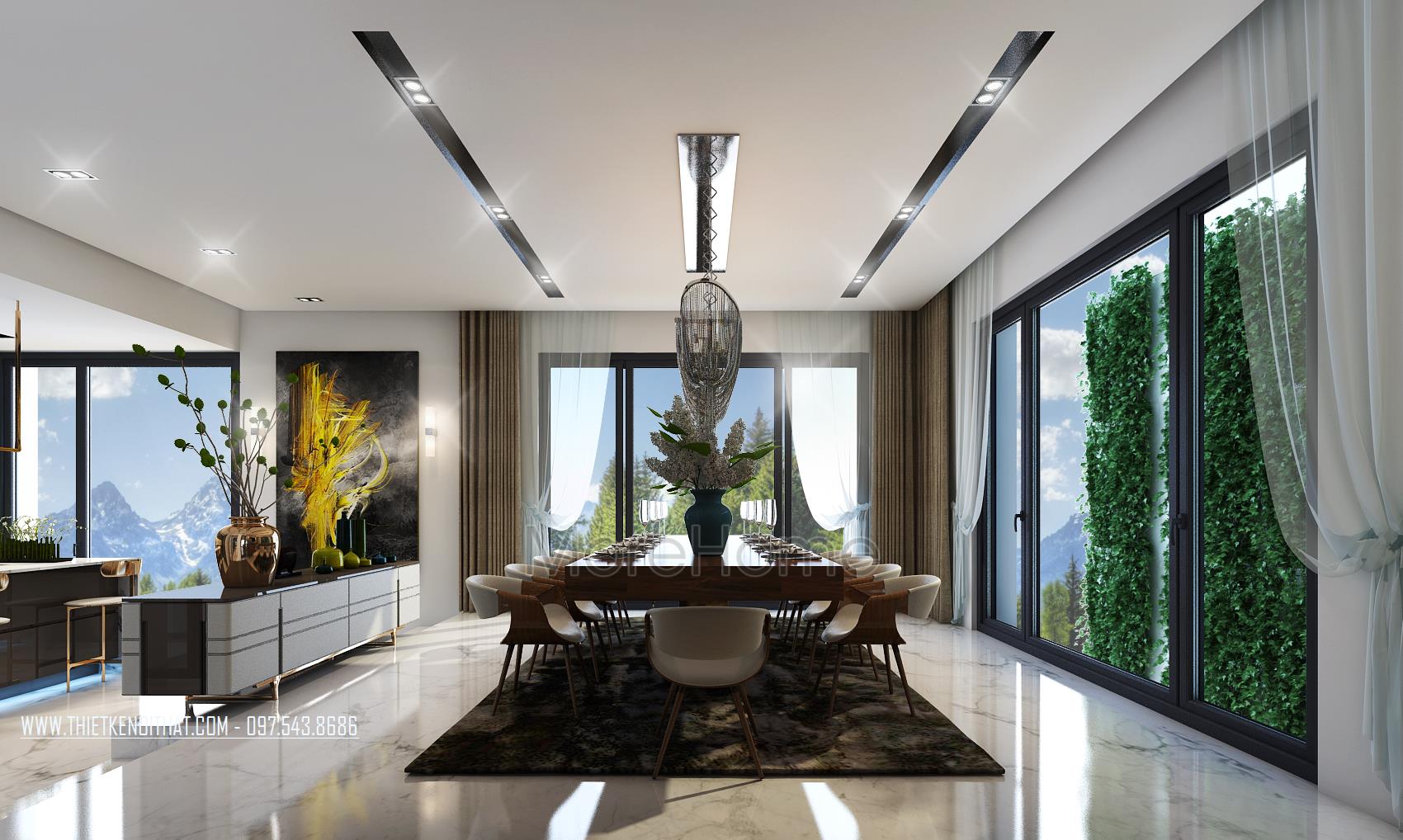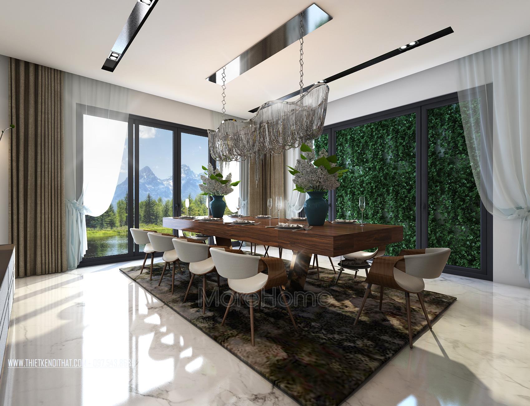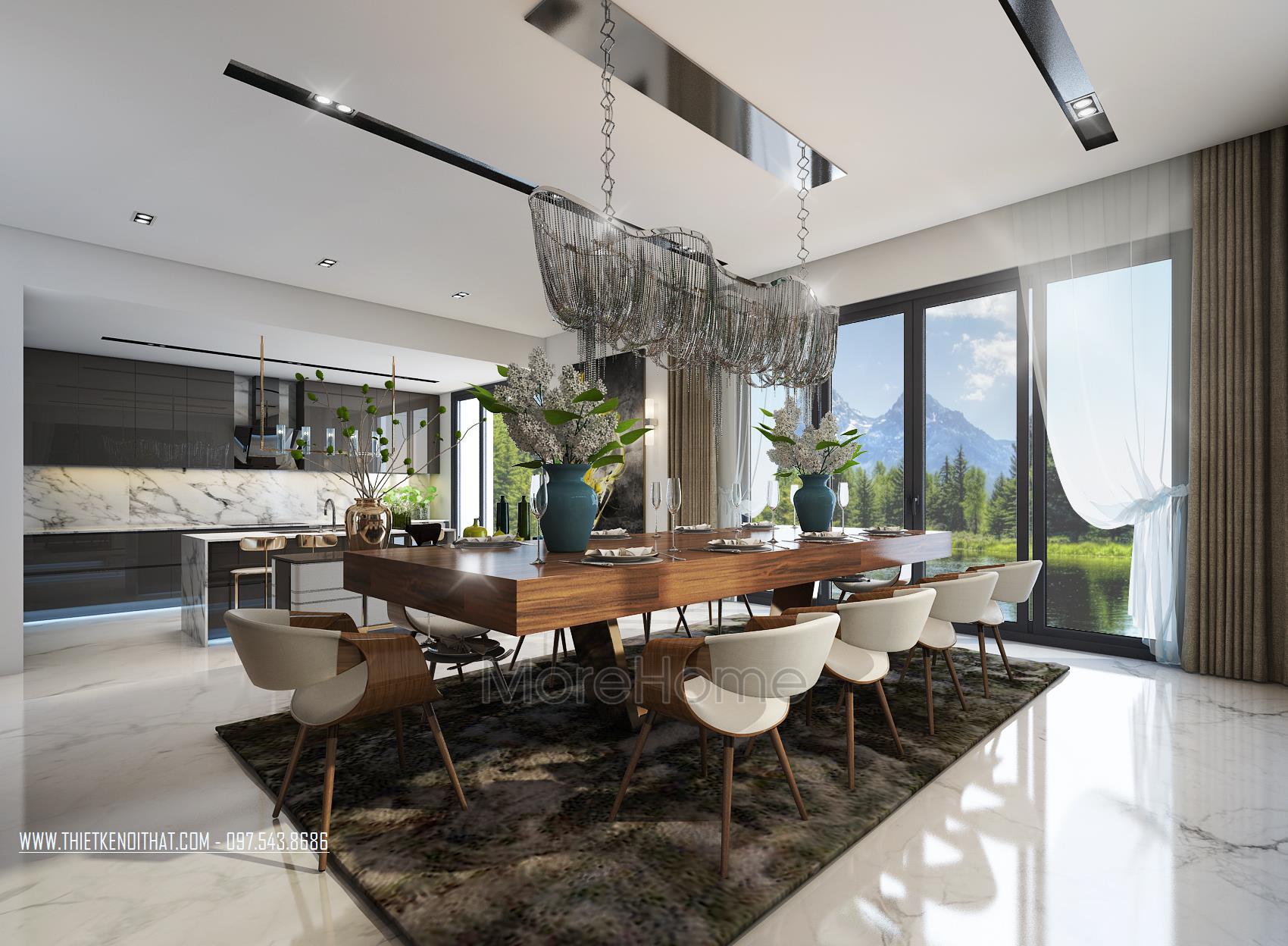Tiếp theo là thiết kế nội thất bếp và bàn ăn hiện đại. Điểm nổi bật nhất của thiết kế này chính là sự thay đổi táo bạo và đầy mới lạ trong thiết kế bàn ăn. Thiết kế bàn ăn nổi bật và thu hút ánh nhìn bởi tính hiện đại và vô cùng mới mẻ. Không gian bàn ăn rộng rãi phù hợp với cả các bữa tiệc lớn của gia đình. Thiết kế kính cường lực trong suốt bao quanh hay đèn chùm mở chiếu sáng sáng tạo, cùng với không gian xanh ở mọi nơi là điểm nhấn đầy thu hút giúp tạo ấn tượng và truyển cảm hứng cho không gian này.
