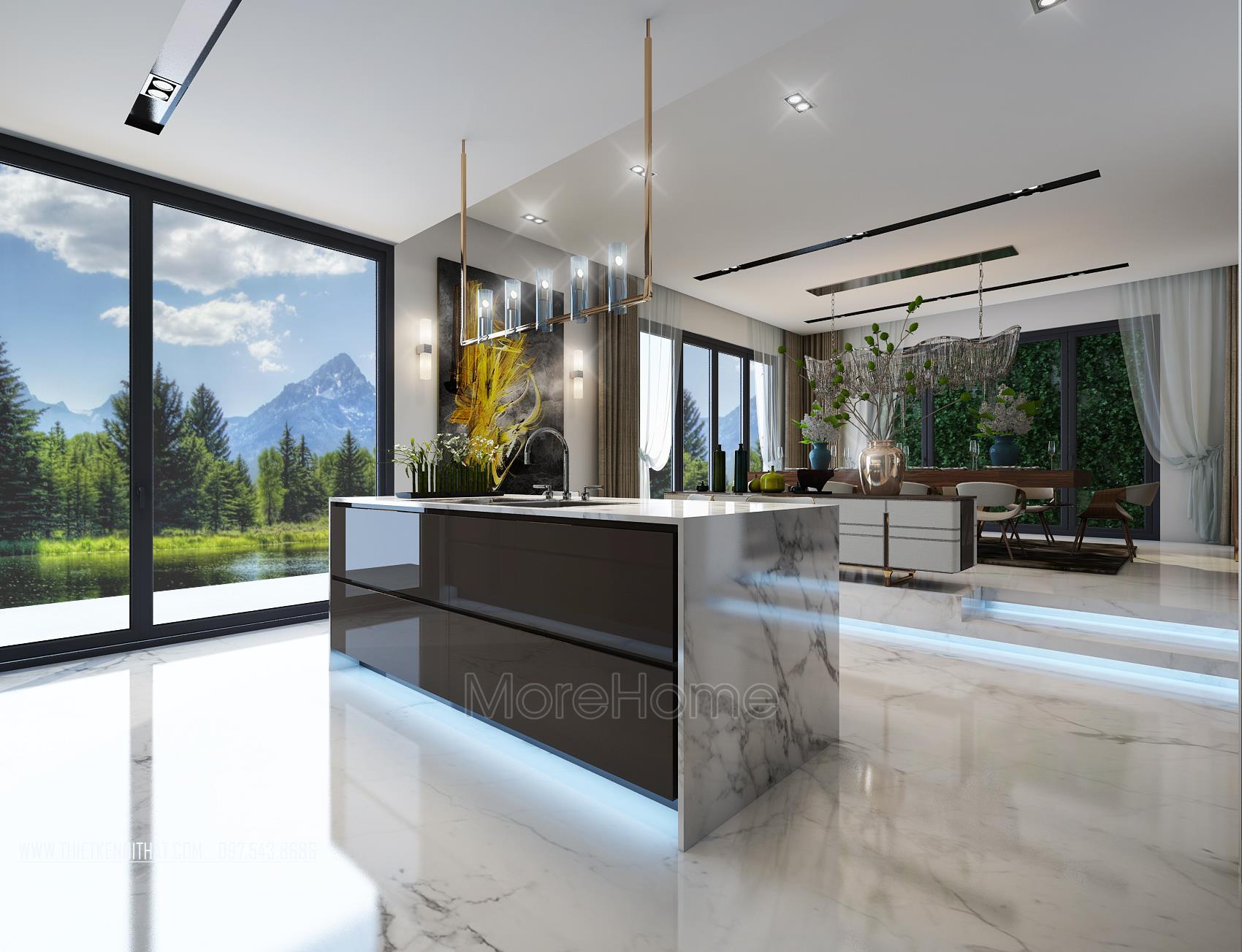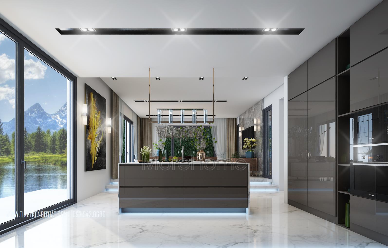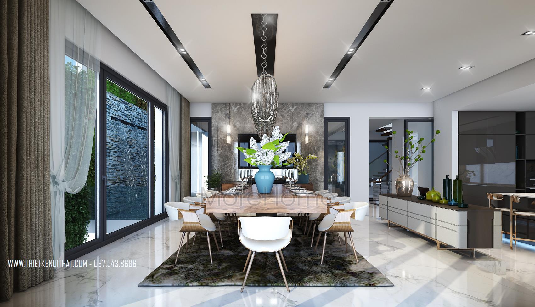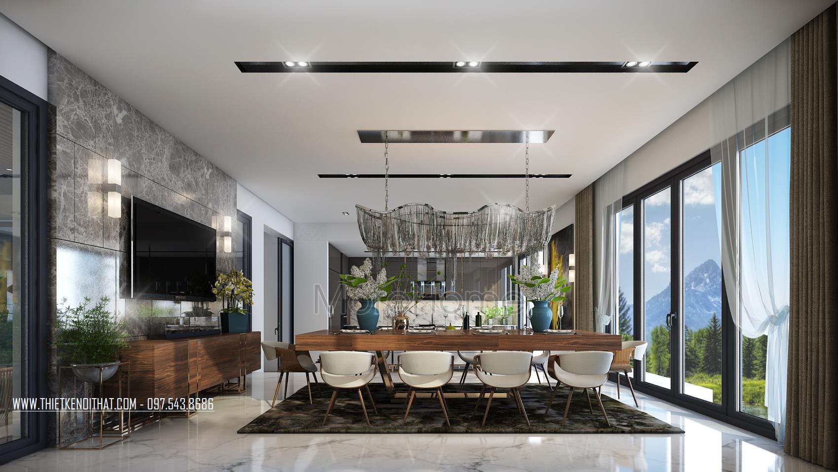 Tiếp theo là thiết kế nội thất bếp và bàn ăn hiện đại. Điểm nổi bật nhất của thiết kế này chính là sự thay đổi táo bạo và đầy mới lạ trong thiết kế bàn ăn. Thiết kế bàn ăn nổi bật và thu hút ánh nhìn bởi tính hiện đại và vô cùng mới mẻ. Không gian bàn ăn rộng rãi phù hợp với cả các bữa tiệc lớn của gia đình. Thiết kế kính cường lực trong suốt bao quanh hay đèn chùm mở chiếu sáng sáng tạo, cùng với không gian xanh ở mọi nơi là điểm nhấn đầy thu hút giúp tạo ấn tượng và truyển cảm hứng cho không gian này.