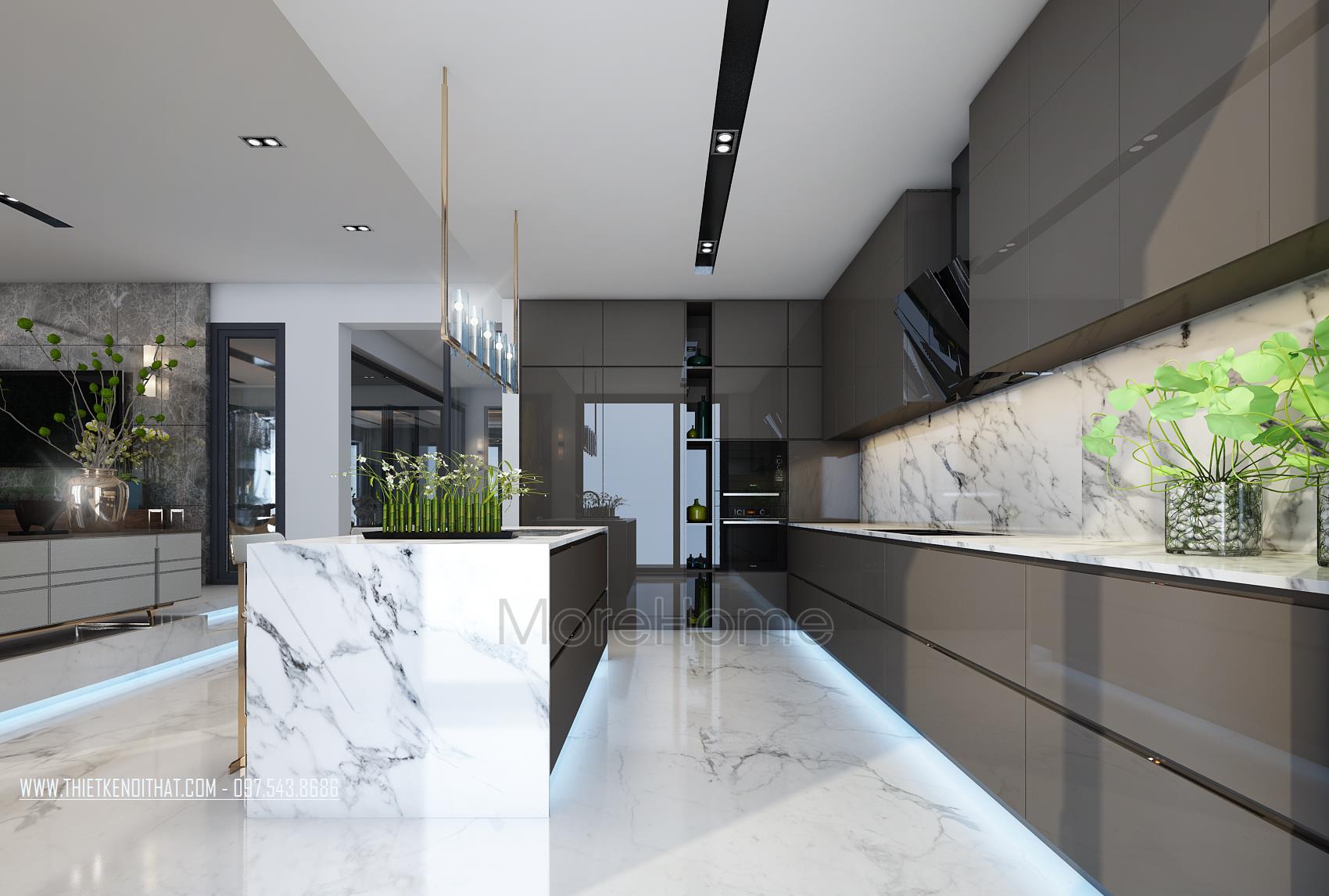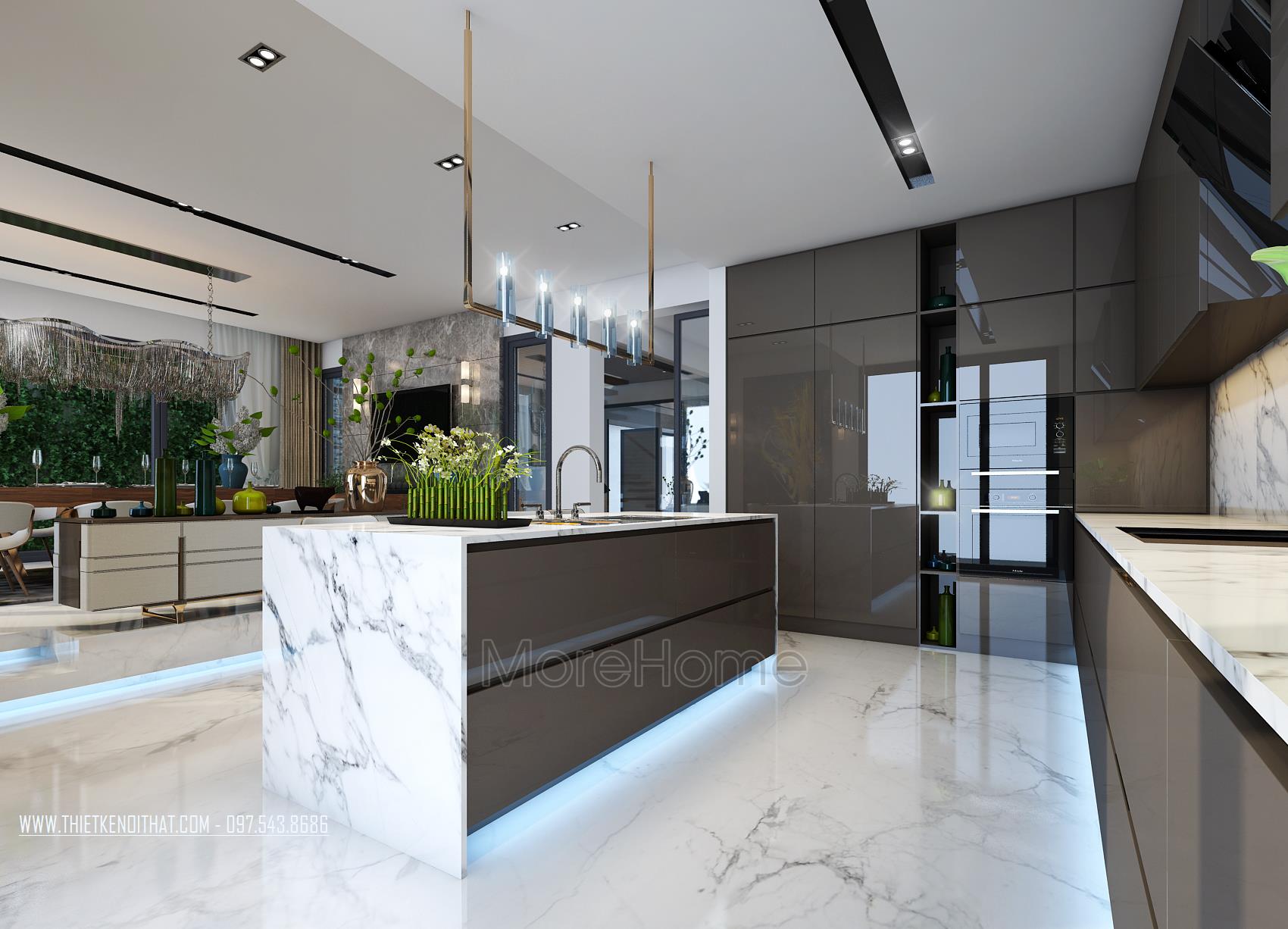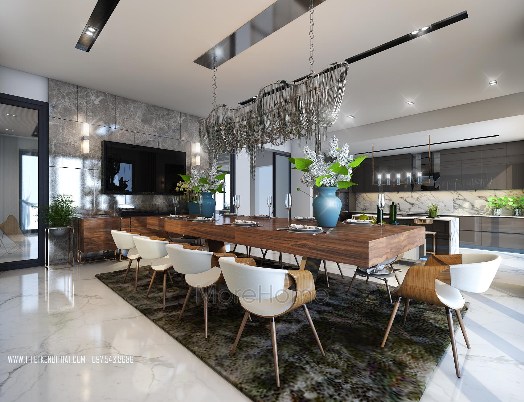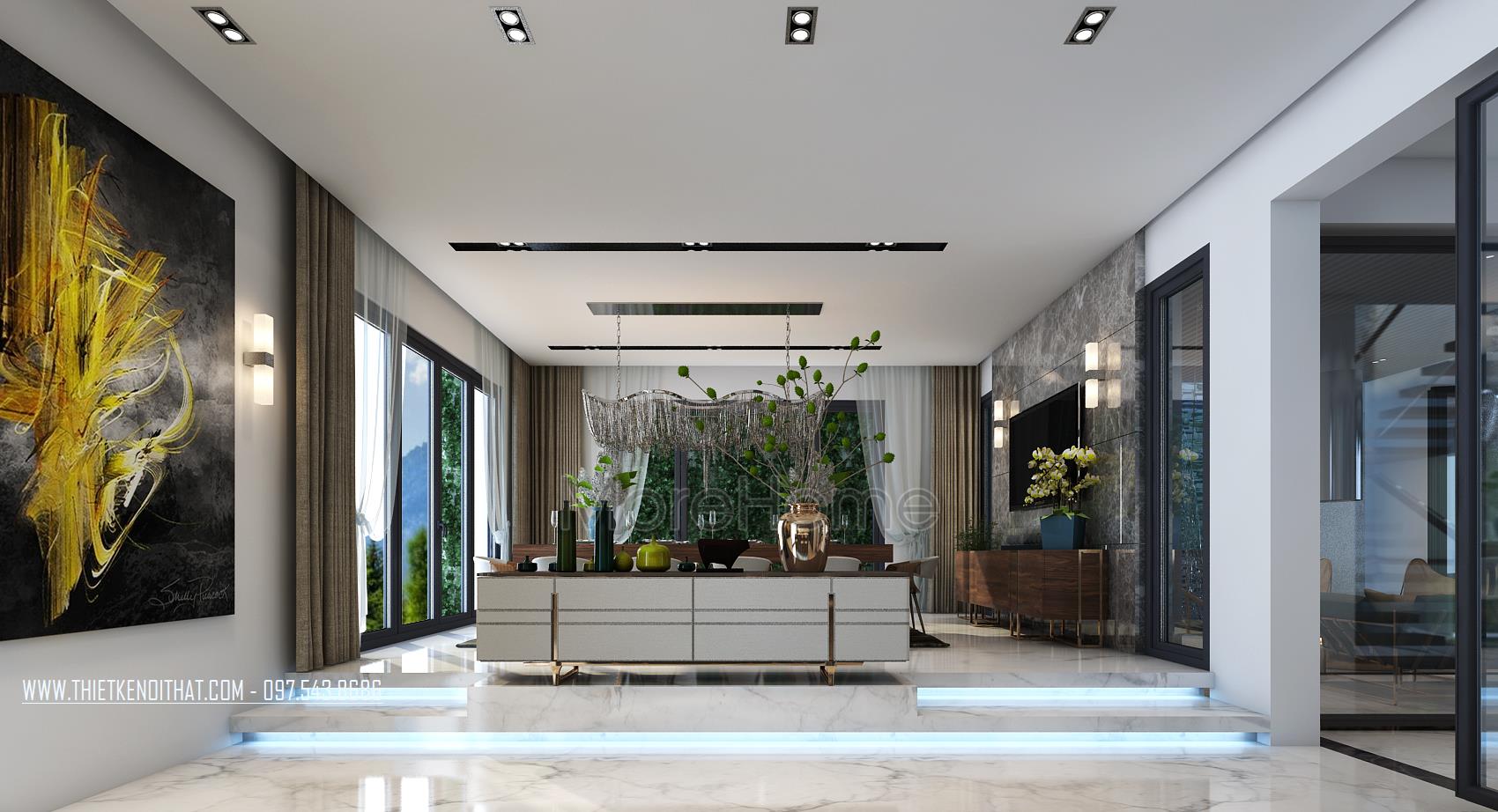 Tiếp theo là thiết kế nội thất bếp và bàn ăn hiện đại. Điểm nổi bật nhất của thiết kế này chính là sự thay đổi táo bạo và đầy mới lạ trong thiết kế bàn ăn. Thiết kế bàn ăn nổi bật và thu hút ánh nhìn bởi tính hiện đại và vô cùng mới mẻ. Không gian bàn ăn rộng rãi phù hợp với cả các bữa tiệc lớn của gia đình. Thiết kế kính cường lực trong suốt bao quanh hay đèn chùm mở chiếu sáng sáng tạo, cùng với không gian xanh ở mọi nơi là điểm nhấn đầy thu hút giúp tạo ấn tượng và truyển cảm hứng cho không gian này.