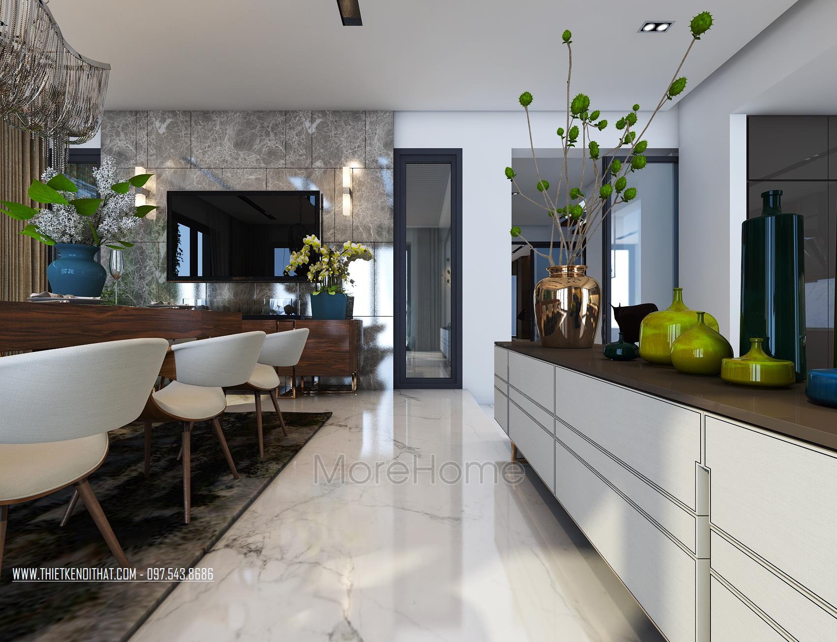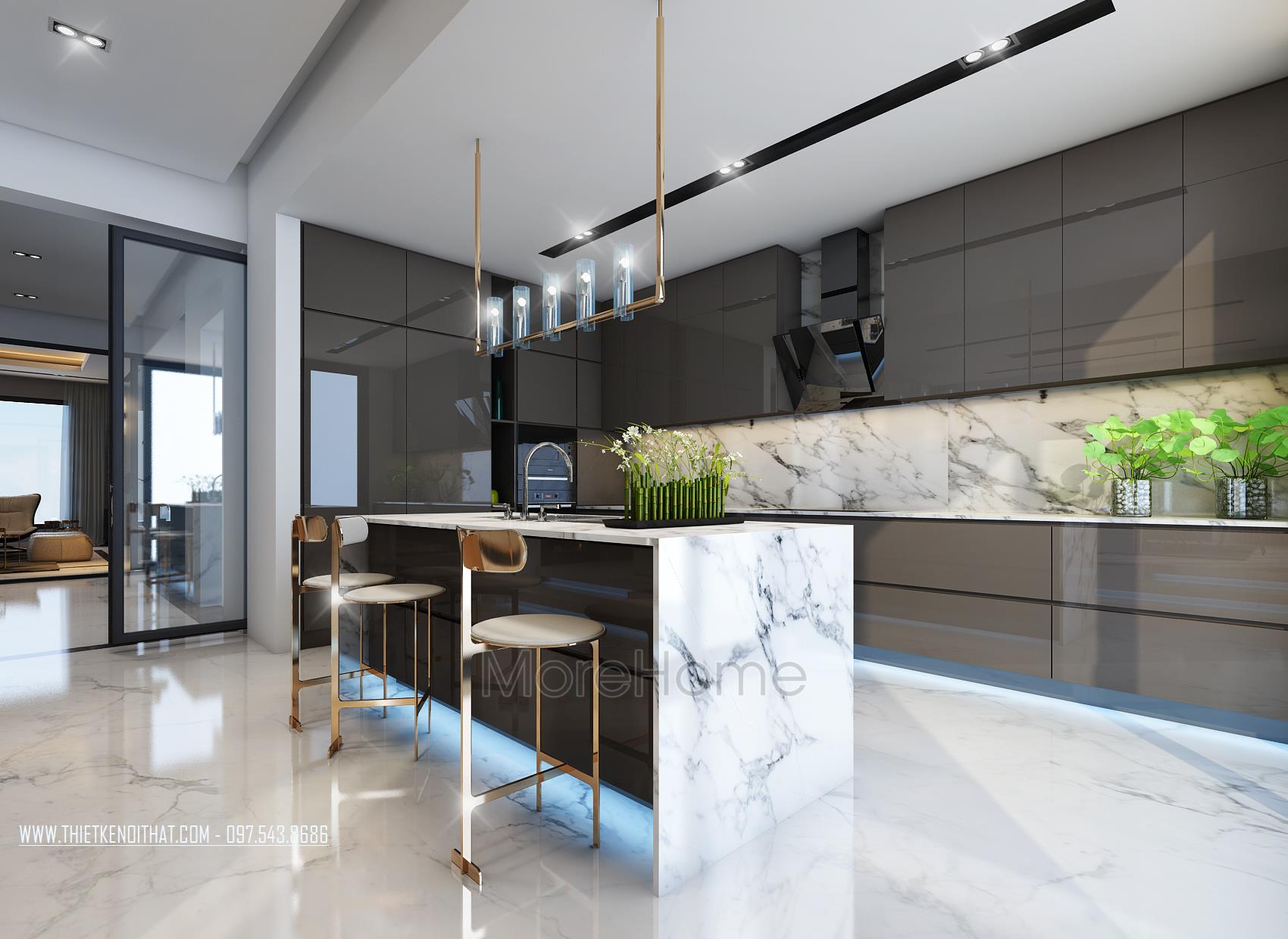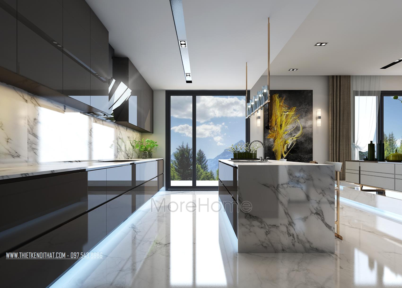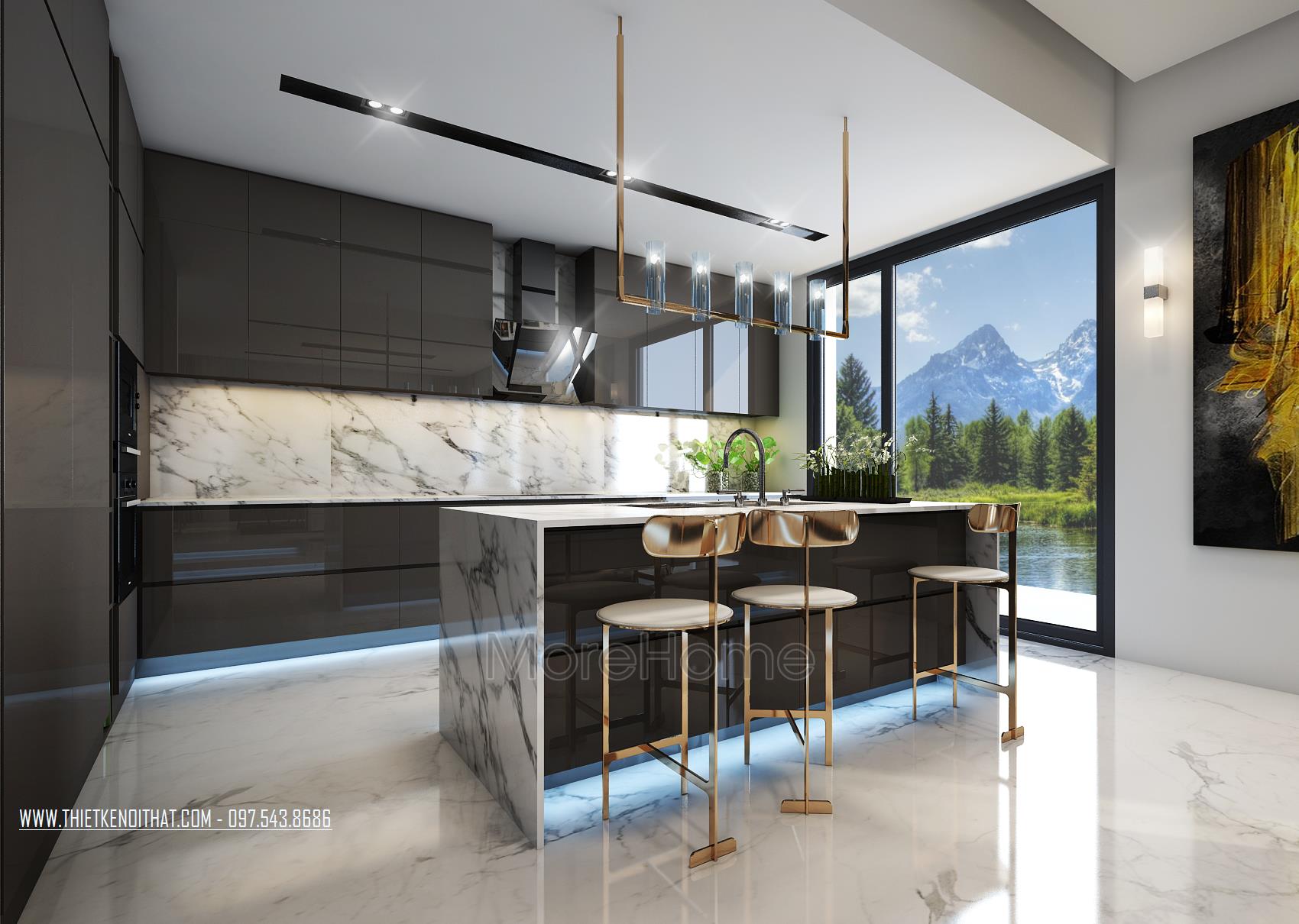 Tiếp theo là thiết kế nội thất bếp và bàn ăn hiện đại. Điểm nổi bật nhất của thiết kế này chính là sự thay đổi táo bạo và đầy mới lạ trong thiết kế bàn ăn. Thiết kế bàn ăn nổi bật và thu hút ánh nhìn bởi tính hiện đại và vô cùng mới mẻ. Không gian bàn ăn rộng rãi phù hợp với cả các bữa tiệc lớn của gia đình. Thiết kế kính cường lực trong suốt bao quanh hay đèn chùm mở chiếu sáng sáng tạo, cùng với không gian xanh ở mọi nơi là điểm nhấn đầy thu hút giúp tạo ấn tượng và truyển cảm hứng cho không gian này.