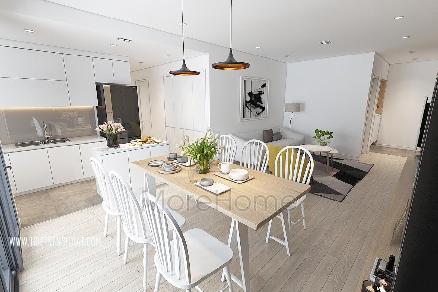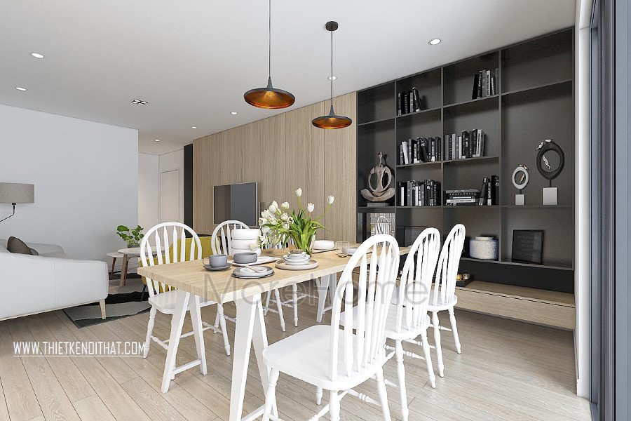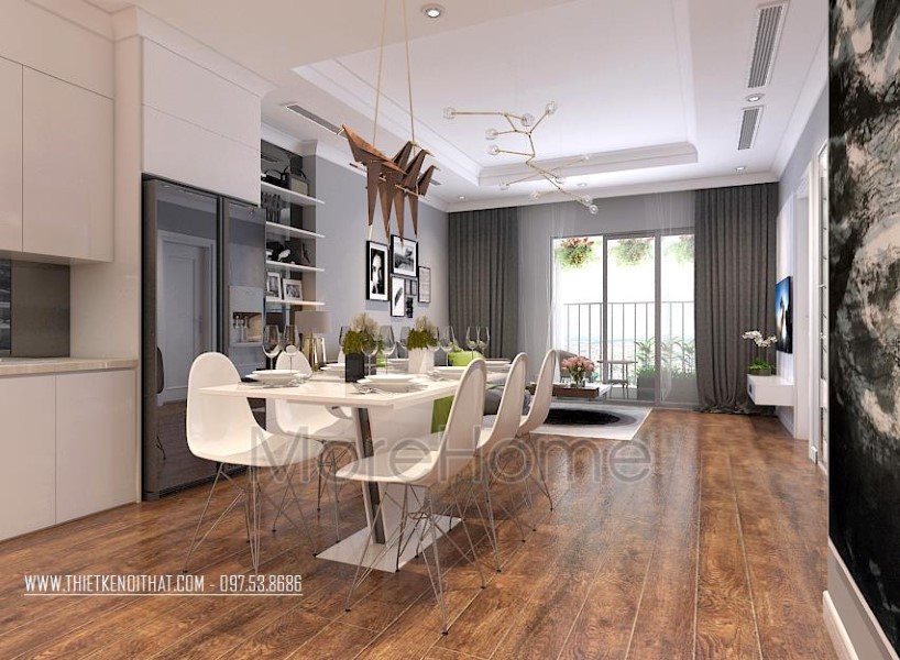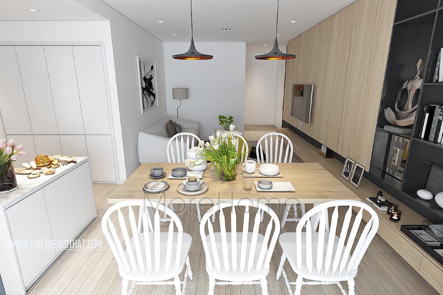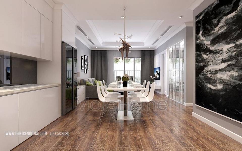 Ngay khi bước vào phòng ăn đập vào mắt chúng ta là gian bếp kết hợp phòng ăn với tủ gỗ màu trắng và bộ bàn ghế màu trắng. Tông màu trắng góp phần khiến không gian này trở nên rộng rãi, sáng sủa, thanh lịch hơn. Màu trắng cũng là một màu đặc trưng của kiểu thiết kế nội thất hiện đại.