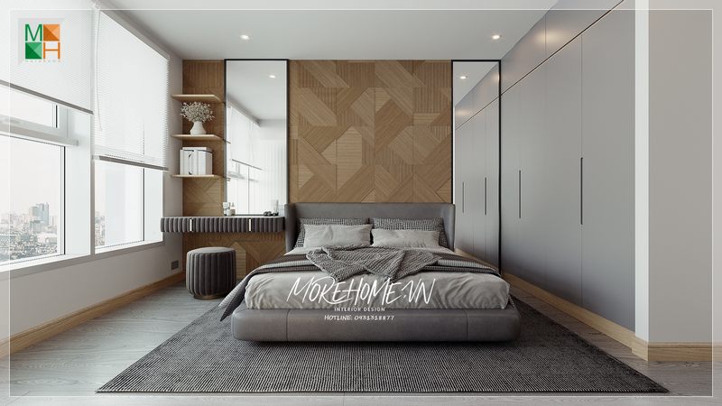 Giường ngủ màu xám kết hợp với chiếc tủ quần áo cũng tone màu tạo nên sự sang trọng và ấn tượng mỗi khi bước chân vào căn phòng.
