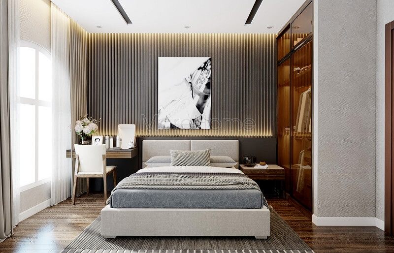 Không gian phòng ngủ master được trang trí với tone màu trắng chủ đạo, không quá nổi bật nhưng vẫn giúp tạo nên sự hút mắt.