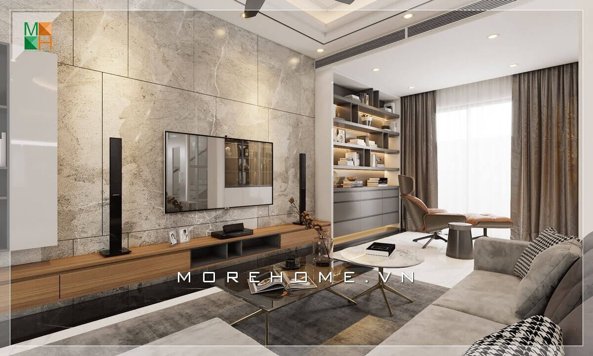 Phòng khách cho chung cư, nhà phố với thiết kế tông nâu trầm từ sàn gỗ, cửa gỗ và kệ tivi, phối với đá ốp tường nhân tạo trắng vân mây vừa đơn giản, vừa sang trọng, giúp thể hiện gu thẩm mỹ cao cấp, tinh tế của gia chủ